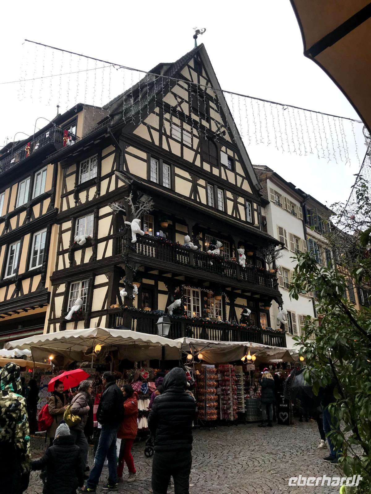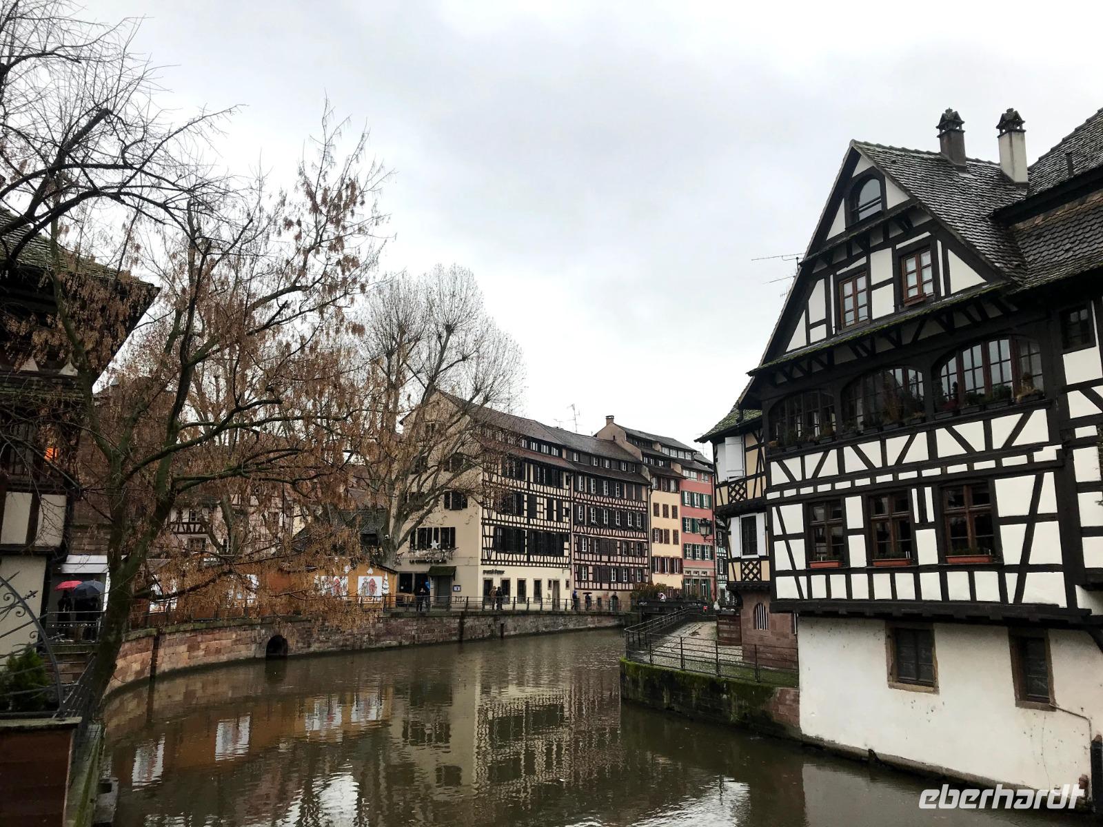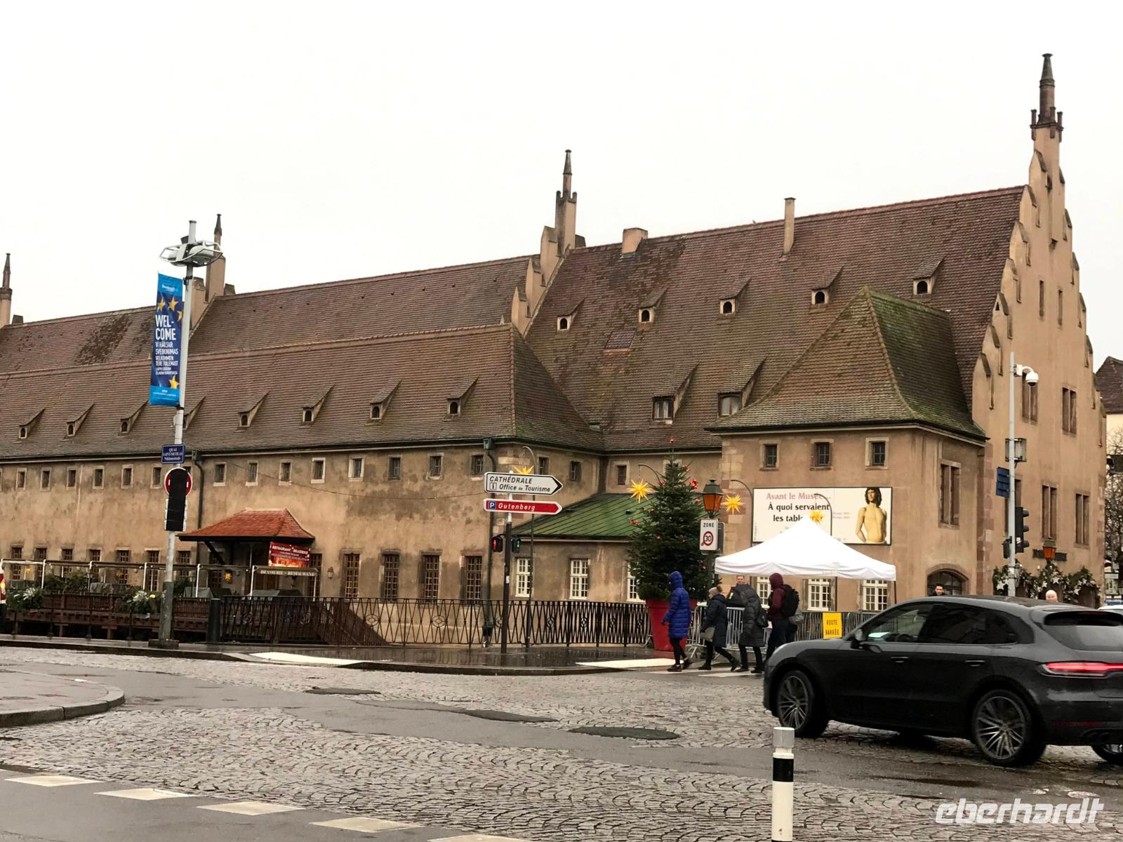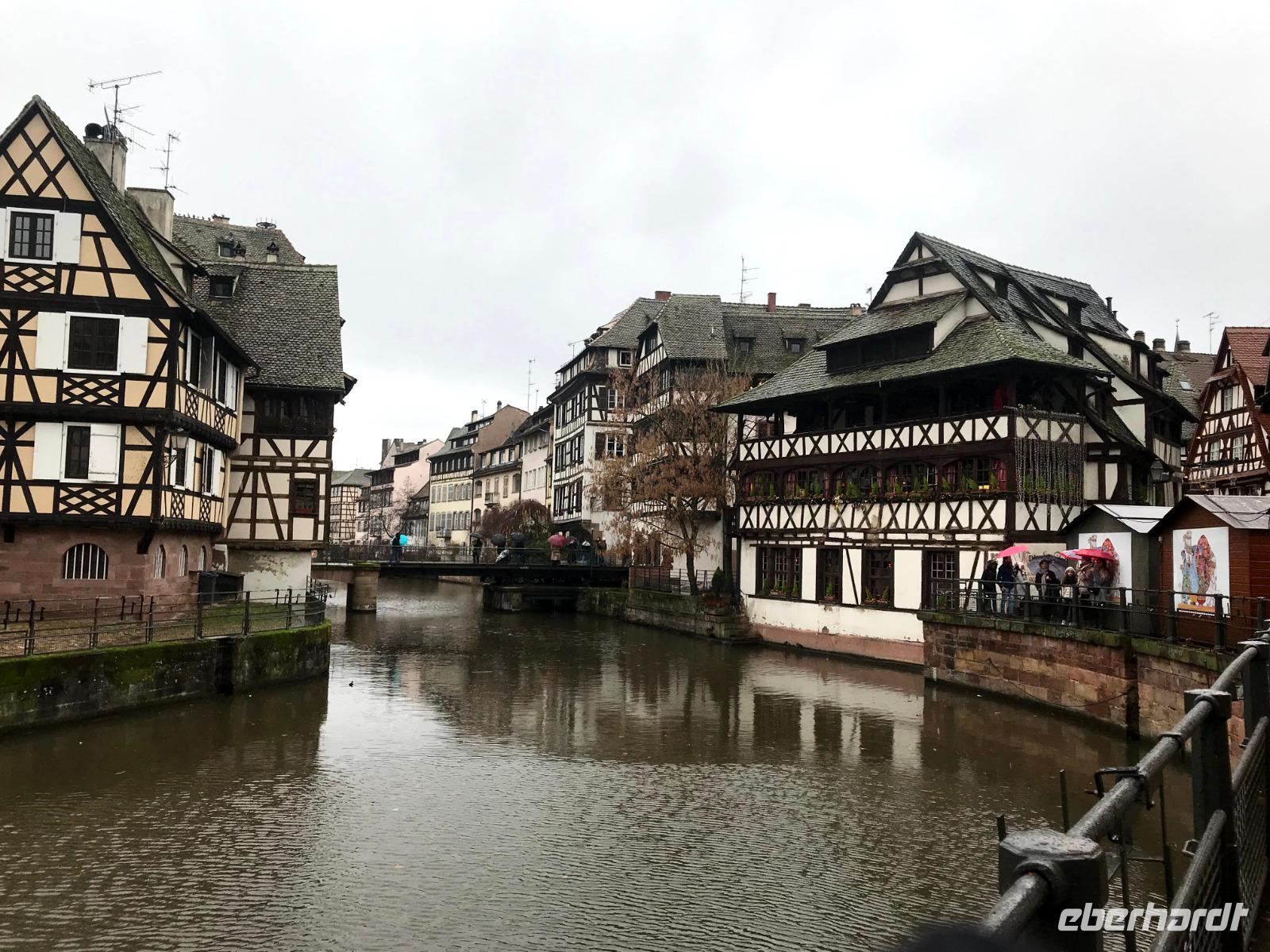 Natürlich bildet das sehenswerte gotische Münster mit seiner herrlich geschmückten Fassade den Mittelpunkt der Straßburger Altstadt! Auf dem Platz vor ihm tummelten sich trotz regnerischem Wetter auch die meisten Menschen auf dem größten der Festtagsmärkte. Hier gab es natürlich leckere Elsässer Spezialitäten und immer wieder Glühwein! Wir hatten Freizeit am Münsterplatz und auf dem Weihnachtsmarkt mit der Statue des Buchdruck-Erfinders Gutenberg, aber mit mir zogen einige Wetter-Unerschrockene noch zunächst auf einem Rundgang durch das als „Gerberviertel" bekannte Fachwerk-Areal von „Petite France". Hier gruppieren sich historische Häuser um kleinere Marktplätze, selbst zur Weihnachtszeit verkehren Ausflugsboote auf der Ill und man kann überall elsässische Spezialitäten wie etwa Flammekuchen, Sauerkraut oder „Knack" - einheimische, besonders gewürzte Knacker - probieren. Glühwein, aus Rot- oder Weißwein der Region ist natürlich ein Muss und man macht schnell die Erfahrung, dass der wirklich anders schmeckt als auf „unseren" Weihnachtsmärkten.