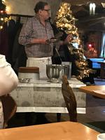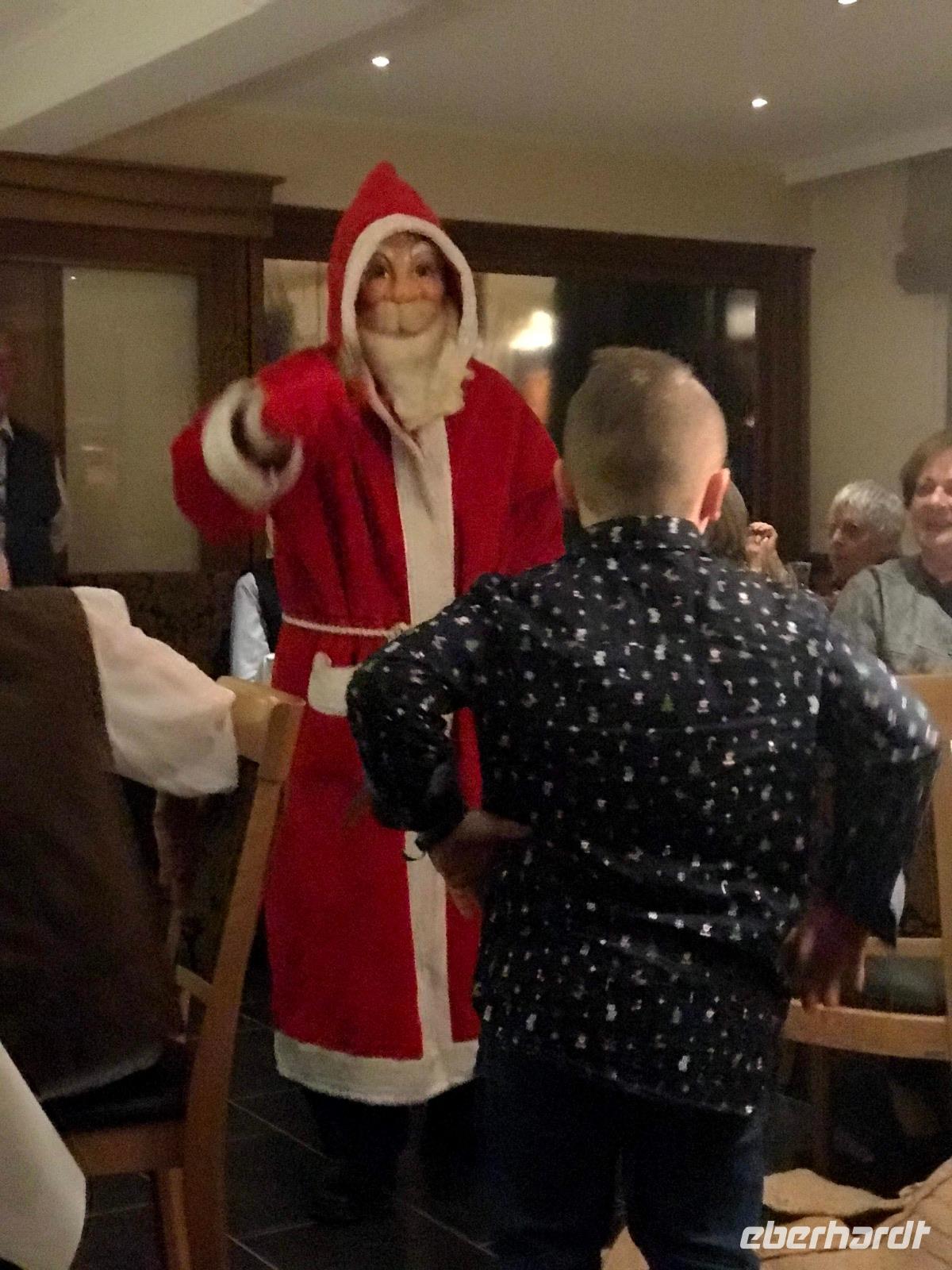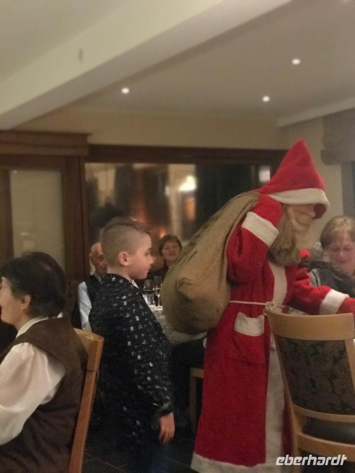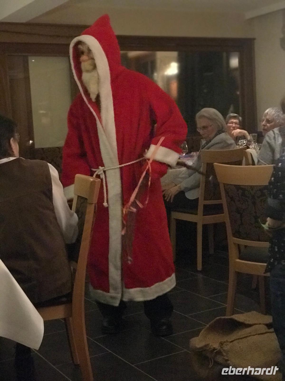 Am Nachmittag - mit Glühwein am Bus und etwas Aufregung um ein leider abhanden gekommenes Portemonnaie - ging es dann zurück nach Alpirsbach, wo alle, die es wünschten, an der Christvesper in der historischen Kirche des Klosters Alpirsbach teilnehmen konnten. Später erlebten wir dann im Hotel das mehrgängige festliche Weihnachts-Mahl, bei dem es doch zunehmend besinnlicher wurde. Eberhardt-TRAVEL hatte eine kleine Bescherung vorbereitet und danach kam als Überraschung nach dem Abendessen noch der Weihnachtsmann. Zwar war er dafür gar nicht nass genug, behauptete aber doch, draußen vom Walde herzukommen. Er hatte wohl auch eine Rute dabei und einen kleinen, lernwilligen Helfer, mit dem er an unsere Gäste kleine Geschenke vom Hotel verteilte. Mit ein paar lustigen Geschichten, vorgetragen von der Hotelwirtin und von mir, klang dann der Abend gemütlich aus.