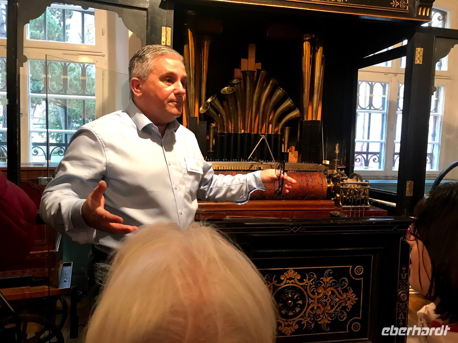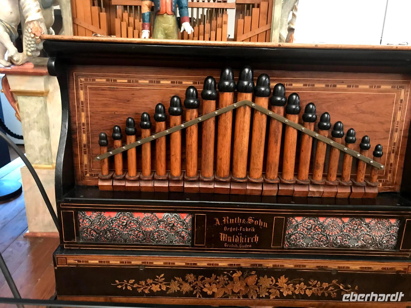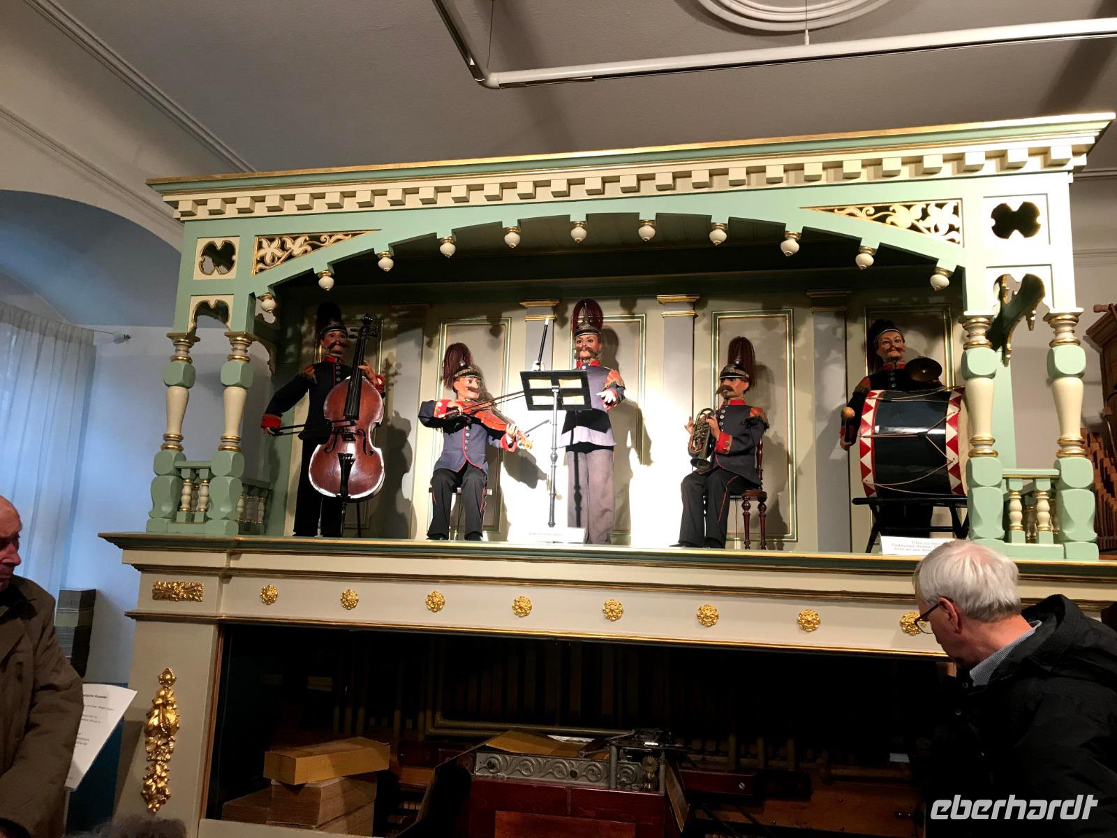 Das Programm an diesem ersten Weihnachtstag begann mit einem besonderen Höhepunkt, denn am Vormittag waren wir im Elztal-Museum in Waldkirch angemeldet. Die kleine Stadt im südlichen Schwarzwald, am Rheinzufluss Elz, besaß einst einen besonderen Ruf als Stadt der Uhrmacher, später einen Weltruf im Bau von Drehorgeln und Musikautomaten. Deren Produktion, begründet 1799 von Matthias Martin, hatte danach große Bedeutung für die Region und der Orgelbau wird bis heute von verschiedenen Firmen weiter geführt. Im Museum neben der Kirche gibt es eine beeindruckende Präsentation von Musikautomaten. Ein Mitarbeiter, Cedric, führte uns voller Leidenschaft und mit sehr viel auf uns übertragenen Enthusiasmus einige der hervorragend funktionierenden Flötenuhren, Dreh- und Strassenorgeln vor. Wir lernten - geräuschvoll, vergnügt und auch unerwarteterweise - wieviel derartige Musikautomaten zur Verbreitung von Musikkultur - auch klassischer Musik - beigetragen haben.