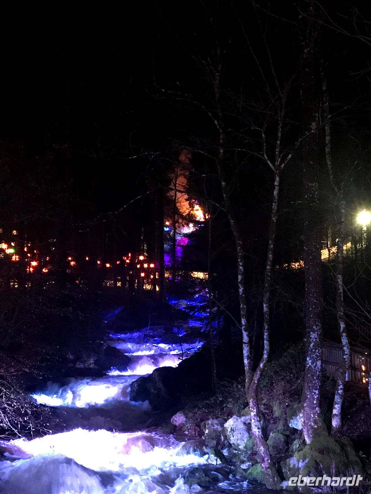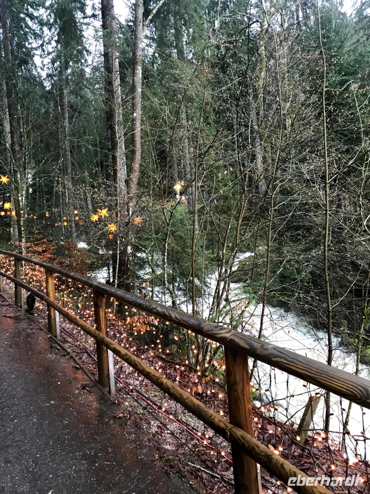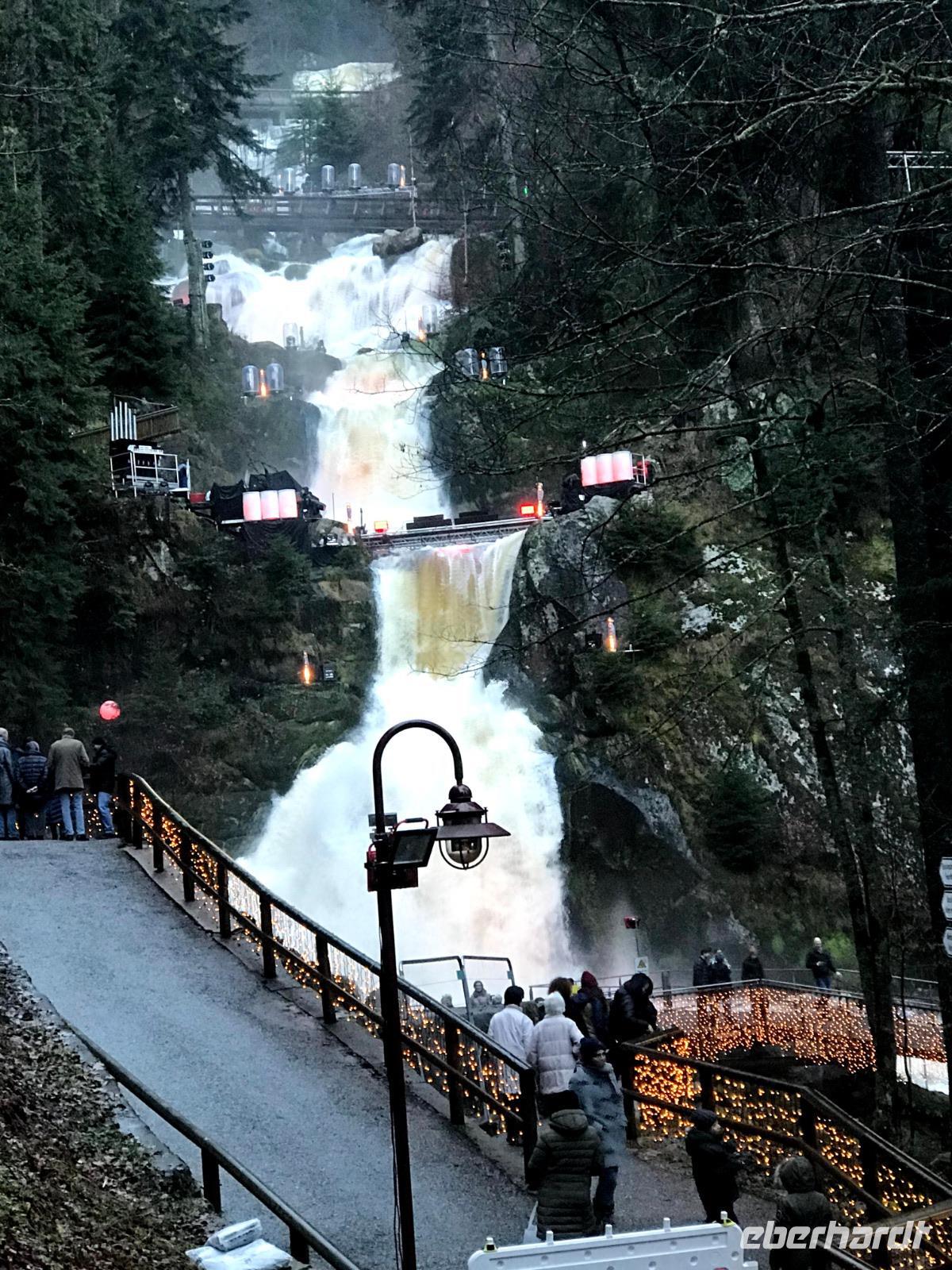 Wir konnten das vielleicht größte Festtags-Spektakel im Schwarzwald, den „Triberger Weihnachtszauber" direkt nach Zahlung des Eintritts nur wenige Schritte nach Verlassen des Lilie"-Hotel-genießen, denn hier befand sich der Haupteingang zur unterhalb des höchsten Wasserfalls Deutschlands inszenierten Lichter-Show. Das eigentlich sonst vorwiegend für Wanderer und Landschaftskenner bekannte Naturschauspiel der Wasserfälle wuchs über die Jahre zu einer der größten Attraktionen der Ferienregion Schwarzwald an. Fast wie ein „Ausnahmezustand" über dem kleinen Schwarzwaldort sorgten Straßensperrungen, Leitsystem und Einweiser - aber auch jede Menge Glühweinbuden, Imbisse, Fahrgeschäften etc. für eine erwartungsvolle Grundstimmung. Wir trafen zumindest jede Menge gutgelaunter Menschen, die diese fast eine Million Lichter und eine um 17.30 Uhr anberaumte grandiose Feuer-Show genießen wollten! Das alles sorgte dann für ein wirklich nachhaltiges Erlebnis, das man sonst so allgemein zu Weihnachten nicht erwartet, das aber allen Spaß gemacht hat.