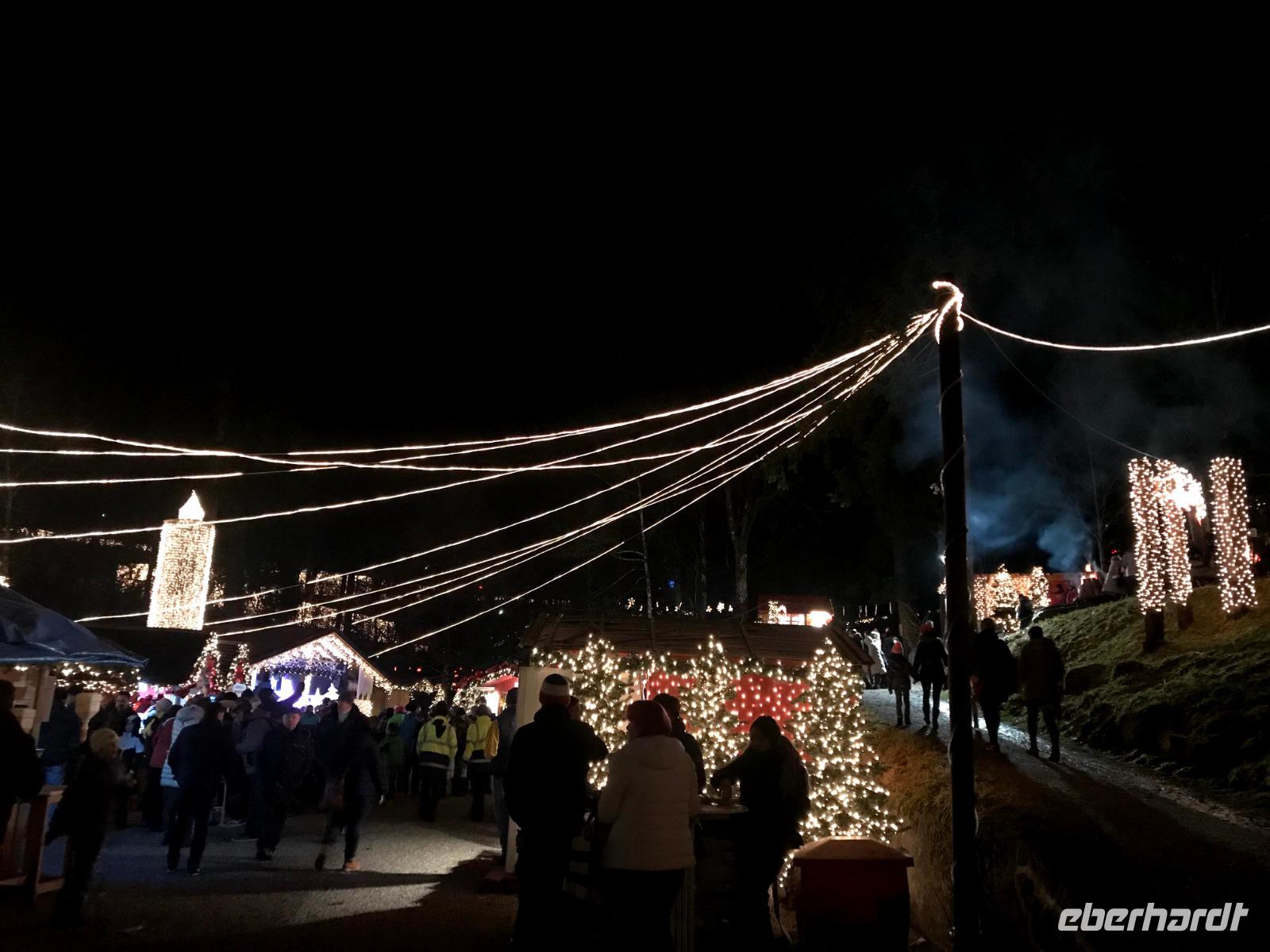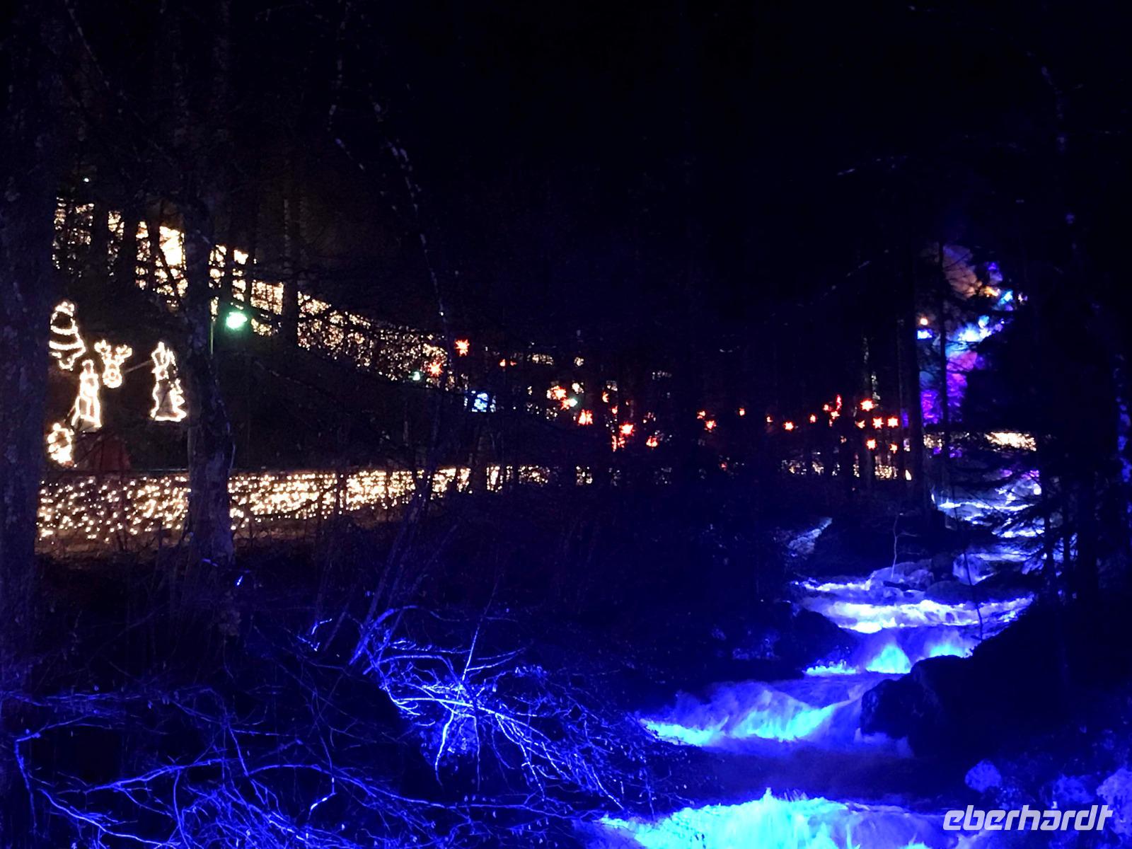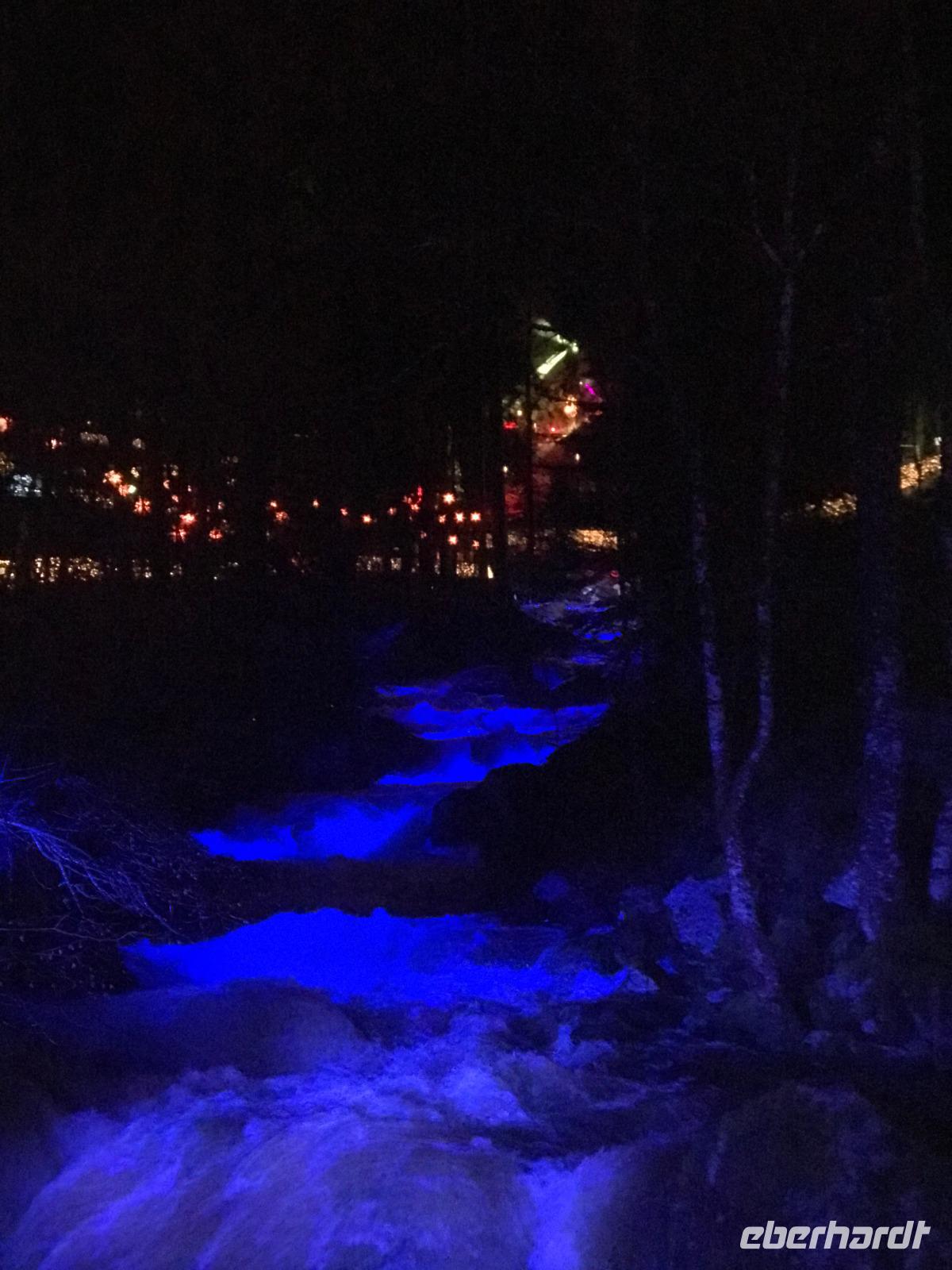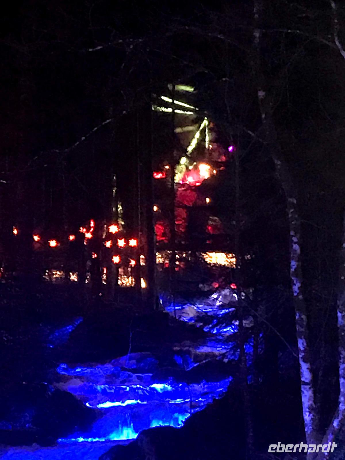 Wir konnten das vielleicht größte Festtags-Spektakel im Schwarzwald, den „Triberger Weihnachtszauber" direkt nach Zahlung des Eintritts nur wenige Schritte nach Verlassen des Lilie"-Hotel-genießen, denn hier befand sich der Haupteingang zur unterhalb des höchsten Wasserfalls Deutschlands inszenierten Lichter-Show. Das eigentlich sonst vorwiegend für Wanderer und Landschaftskenner bekannte Naturschauspiel der Wasserfälle wuchs über die Jahre zu einer der größten Attraktionen der Ferienregion Schwarzwald an. Fast wie ein „Ausnahmezustand" über dem kleinen Schwarzwaldort sorgten Straßensperrungen, Leitsystem und Einweiser - aber auch jede Menge Glühweinbuden, Imbisse, Fahrgeschäften etc. für eine erwartungsvolle Grundstimmung. Wir trafen zumindest jede Menge gutgelaunter Menschen, die diese fast eine Million Lichter und eine um 17.30 Uhr anberaumte grandiose Feuer-Show genießen wollten! Das alles sorgte dann für ein wirklich nachhaltiges Erlebnis, das man sonst so allgemein zu Weihnachten nicht erwartet, das aber allen Spaß gemacht hat.
