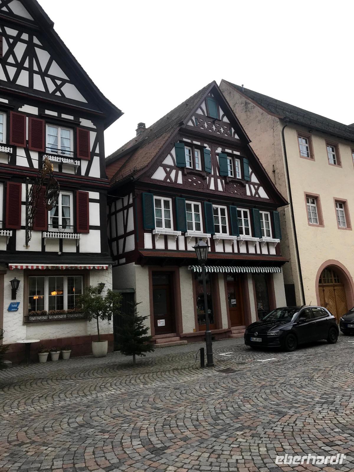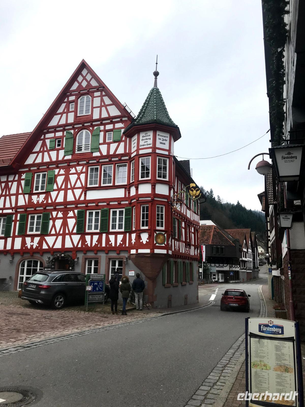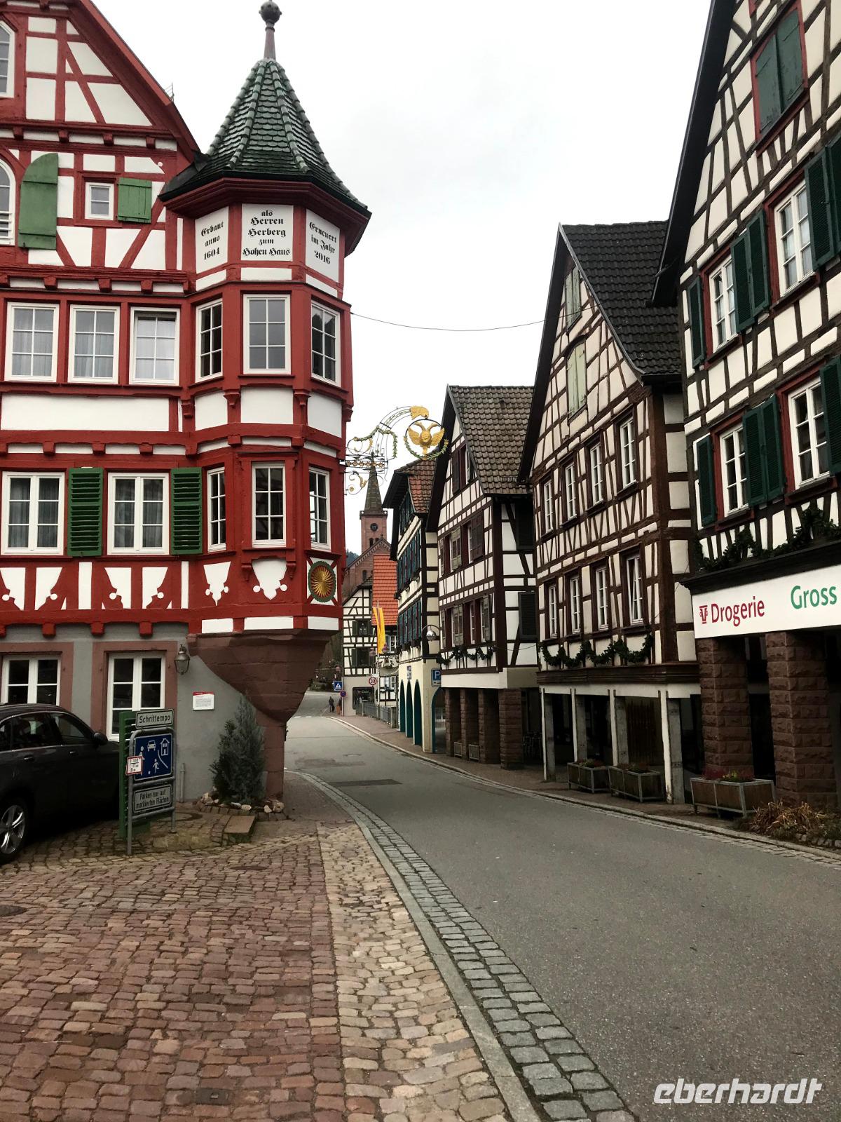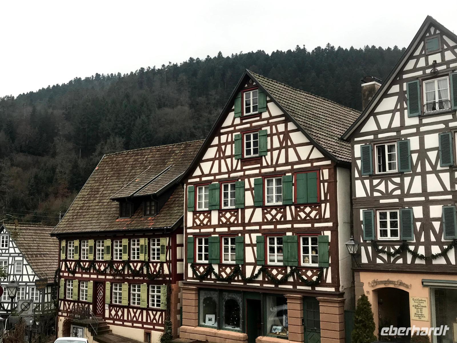 Am zweiten Weihnachtsfeiertag brachen wir mit allen Interessierten zu einem kleinen Extra auf, einem „Eberhardt-Richtig-Reisen-Abstecher" mit einem Besuch auf der „Deutschen Fachwerkstraße". Über 700 km lang und mit mehr als 100 Mitgliedsorten, weist sie die größte Häufung an Fachwerkbauten in Deutschland auf. Der Ausflug war aber sozusagen „freiwillig", wer wollte, durfte auch ausschlafen! Dennoch hatten wir dreißig interessierte Mitreisende im Bus, als wir von Alpirsbach zunächst ins hübsche Städtchen Schiltach fuhren. Schon seit Anfang der 70er Jahre des 20. Jh. steht die Altstadt als Bauensemble unter Denkmalschutz. Hier gibt es zahlreiche historische Häuser, aber die schönsten Fachwerkbauten des Ortes sieht man am dreieckigen, abschüssigen Marktplatz der - beherrscht von seinem alten Renaissance-Rathaus - noch mittelalterliches Flair aufweist. Auch das nahegelegene Wolfach bietet ein hübsches Stadtbild, in dem sowohl das Schloss als auch das bemalte Rathaus, letzteres im Stil der Neorenaissance, dominieren. Das Schloss, der Marktstraße vorgelagert, bezieht noch Teile der ehemaligen Stadtbefestigung, beispielsweise ein Stadttor in seinem Südflügel, ein und gehört zu den größten Gebäudekomplexen im Schwarzwald.