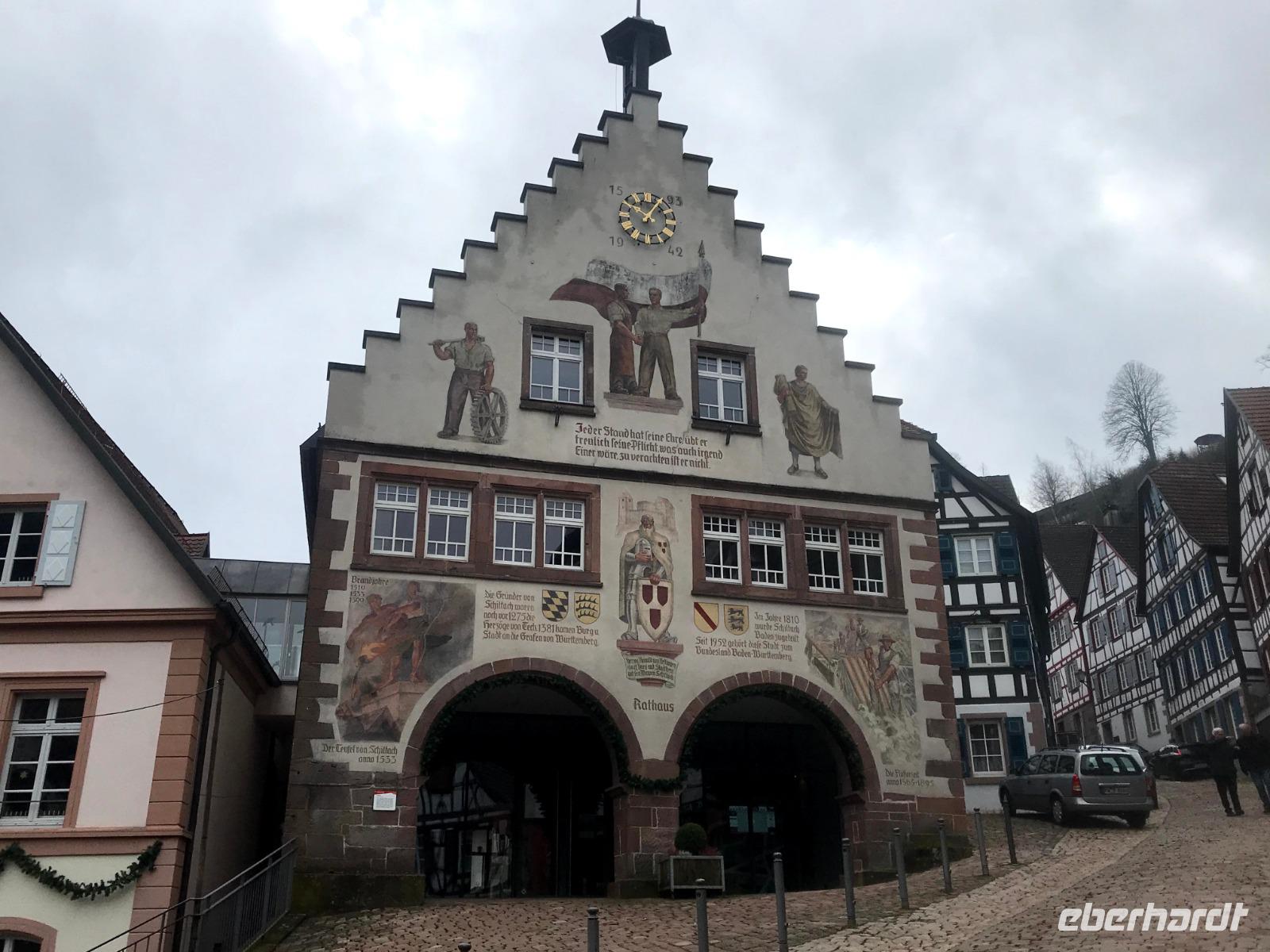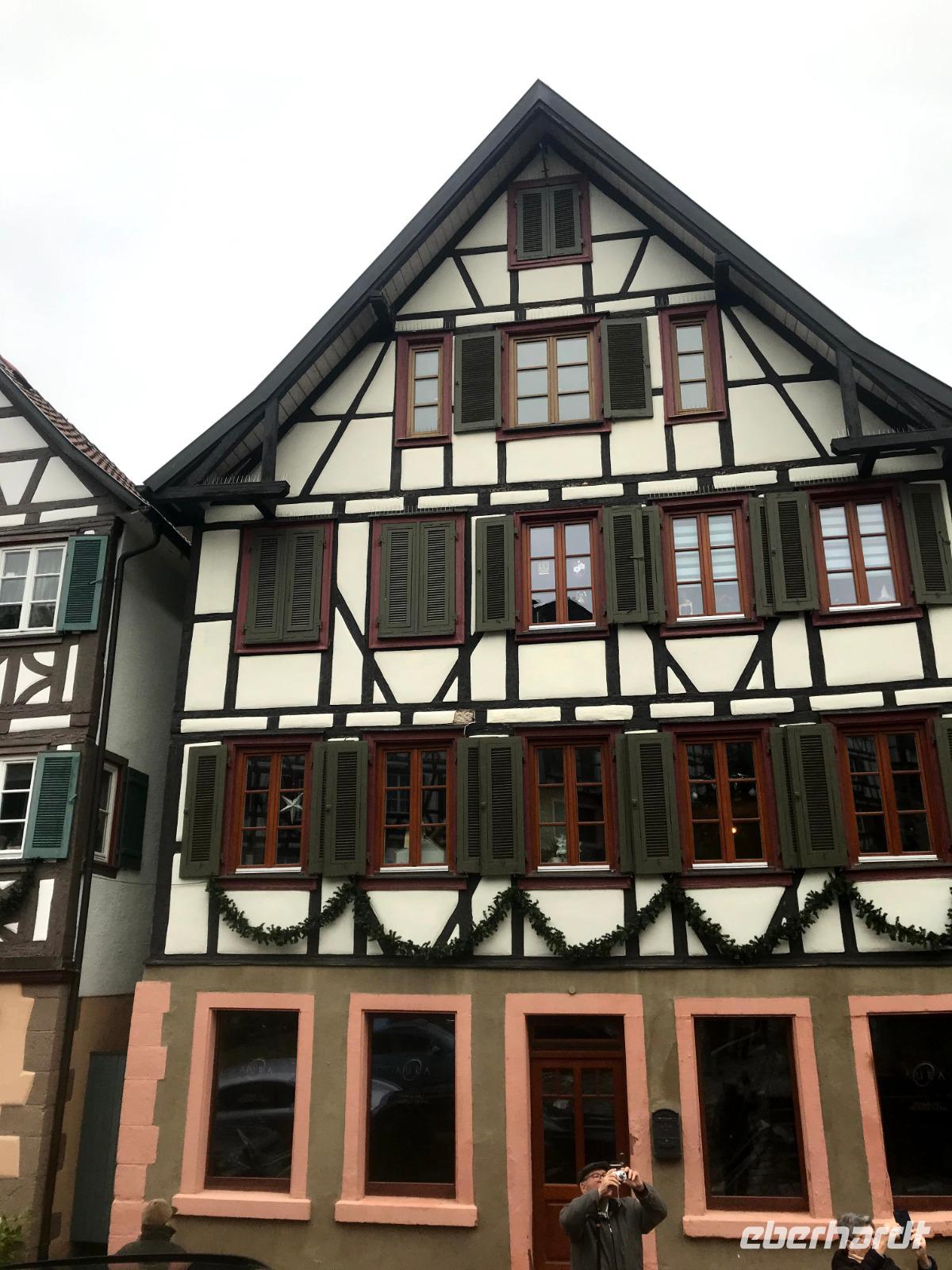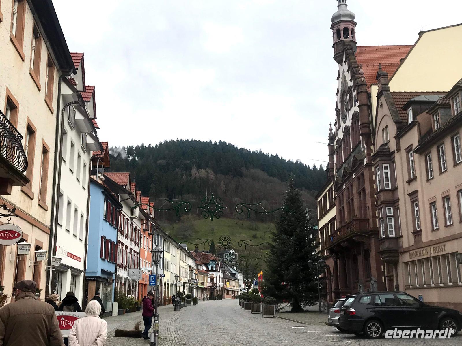 Am zweiten Weihnachtsfeiertag brachen wir mit allen Interessierten zu einem kleinen Extra auf, einem „Eberhardt-Richtig-Reisen-Abstecher" mit einem Besuch auf der „Deutschen Fachwerkstraße". Über 700 km lang und mit mehr als 100 Mitgliedsorten, weist sie die größte Häufung an Fachwerkbauten in Deutschland auf. Der Ausflug war aber sozusagen „freiwillig", wer wollte, durfte auch ausschlafen! Dennoch hatten wir dreißig interessierte Mitreisende im Bus, als wir von Alpirsbach zunächst ins hübsche Städtchen Schiltach fuhren. Schon seit Anfang der 70er Jahre des 20. Jh. steht die Altstadt als Bauensemble unter Denkmalschutz. Hier gibt es zahlreiche historische Häuser, aber die schönsten Fachwerkbauten des Ortes sieht man am dreieckigen, abschüssigen Marktplatz der - beherrscht von seinem alten Renaissance-Rathaus - noch mittelalterliches Flair aufweist. Auch das nahegelegene Wolfach bietet ein hübsches Stadtbild, in dem sowohl das Schloss als auch das bemalte Rathaus, letzteres im Stil der Neorenaissance, dominieren. Das Schloss, der Marktstraße vorgelagert, bezieht noch Teile der ehemaligen Stadtbefestigung, beispielsweise ein Stadttor in seinem Südflügel, ein und gehört zu den größten Gebäudekomplexen im Schwarzwald.