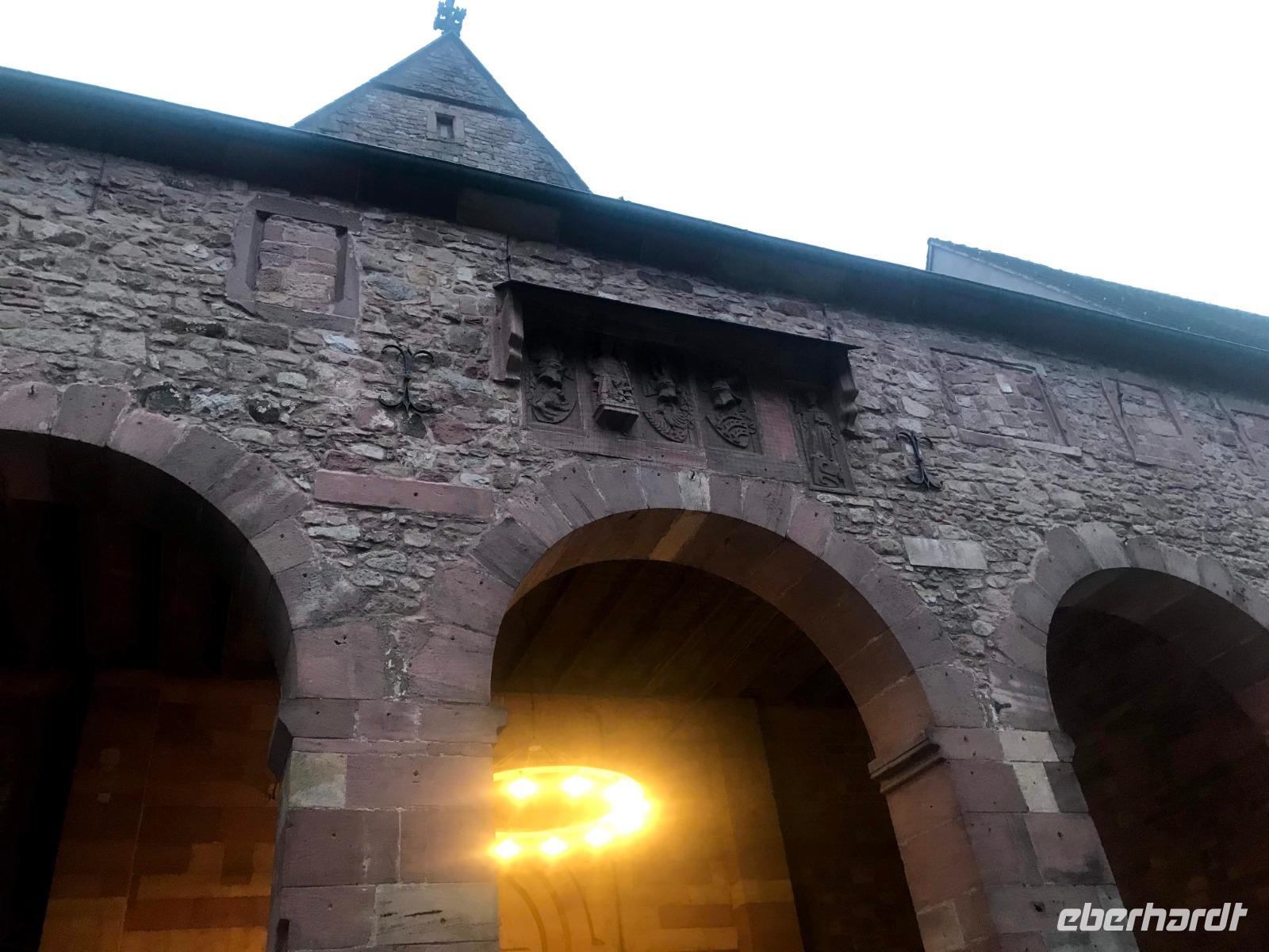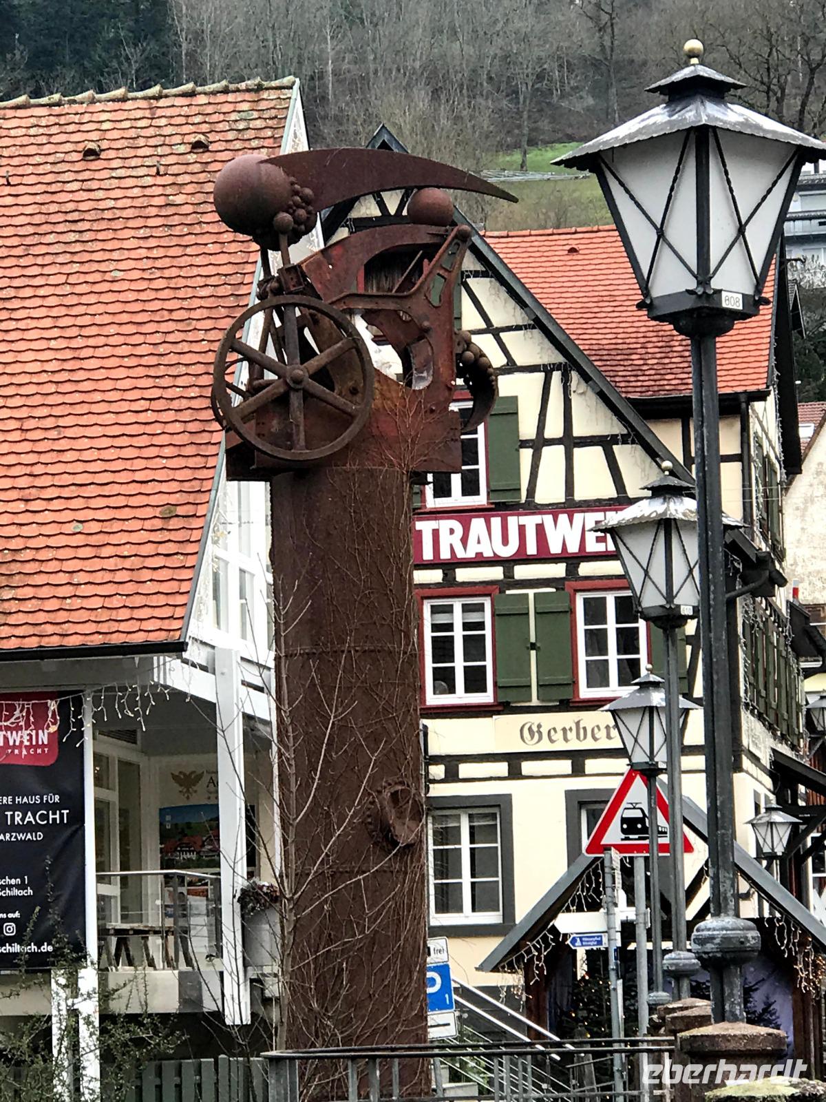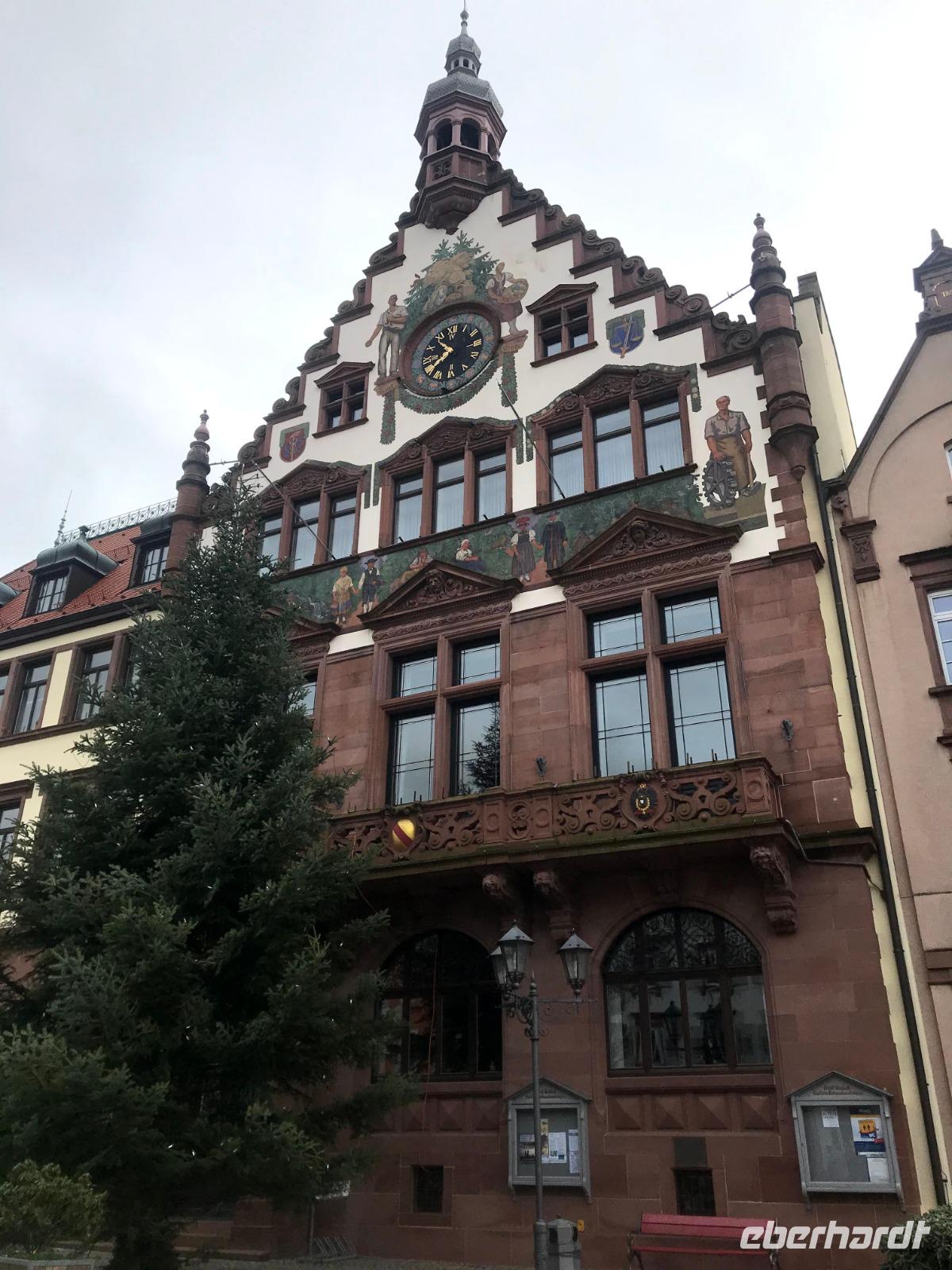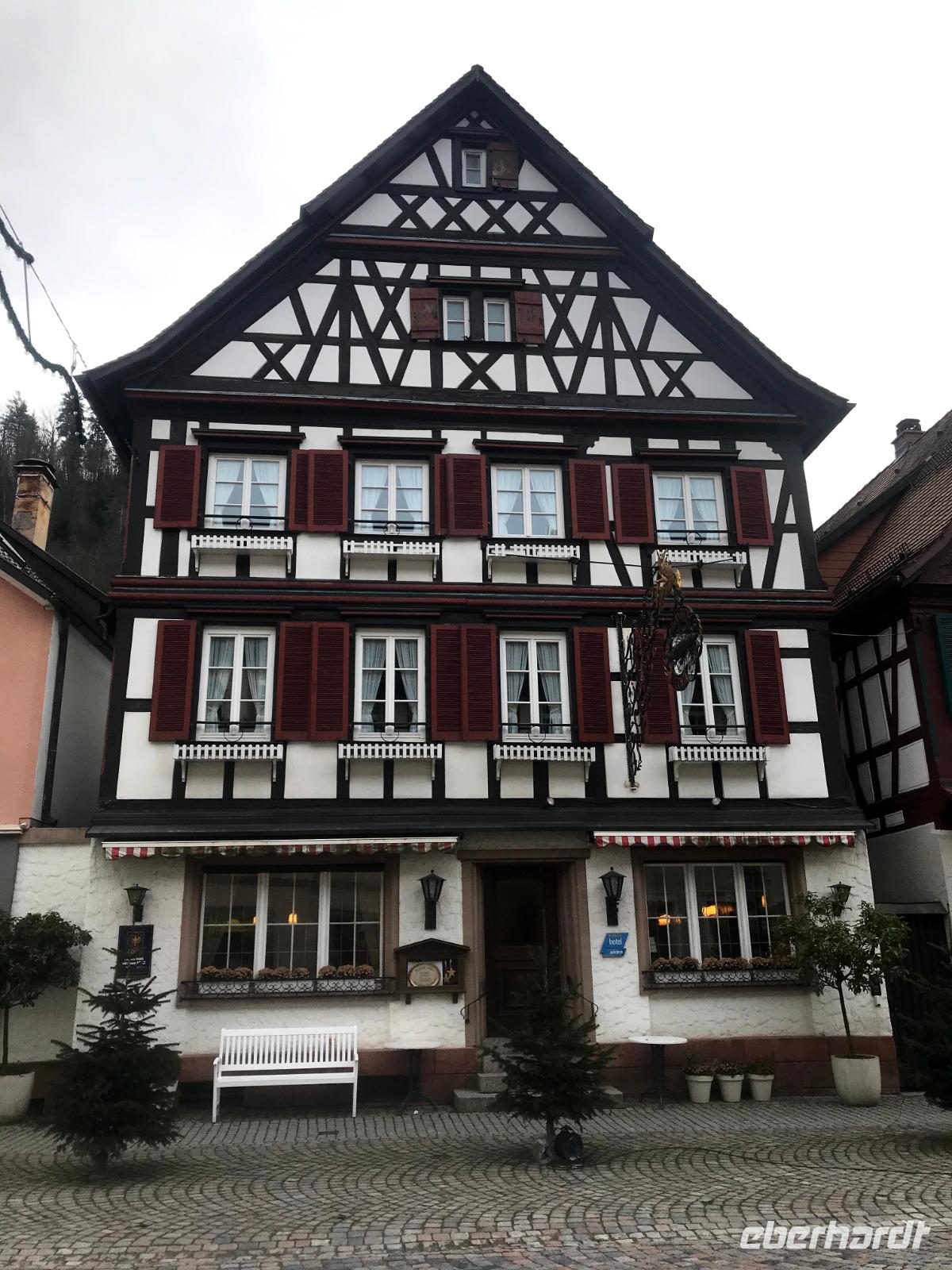 Am zweiten Weihnachtsfeiertag brachen wir mit allen Interessierten zu einem kleinen Extra auf, einem „Eberhardt-Richtig-Reisen-Abstecher" mit einem Besuch auf der „Deutschen Fachwerkstraße". Über 700 km lang und mit mehr als 100 Mitgliedsorten, weist sie die größte Häufung an Fachwerkbauten in Deutschland auf. Der Ausflug war aber sozusagen „freiwillig", wer wollte, durfte auch ausschlafen! Dennoch hatten wir dreißig interessierte Mitreisende im Bus, als wir von Alpirsbach zunächst ins hübsche Städtchen Schiltach fuhren. Schon seit Anfang der 70er Jahre des 20. Jh. steht die Altstadt als Bauensemble unter Denkmalschutz. Hier gibt es zahlreiche historische Häuser, aber die schönsten Fachwerkbauten des Ortes sieht man am dreieckigen, abschüssigen Marktplatz der - beherrscht von seinem alten Renaissance-Rathaus - noch mittelalterliches Flair aufweist. Auch das nahegelegene Wolfach bietet ein hübsches Stadtbild, in dem sowohl das Schloss als auch das bemalte Rathaus, letzteres im Stil der Neorenaissance, dominieren. Das Schloss, der Marktstraße vorgelagert, bezieht noch Teile der ehemaligen Stadtbefestigung, beispielsweise ein Stadttor in seinem Südflügel, ein und gehört zu den größten Gebäudekomplexen im Schwarzwald.