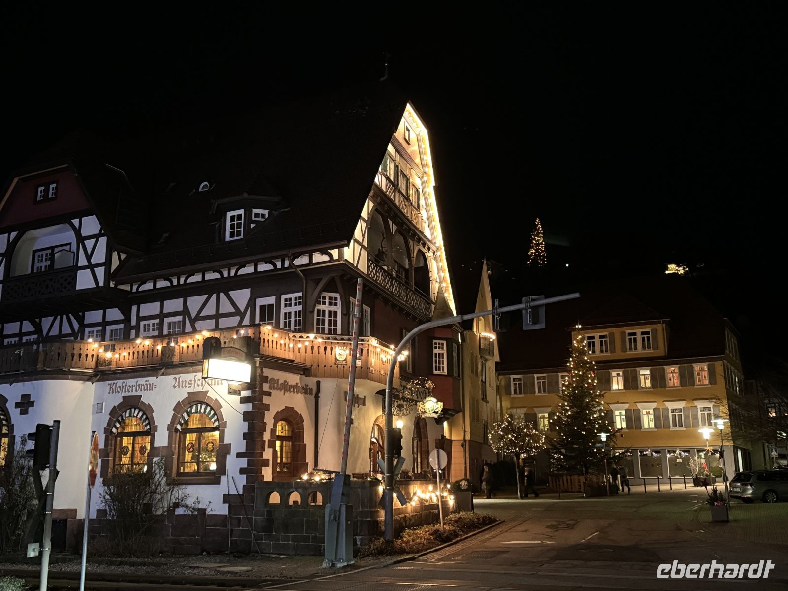 Am Morgen starteten wir unsere gemütliche Weihnachtsreise in den Schwarzwald vom Dresdner Flughafen aus. Die Fahrt nach Baden-Württemberg führ uns durch Sachsen und den Freistaat Bayern und hätte aufregender gar nicht sein können, denn der Wettergott stellt uns bereits am ersten Tag mächtig auf die Probe. Von Schnee, Schneeregen, Regen und Sturm ist einfach alles dabei und während wir die ganze Fahrt über nur hoffen, dass uns solch ein Wetter in den nächsten Tagen erspart bleibt, lenkt unser Busfahrer Uwe seinen Bus souverän durch alle Wetterlagen. Am späten Nachmittag erreichen wir Pforzheim, das Tor zum Schwarzwald. Hier steigen weitere Gäste zu, um unsere Gruppe zu vervollständigen. Dass wir dem Schwarzwald immer näher kommen merken wir, als wir die Stadt wieder verlassen, denn unmittelbar danach tauchen wir auch schon in die dunklen Wälder ein. Unser Weg führt uns nach Alpirsbach im Kinzigtal, wo wir am Abend, etwas erschöpft vom ersten Tag, unser familiär geführtes Hotel „Rössle“ erreichen. Wir werden bereits erwartet und herzlich mit einem kleinen Sektempfang von der Hotelchefin persönlich begrüßt und können auch so gleich unsere gemütlichen Zimmer beziehen. Anschließend treffen wir uns im Restaurant wieder und lassen diesen ersten Tag beim gemeinsamen Abendessen gemütlich ausklingen.