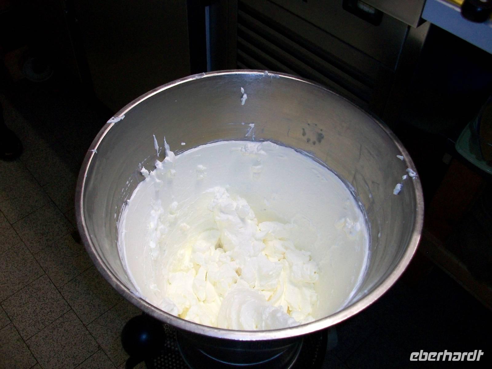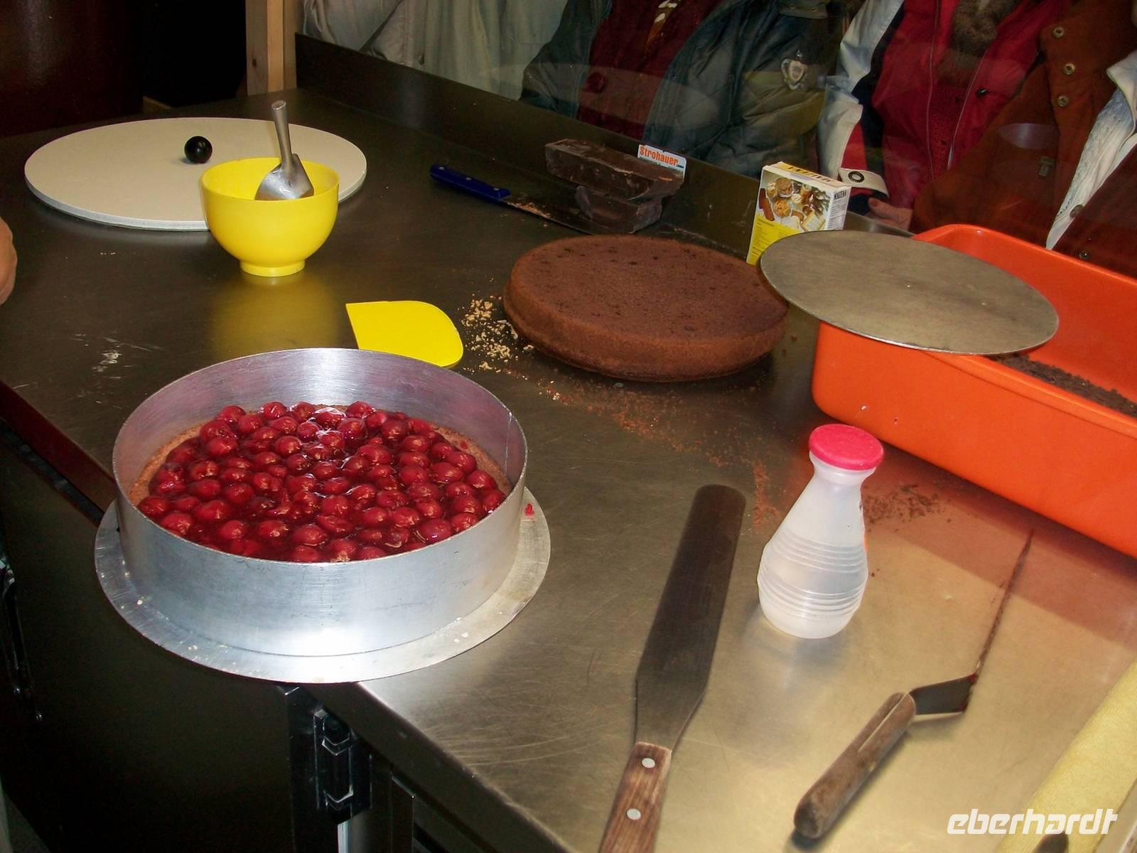 Unsere Reisegruppe hat sich im großen Raum eingefunden in dem uns in wenigen Augenblicken die Entstehung einer großen Köstlichkeit gezeigt werden wird. Erwartungsvoll harren wir den Dingen die nun kommen werden. Wir sind im Café „zum g'scheiten Beck" in Bärental zu Gast, bald kommt die Chefin persönlich und zeigt uns in wenigen Minuten wie schnell man eine Schwarzwälder Kirschtorte zubereitet, vorausgesetzt man hat solch geschickte Hände! Zuerst wird Sahne geschlagen, das läuft nebenher in einer Maschine ab; zu gleicher Zeit wird ein Biskuitboden in drei Teile geschnitten, schon das erfordert große Fingerfertigkeit. Dieser Boden wird dann mit dem unentbehrlichen Kirschwasser beträufelt und im Anschluss nimmt die Torte mit ihren Bestandteilen Schlagsahne und Sauerkirschen unter den geschickten Händen der Konditorin schnell Gestalt an. Zum Schluss wird noch mit Schokoraspeln, Schlagsahnehäubchen und Süßkirchen dekoriert und schon ist alles fertig.