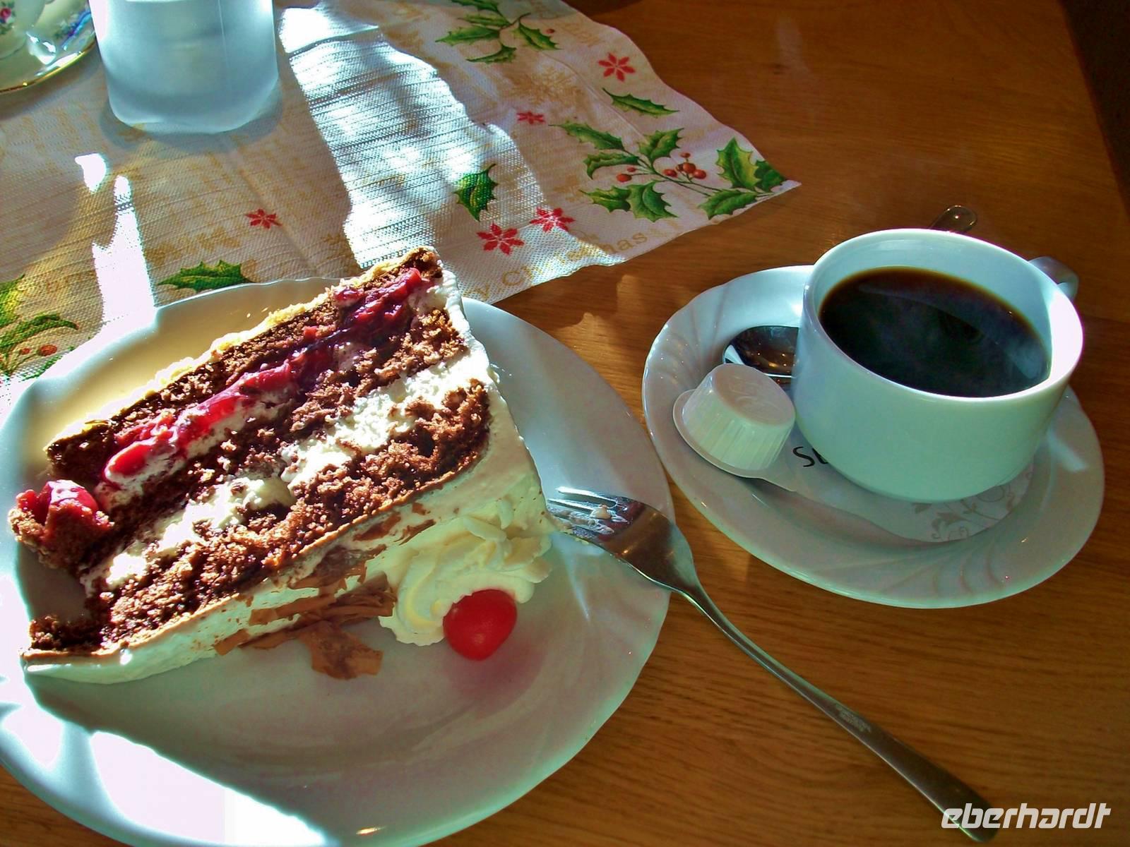 Das hat uns nun richtig Appetit gemacht und im schön eingerichteten Café eine Etage höher werden wir nun auch die eben entstandene Torte bei einer Tasse Kaffee genießen können. Draußen ist die sonnendurchflutete Winterlandschaft zu sehen, der Gastraum ist gut beheizt uns somit wird dieser Nachmittag zum Hochgenuss der uns die Unbill am Feldberg vergessen lässt.