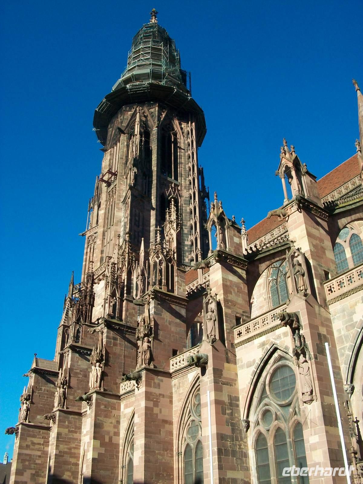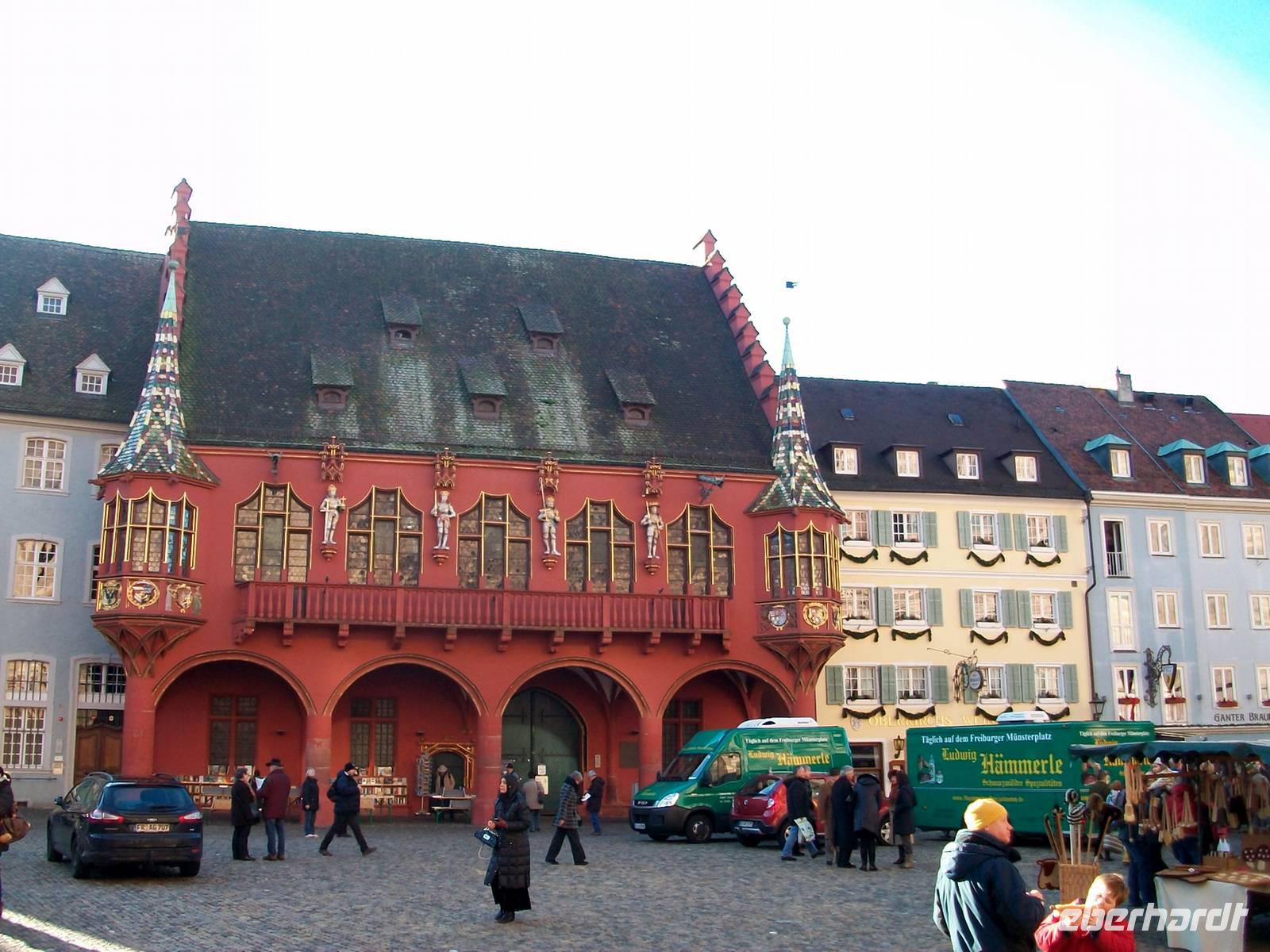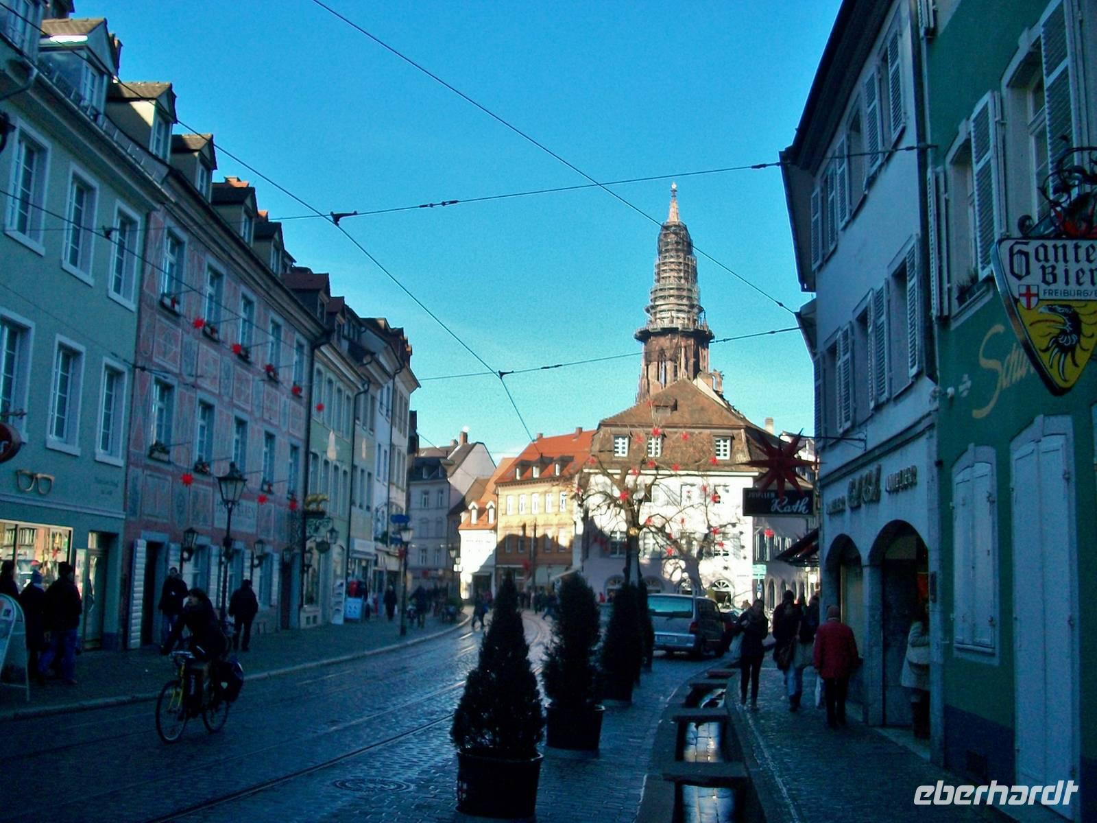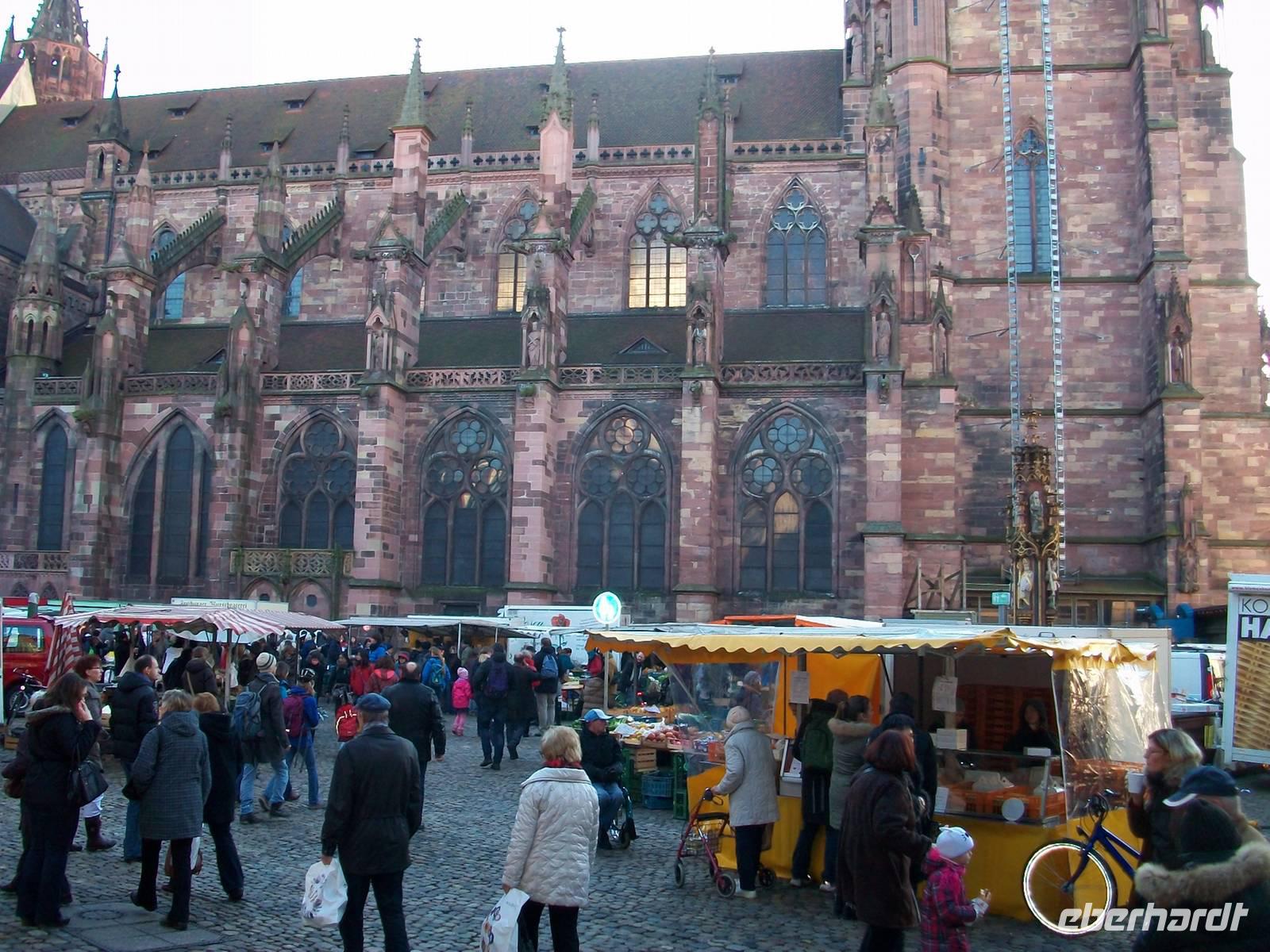 31.12.2013. Nun ist der letzte Tag des Jahres angebrochen. Als wir unterwegs sind verwöhnt uns erneut die Sonne, auch dieser Tag ist schön und ereignisreich. Durch die malerischen Orte der Region hindurch gelangen wir bald ins Breisgau. Hier begründeten, wie auch in der benachbarten Schweiz, einst die Zähringer so manchen Ort, auch Freiburg gehört dazu. Bald gelangen wir ins Zentrum dieser schönen Stadt, schon von weitem ist der mächtige Kirchturm des Münsters zu sehen. Am großen Busparkplatz werden wir von unseren zwei Stadtführern erwartet die uns in den nächsten 90 Minuten diesen prachtvollen Ort zeigen werden. Durch schmale Gassen gelangen wir zum Münsterplatz, hier befindet sich das schlagende Herz von Freiburg; vor dem mächtigen Kirchenbau sind zahlreiche Buden aufgebaut, es ist Wochenmarkt.