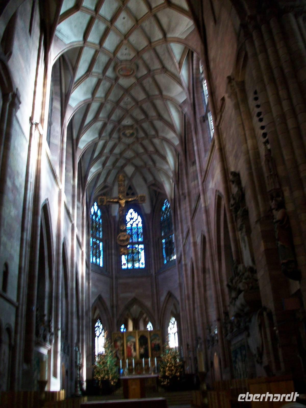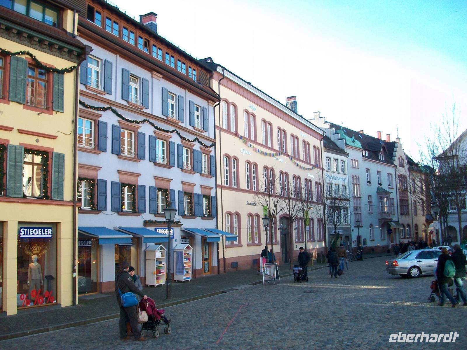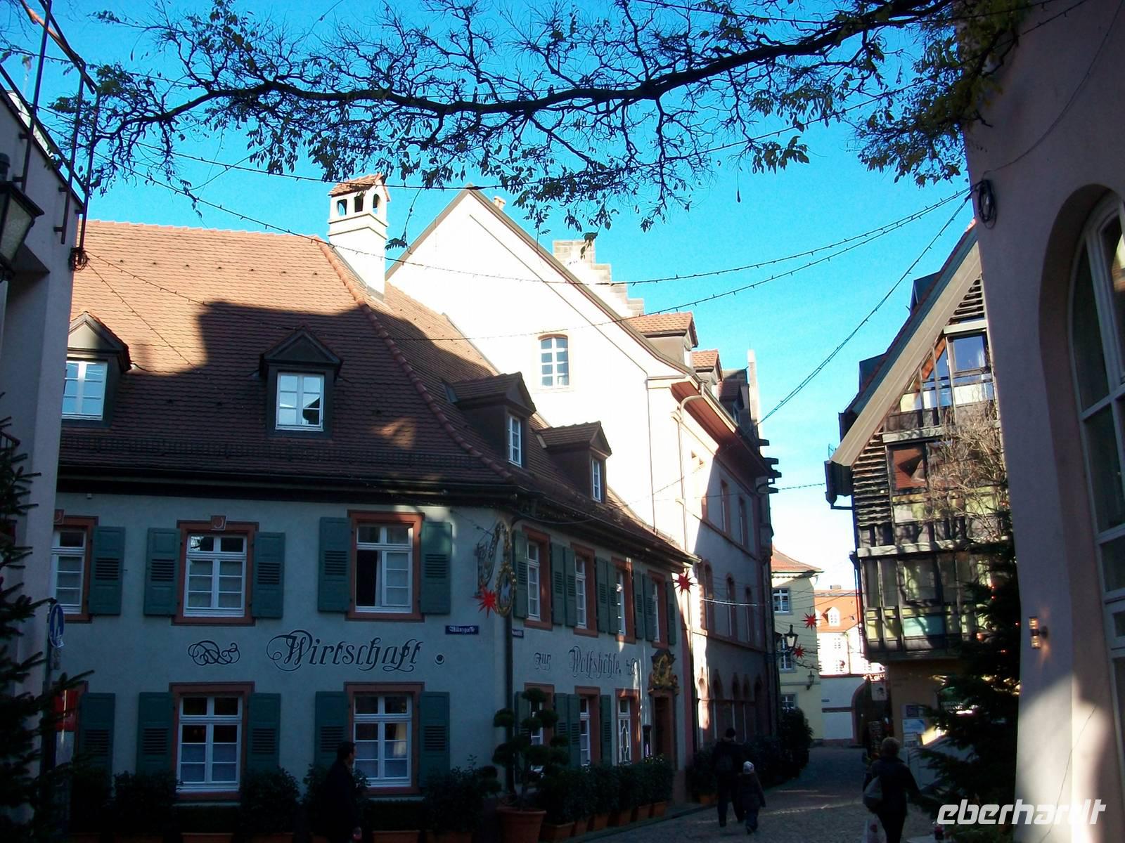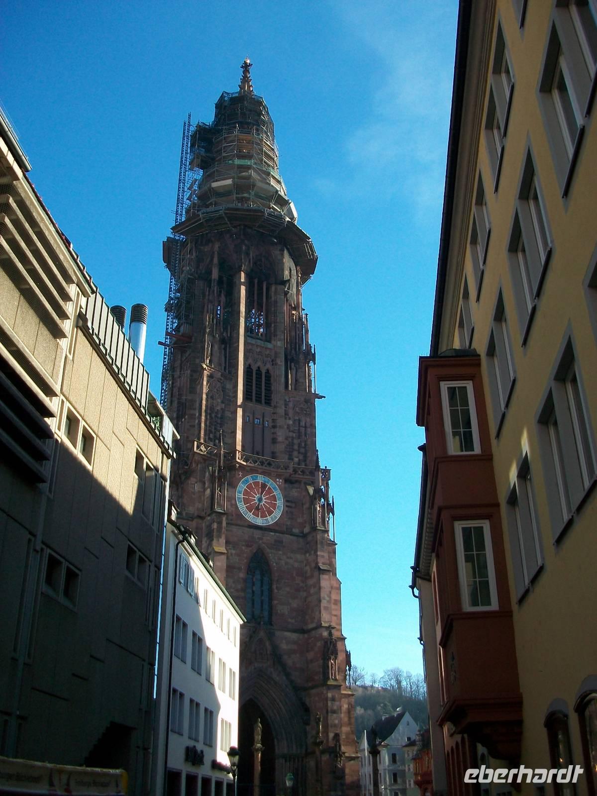31.12.2013. Nun ist der letzte Tag des Jahres angebrochen. Als wir unterwegs sind verwöhnt uns erneut die Sonne, auch dieser Tag ist schön und ereignisreich. Durch die malerischen Orte der Region hindurch gelangen wir bald ins Breisgau. Hier begründeten, wie auch in der benachbarten Schweiz, einst die Zähringer so manchen Ort, auch Freiburg gehört dazu. Bald gelangen wir ins Zentrum dieser schönen Stadt, schon von weitem ist der mächtige Kirchturm des Münsters zu sehen. Am großen Busparkplatz werden wir von unseren zwei Stadtführern erwartet die uns in den nächsten 90 Minuten diesen prachtvollen Ort zeigen werden. Durch schmale Gassen gelangen wir zum Münsterplatz, hier befindet sich das schlagende Herz von Freiburg; vor dem mächtigen Kirchenbau sind zahlreiche Buden aufgebaut, es ist Wochenmarkt.