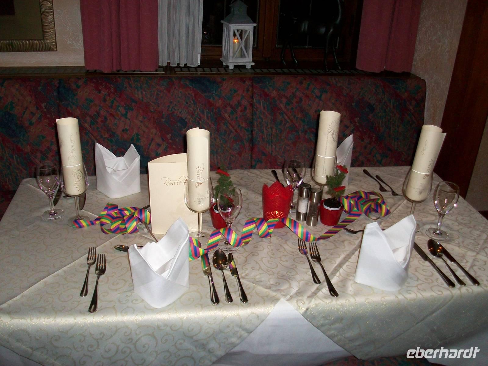Festlich geschmückt sind die Tafeln, geschmackvoll eingerichtet das Restaurant- Familie Beilharz, unsere Gastgeber, haben sich in den Stunden in denen wir unterwegs waren viel Mühe gegeben alles stimmungsvoll für die Silvesterfeier herzurichten.
