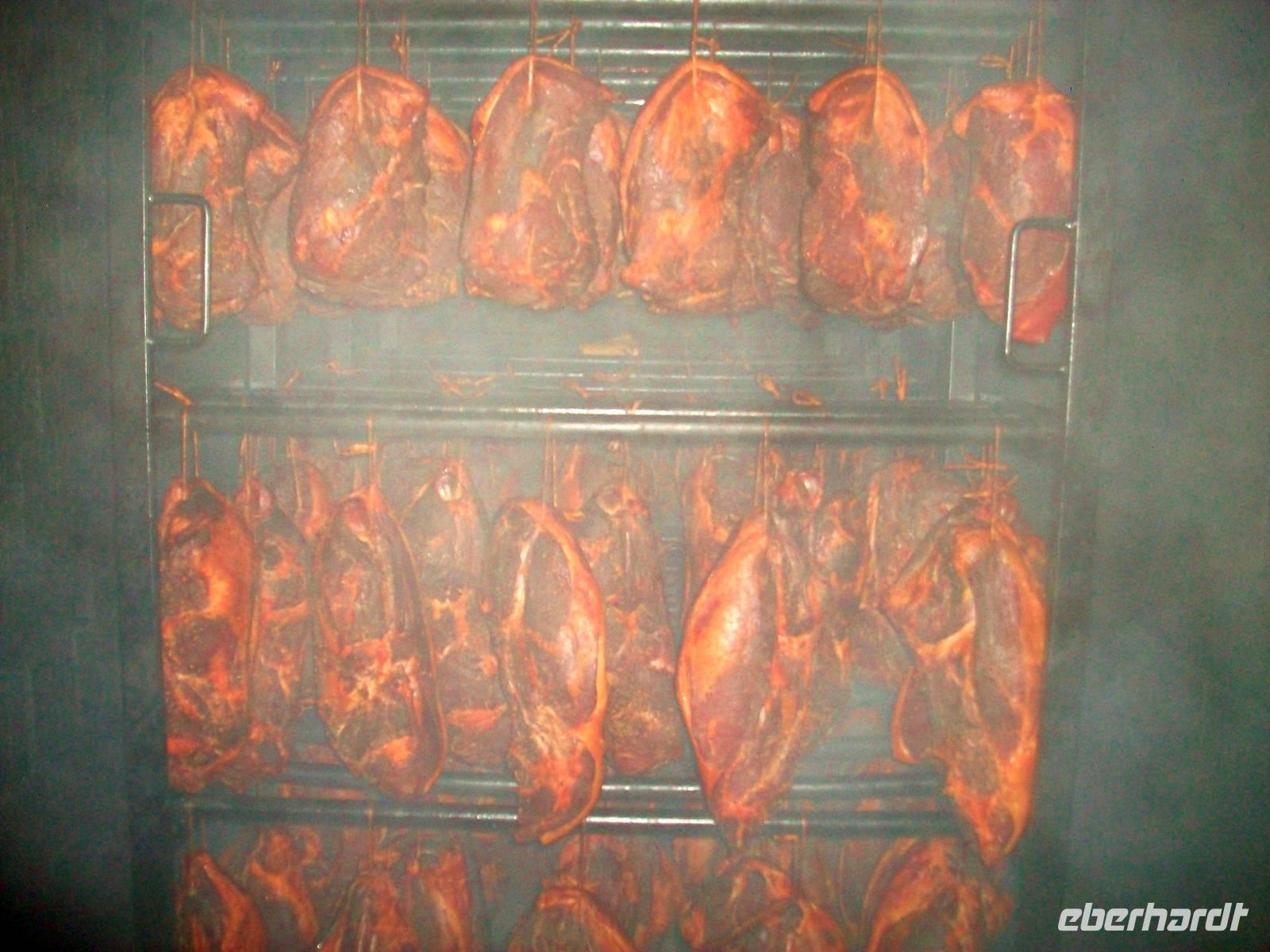 Zuvor erklärt uns Herr Pfau erst einmal was es mit dieser und so manch anderer Spezialität auf sich hat. Wir erfahren auch dass seine Fleischerei noch mit originalen Rezepturen arbeitet was natürlich auch ein Qualitätsmerkmal für gesunde Ernährung fernab chemischer Zusätze bedeutet. Dabei erfahren wir etwas über die Art der Räucherung, das verwendete Material und zum Schluss öffnet Herr Pfau auch noch die Kammer in der wir die Schinken hängen sehen welche hier ihrer Reife entgegensehen. Schnell füllt sich der Raum mit Rauch; trotz des aromatischen Duftes wird es nun aber Zeit an die frische Luft zu kommen, das war ein besonders authentisches Erlebnis!