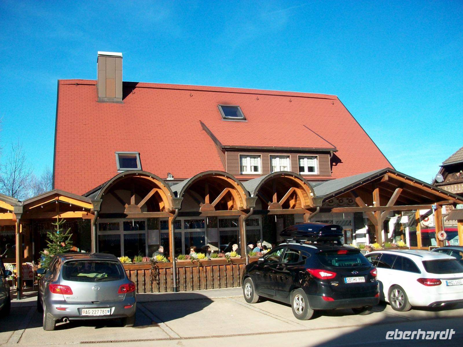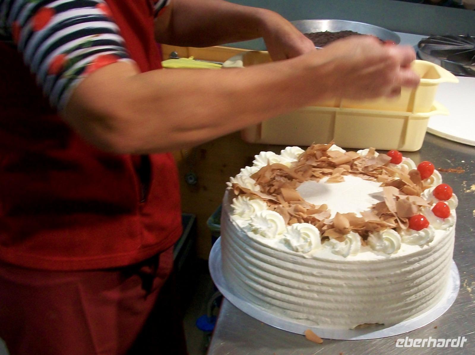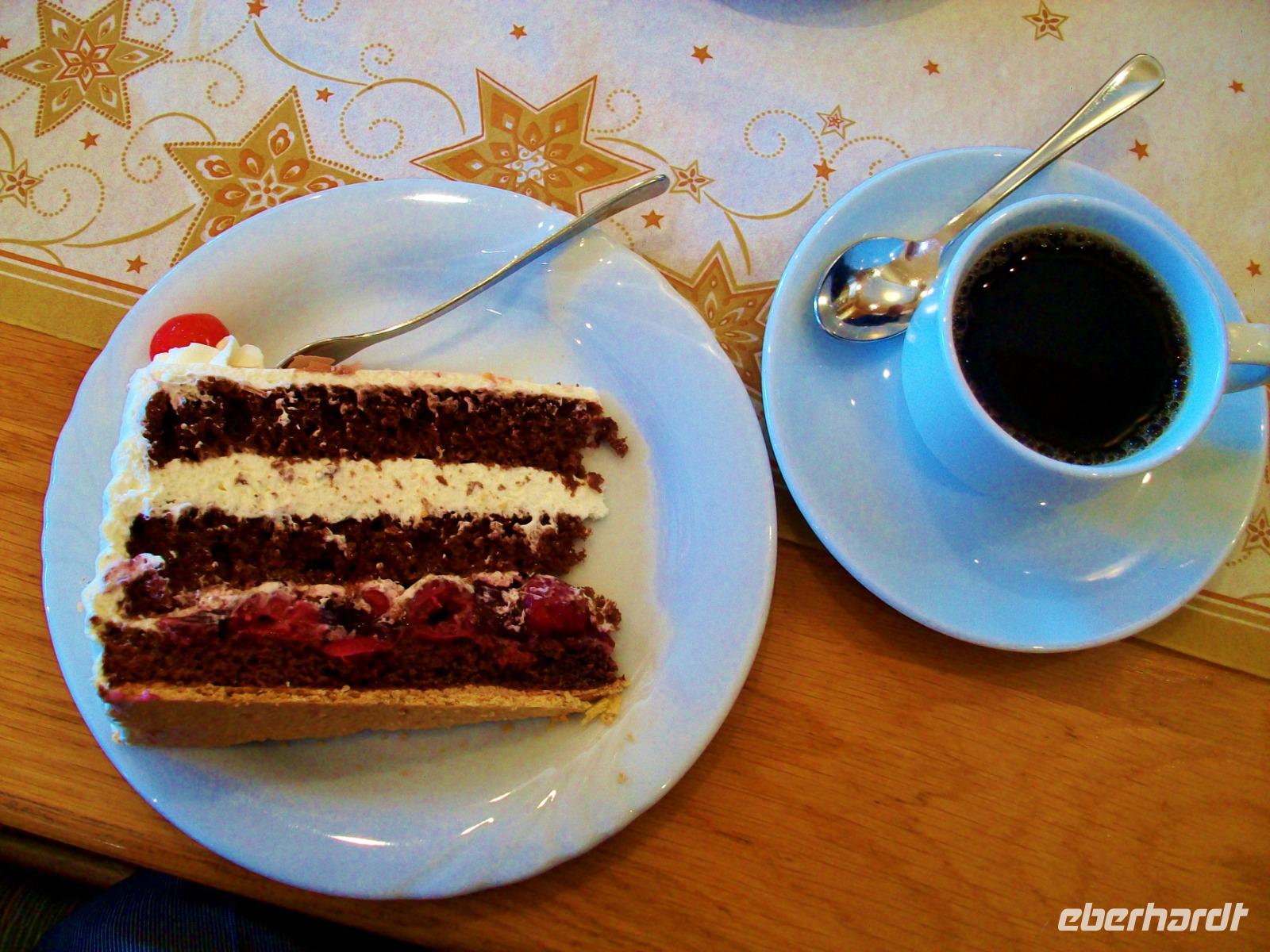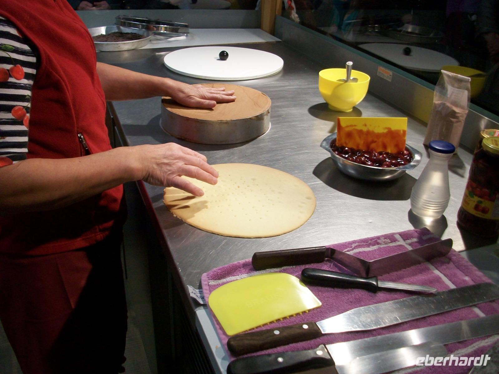 Nach diesem Aufenthalt gelangen wir in die Gemeinde Feldberg; im Ortsteil Bärental sind wir zu einer besonderen Spezialität eingeladen. Im „Café zum g'scheiten Beck" werden wir schon erwartet; in einem Vorführungsraum zeigt und nun die Chefin vom Hause wie eine „richtige" Schwarzwälder Kirchtorte entsteht. Mit geschickten Händen formt sie vor unseren staunenden Gesichtern dieses Wunderwerk der Backkunst, kräftig getränkt mit der Schwarzwälder Wundermedizin, dem Kirchwasser, ist die Torte bald fertig. Das hat uns nun doch Appetit gemacht hiervon zu kosten; kein Problem, in der Gaststube ist für uns schon Torte und Kaffee vorbereitet. Da gibt es nur ein Wort: köstlich!
