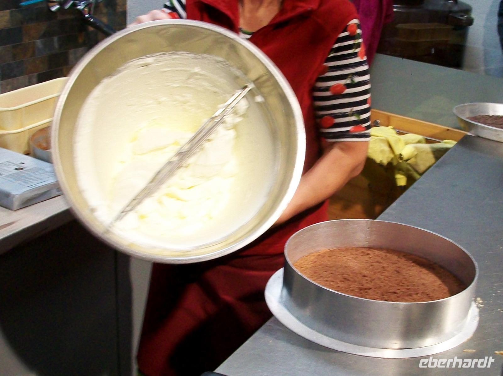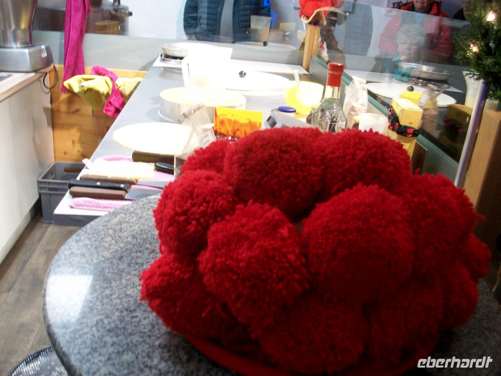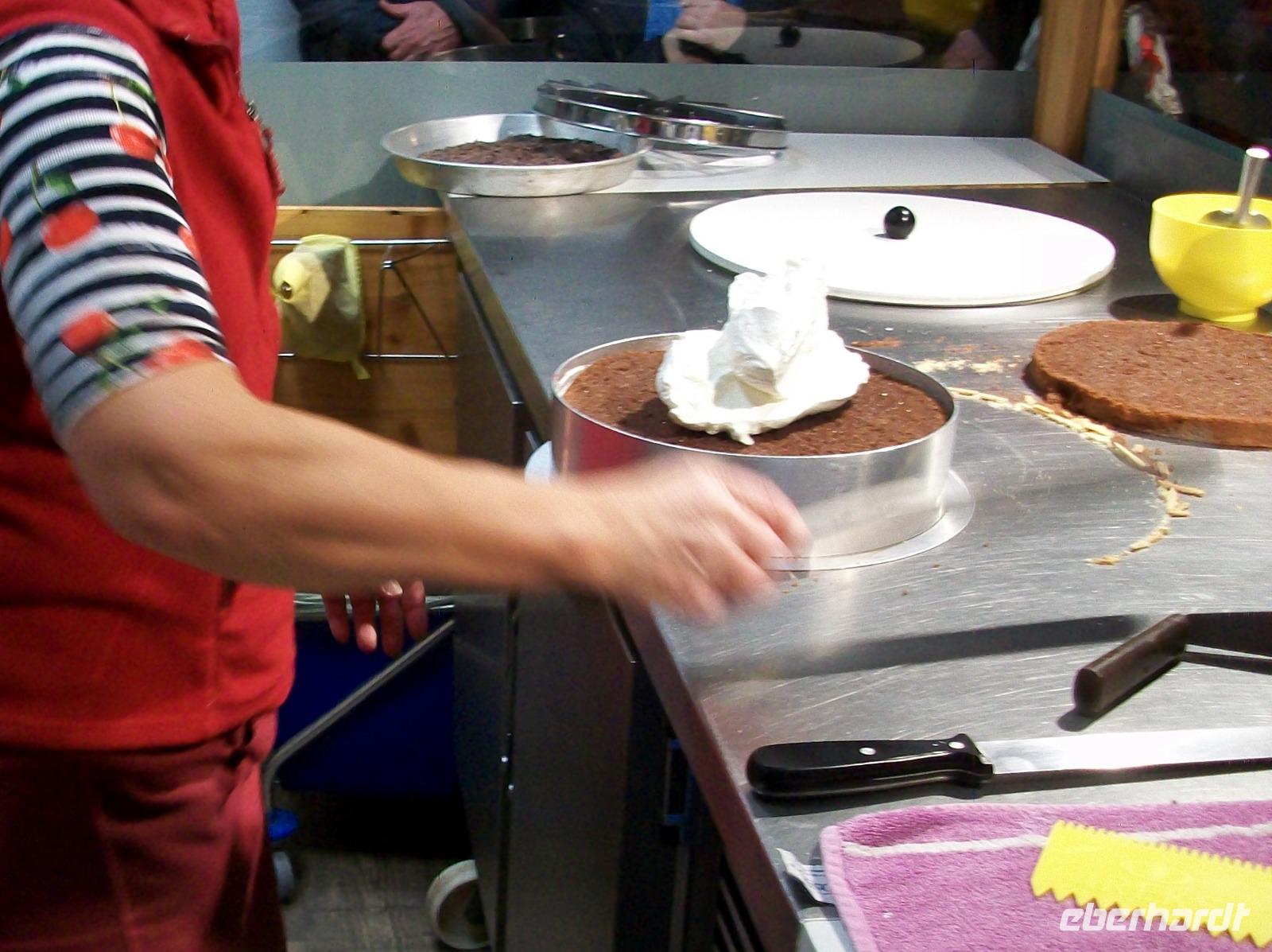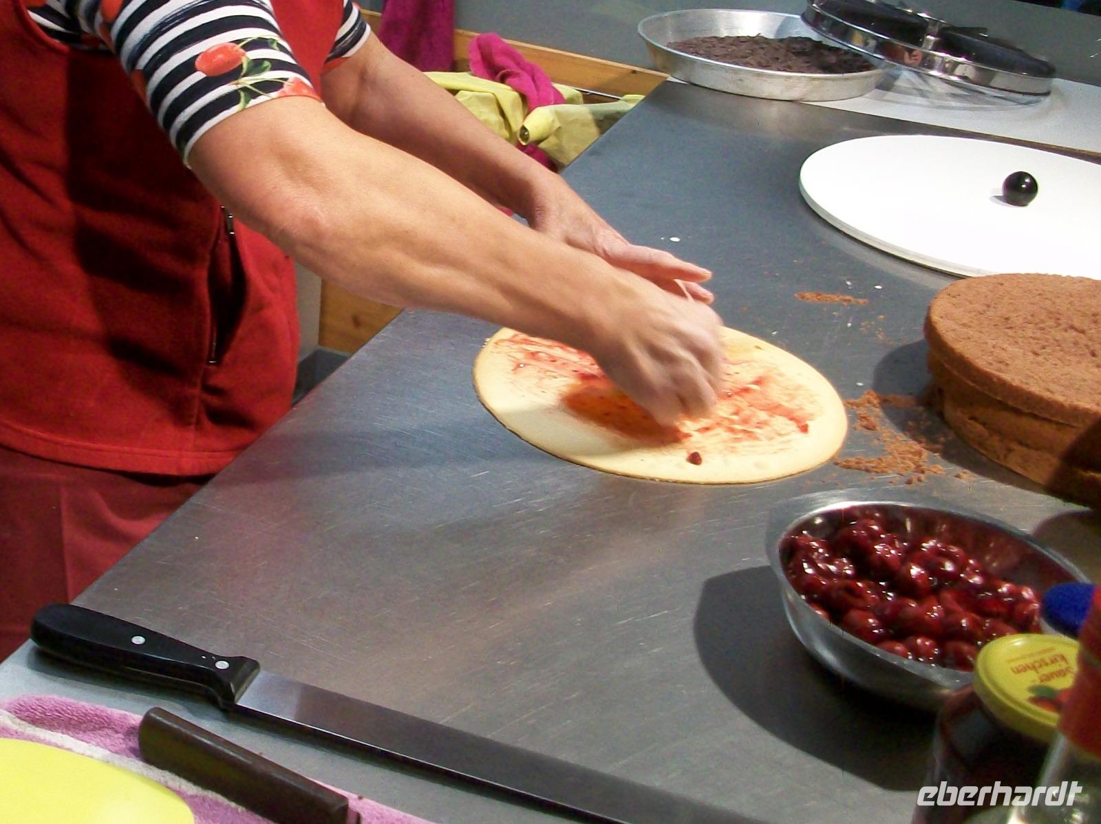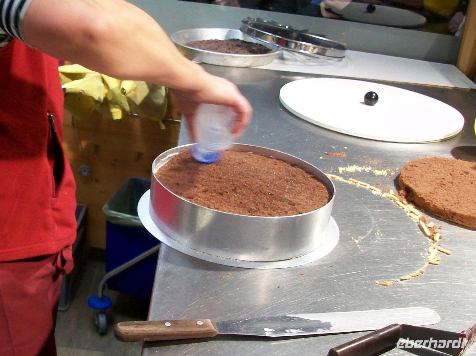 Nach diesem Aufenthalt gelangen wir in die Gemeinde Feldberg; im Ortsteil Bärental sind wir zu einer besonderen Spezialität eingeladen. Im „Café zum g'scheiten Beck" werden wir schon erwartet; in einem Vorführungsraum zeigt und nun die Chefin vom Hause wie eine „richtige" Schwarzwälder Kirchtorte entsteht. Mit geschickten Händen formt sie vor unseren staunenden Gesichtern dieses Wunderwerk der Backkunst, kräftig getränkt mit der Schwarzwälder Wundermedizin, dem Kirchwasser, ist die Torte bald fertig. Das hat uns nun doch Appetit gemacht hiervon zu kosten; kein Problem, in der Gaststube ist für uns schon Torte und Kaffee vorbereitet. Da gibt es nur ein Wort: köstlich!