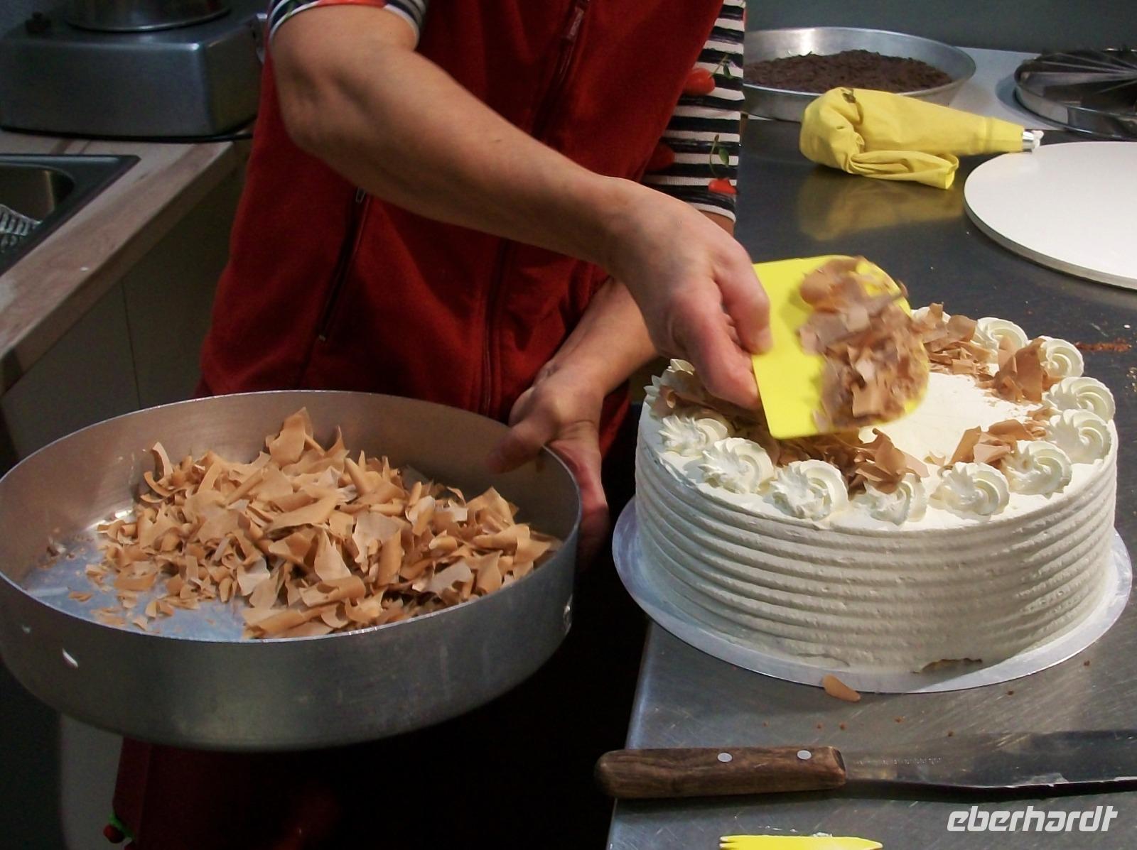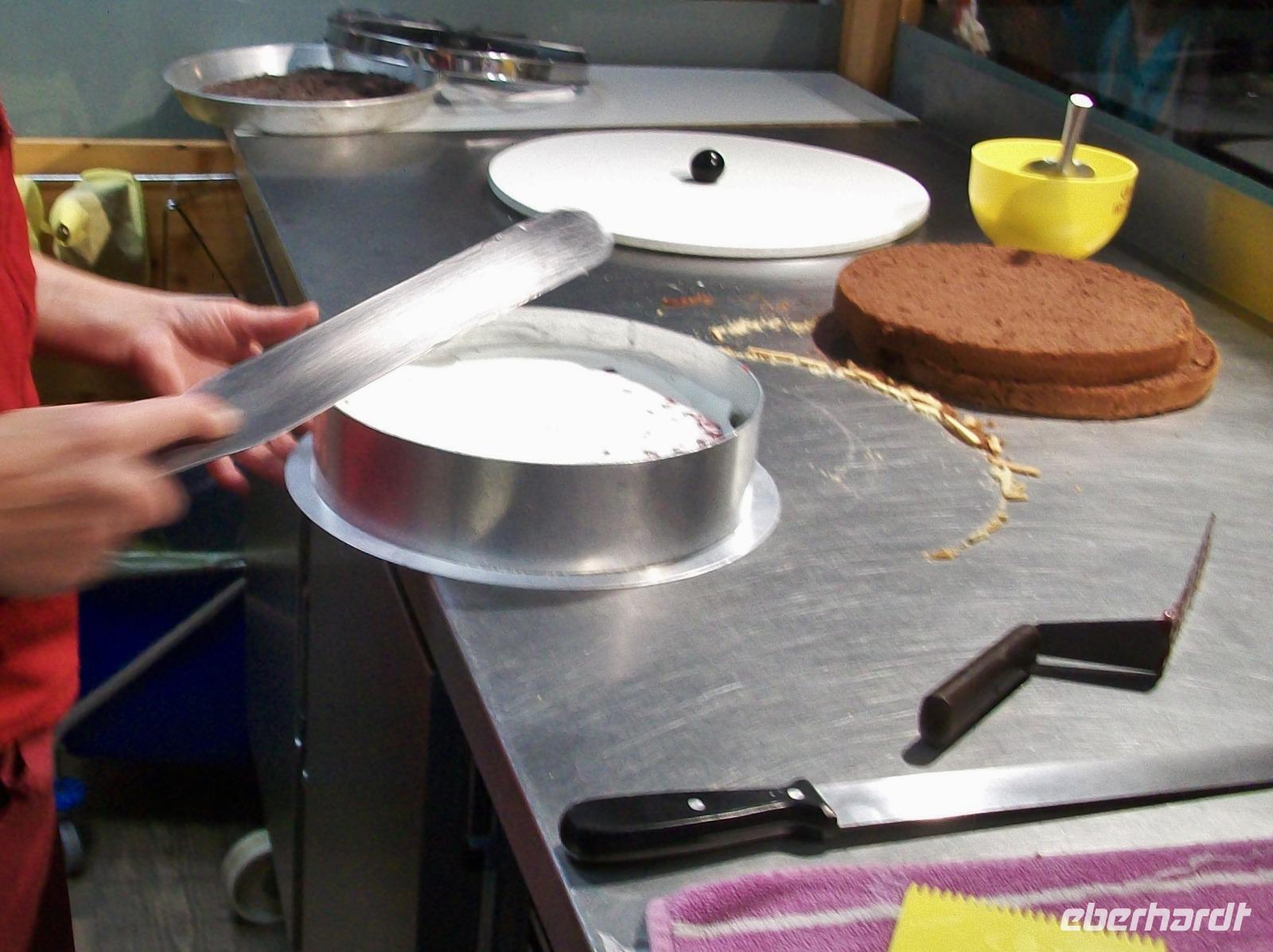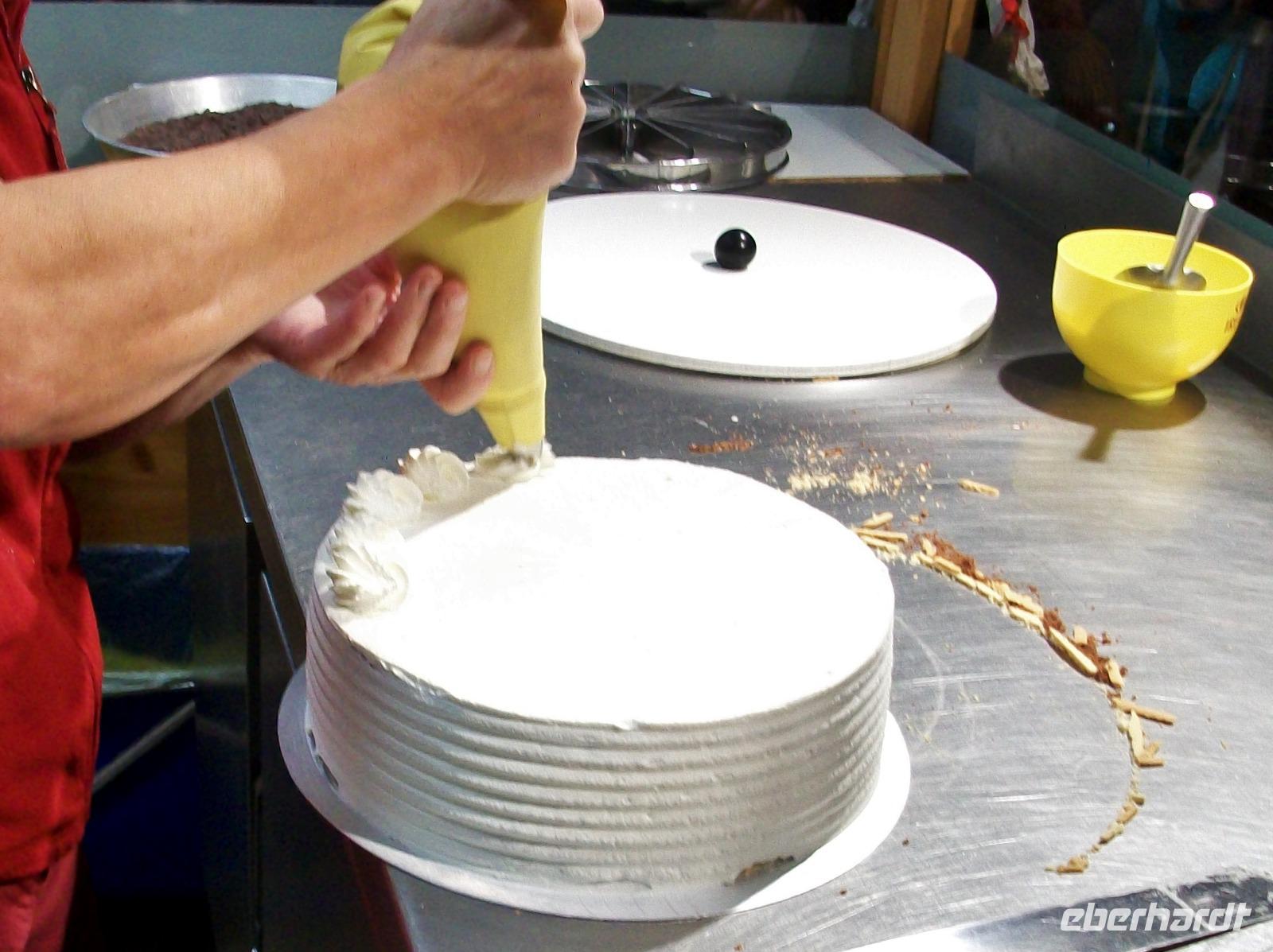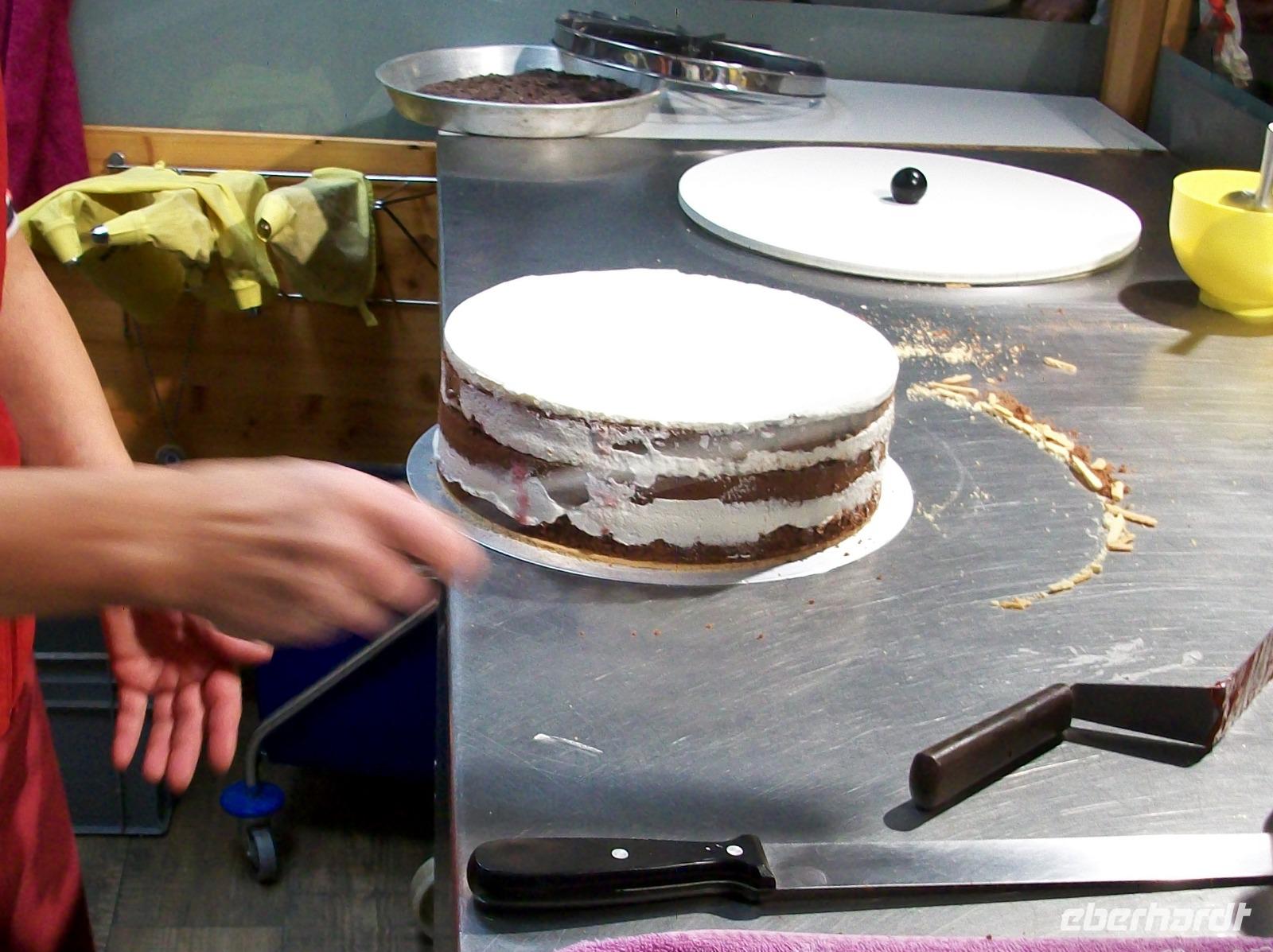 Nach diesem Aufenthalt gelangen wir in die Gemeinde Feldberg; im Ortsteil Bärental sind wir zu einer besonderen Spezialität eingeladen. Im „Café zum g'scheiten Beck" werden wir schon erwartet; in einem Vorführungsraum zeigt und nun die Chefin vom Hause wie eine „richtige" Schwarzwälder Kirchtorte entsteht. Mit geschickten Händen formt sie vor unseren staunenden Gesichtern dieses Wunderwerk der Backkunst, kräftig getränkt mit der Schwarzwälder Wundermedizin, dem Kirchwasser, ist die Torte bald fertig. Das hat uns nun doch Appetit gemacht hiervon zu kosten; kein Problem, in der Gaststube ist für uns schon Torte und Kaffee vorbereitet. Da gibt es nur ein Wort: köstlich!
