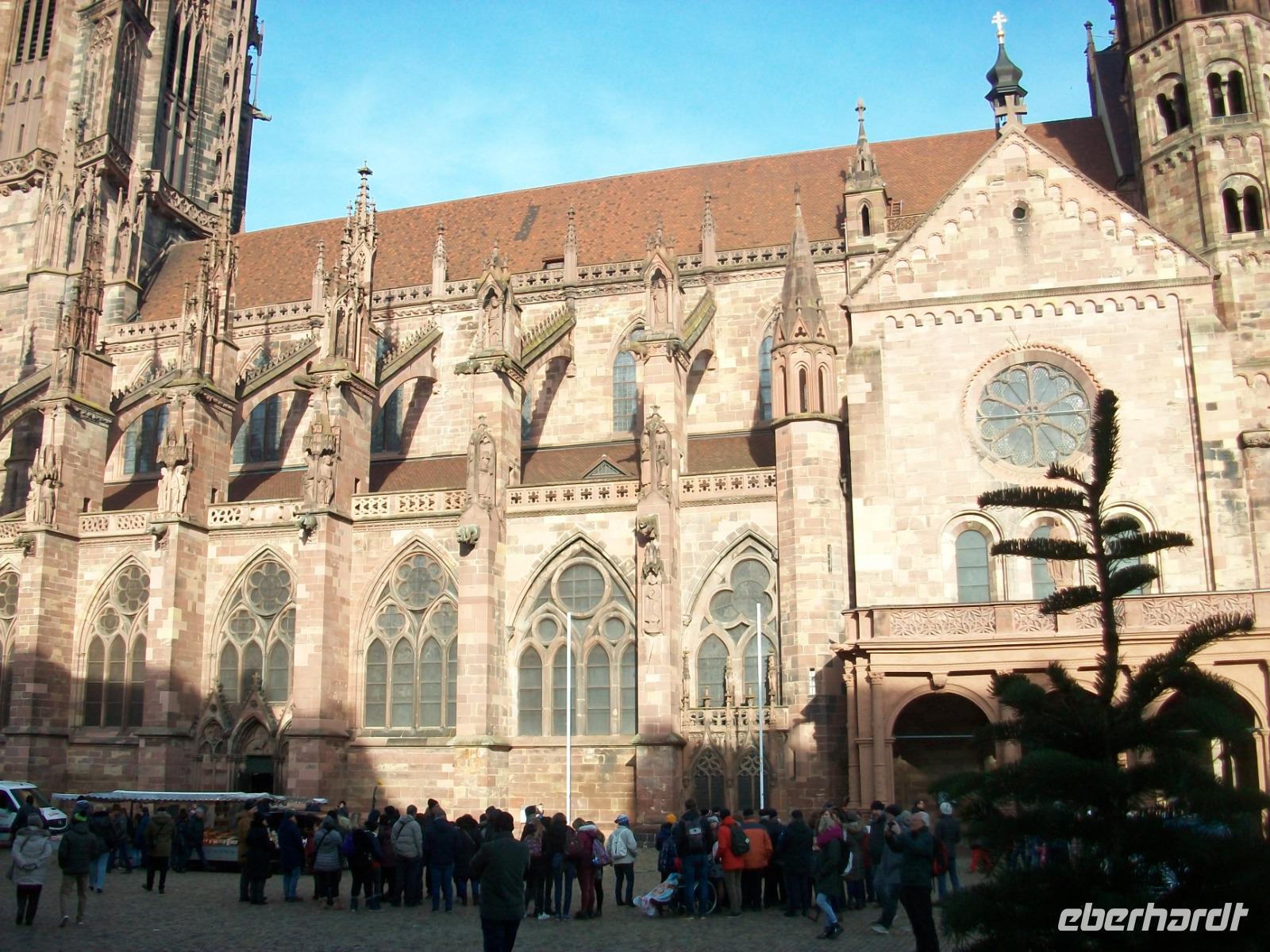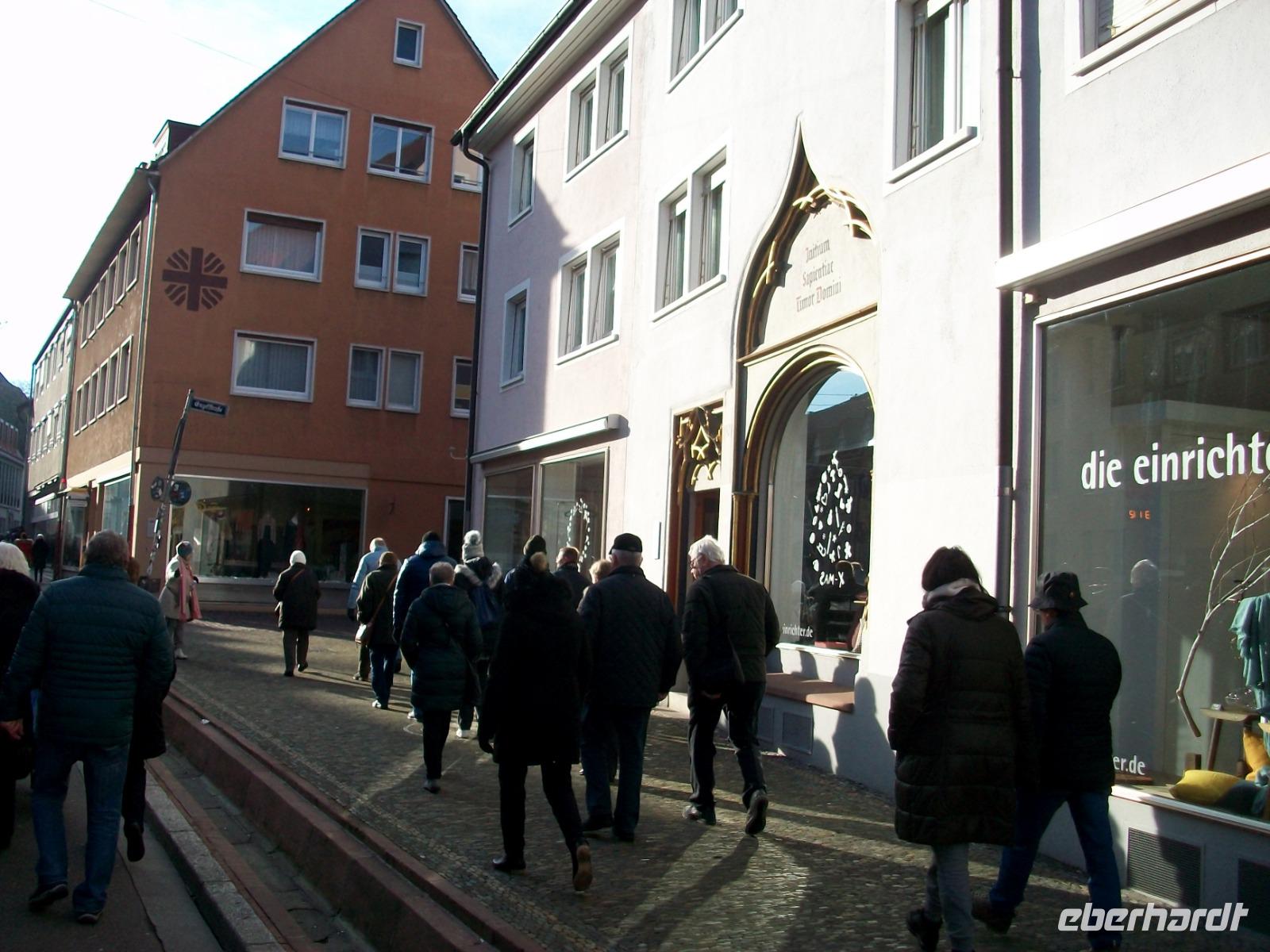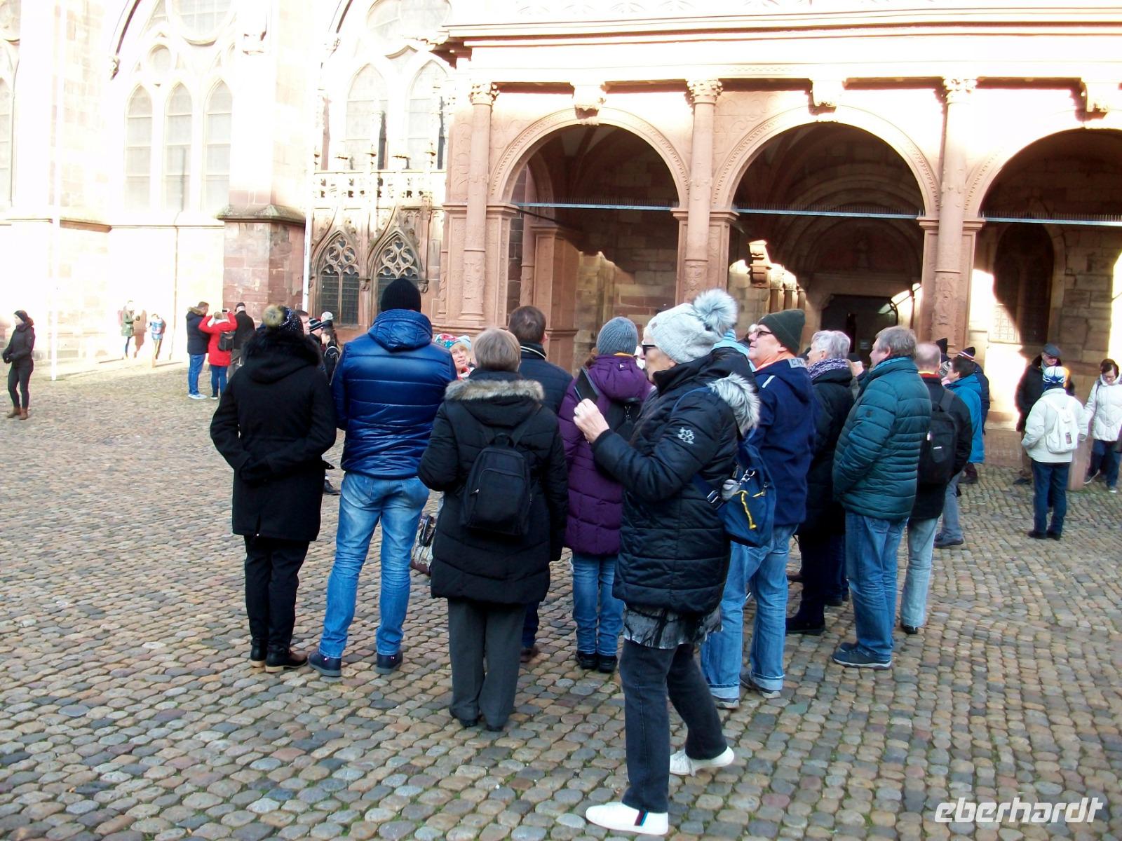 Kurz vor elf erreichen wir nun den Hauptort des Breisgaus: Freiburg. Hier sind wir an diesem Tag nicht allein; zahlreiche Reisegesellschaften haben sich dasselbe vorgenommen wie wir. Mit zwei Führern gelangt unsere geteilte Gruppe in die direkte Innenstadt. Staunend stehen wir vor dem gigantischen Bau des Münsters um bald im Hauptschiff dieses Gotteshauses zu verschwinden. Alles ist hier sehr sehenswert, die Glasfenster, der Altar und natürlich die Krippe die noch vom Weihnachtsfest stehen blieb.