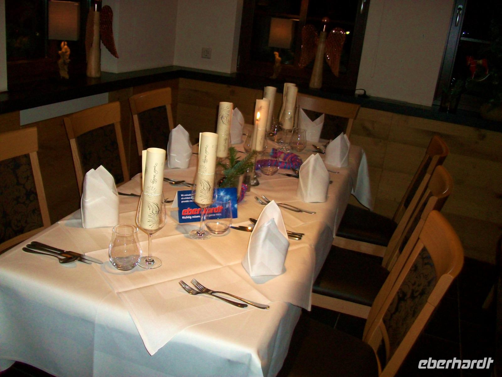 Nun müssen wir aber aufbrechen um nach Alpirsbach zurückzukehren; Stimmung, Tanz und gute Laune erwarten uns, und als wir am Hotel anlangen, haben die fleißigen Hände des Hauses alles schon wunderschön für die Feier vorbereitet. Festlich sind die Tische gedeckt, brennende Kerzen verbreiten eine besondere Stimmung und bald hat sich unsere Reisegruppe, festlich gekleidet, eingefunden um die letzten Stunden des Jahres gemeinsam zu verleben. Doch bevor es soweit ist, gibt es das festliche Diner zu welchem sich unsere Gastgeber besonders viel Mühe gegeben haben. Als wir uns gestärkt haben, kann es losgehen. Hans, unser DJ für diesen Abend, hat seine Platten aufgelegt und nun kann der Tanz beginnen. Fröhlich drehen die Paare sich im Kreis, der Tropfen guten Weins mundet, und unsere Gastgeber geben ihr Bestes dazu diesen letzten Abend des Jahres für uns so angenehm wie nur irgend möglich zu gestalten.