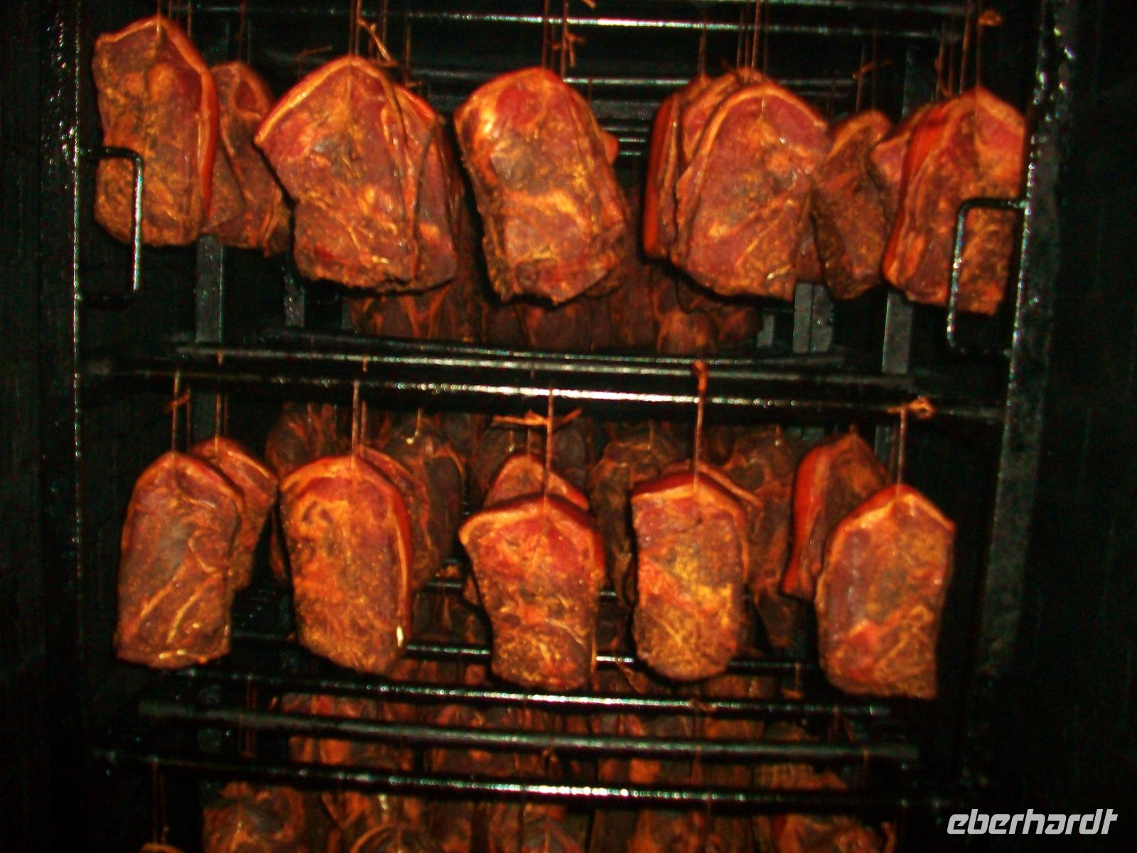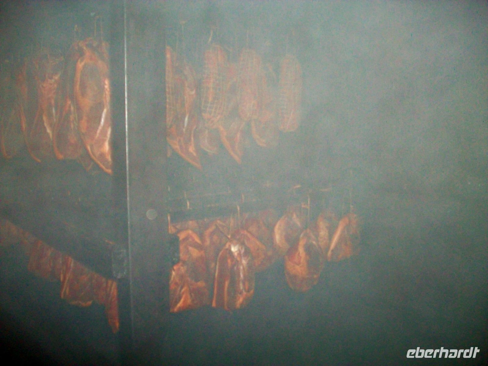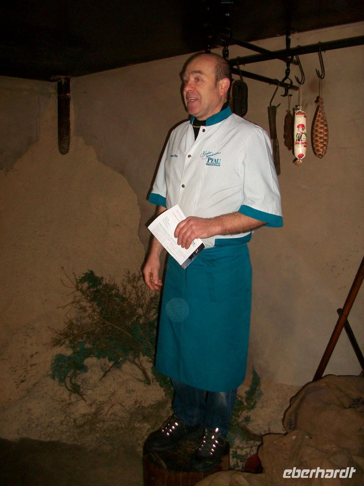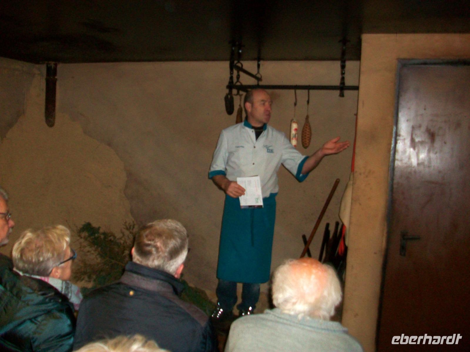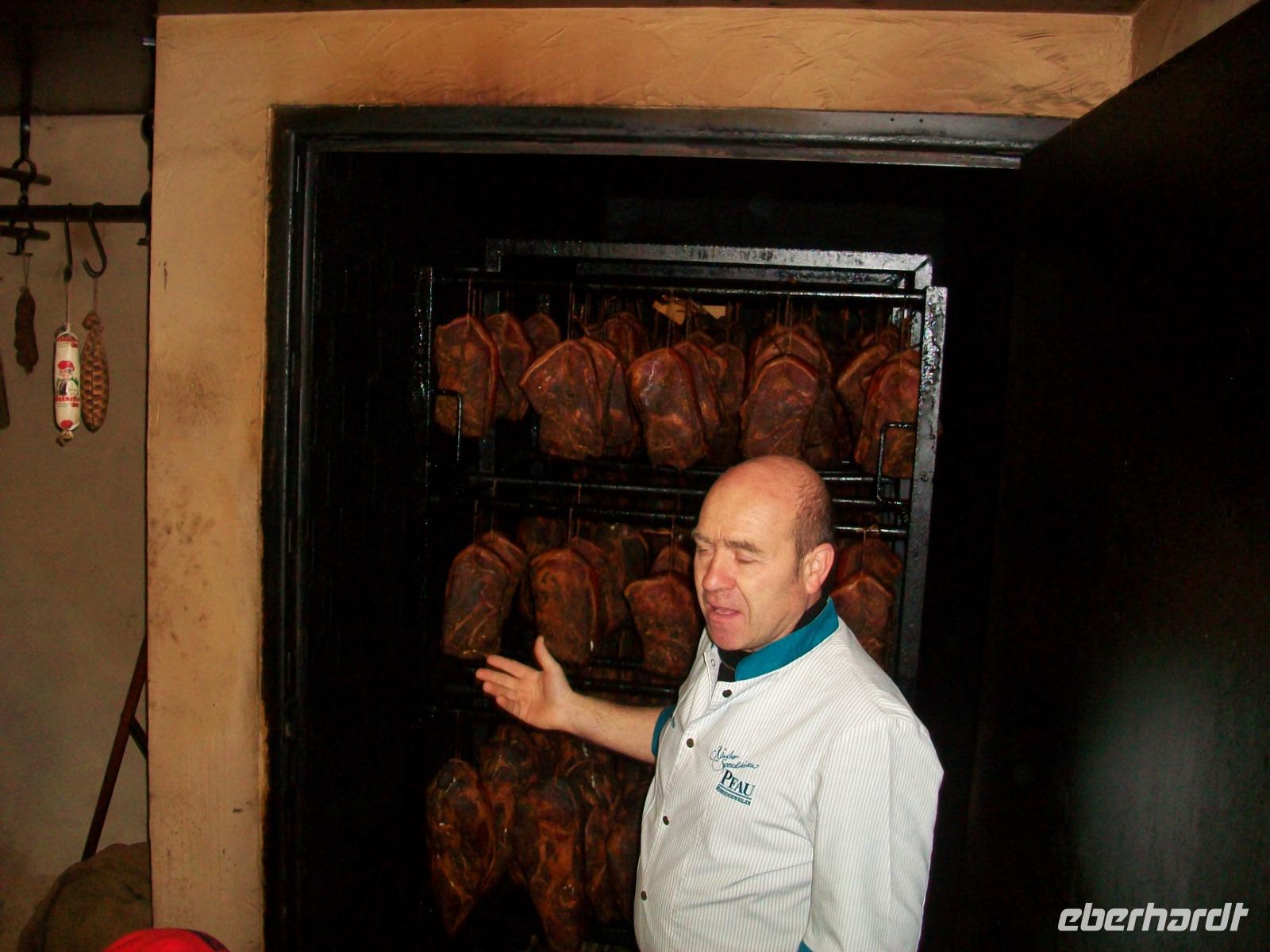 Unser Bus kommt vor der Metzgerei „Pfau" zum Stehen; der Chef lässt es sich nicht nehmen uns persönlich zu begrüßen und bald gelangen wir über die Straße um ins Heiligtum des Fleischers einzudringen: der Räucherkammer.