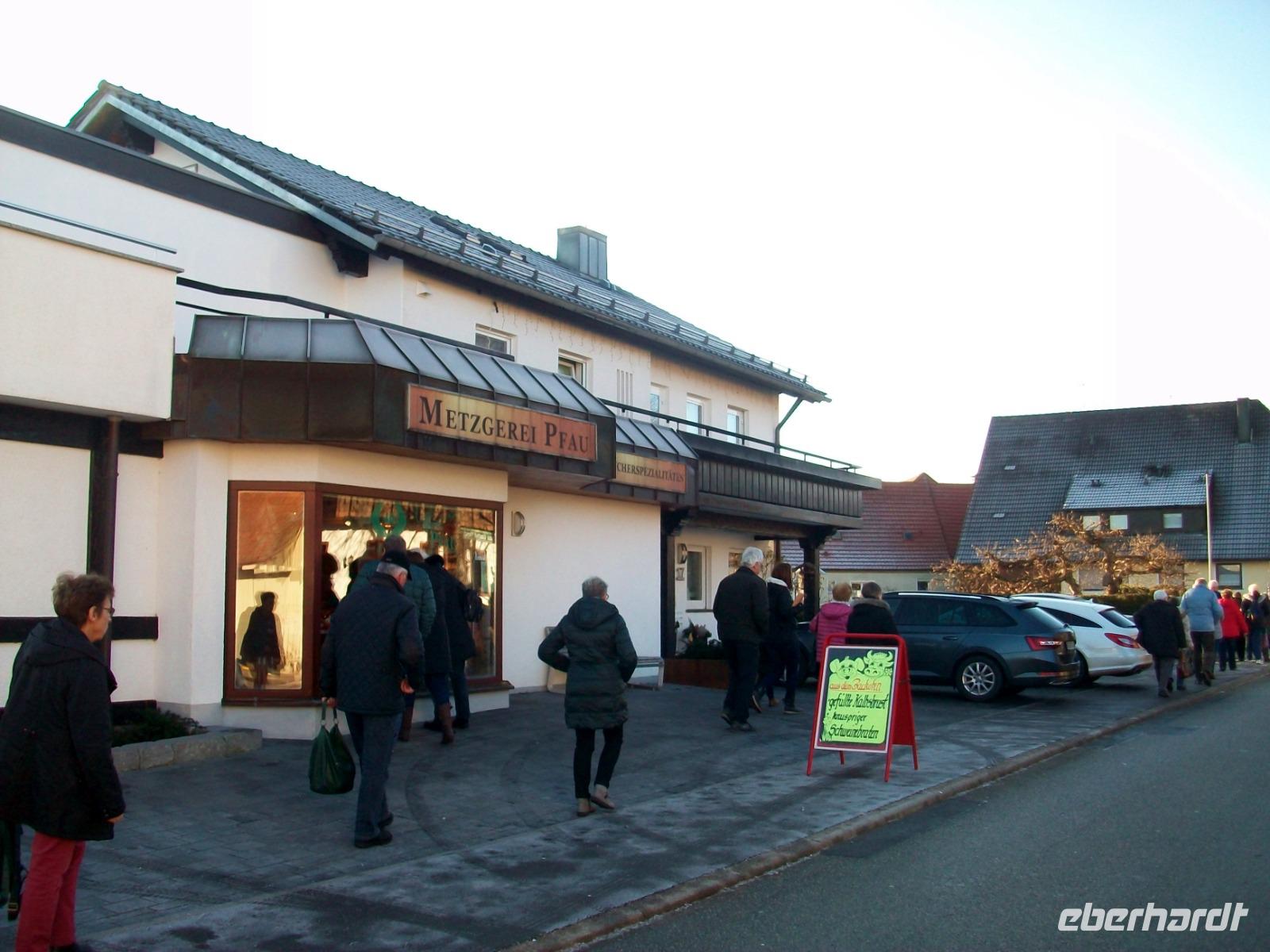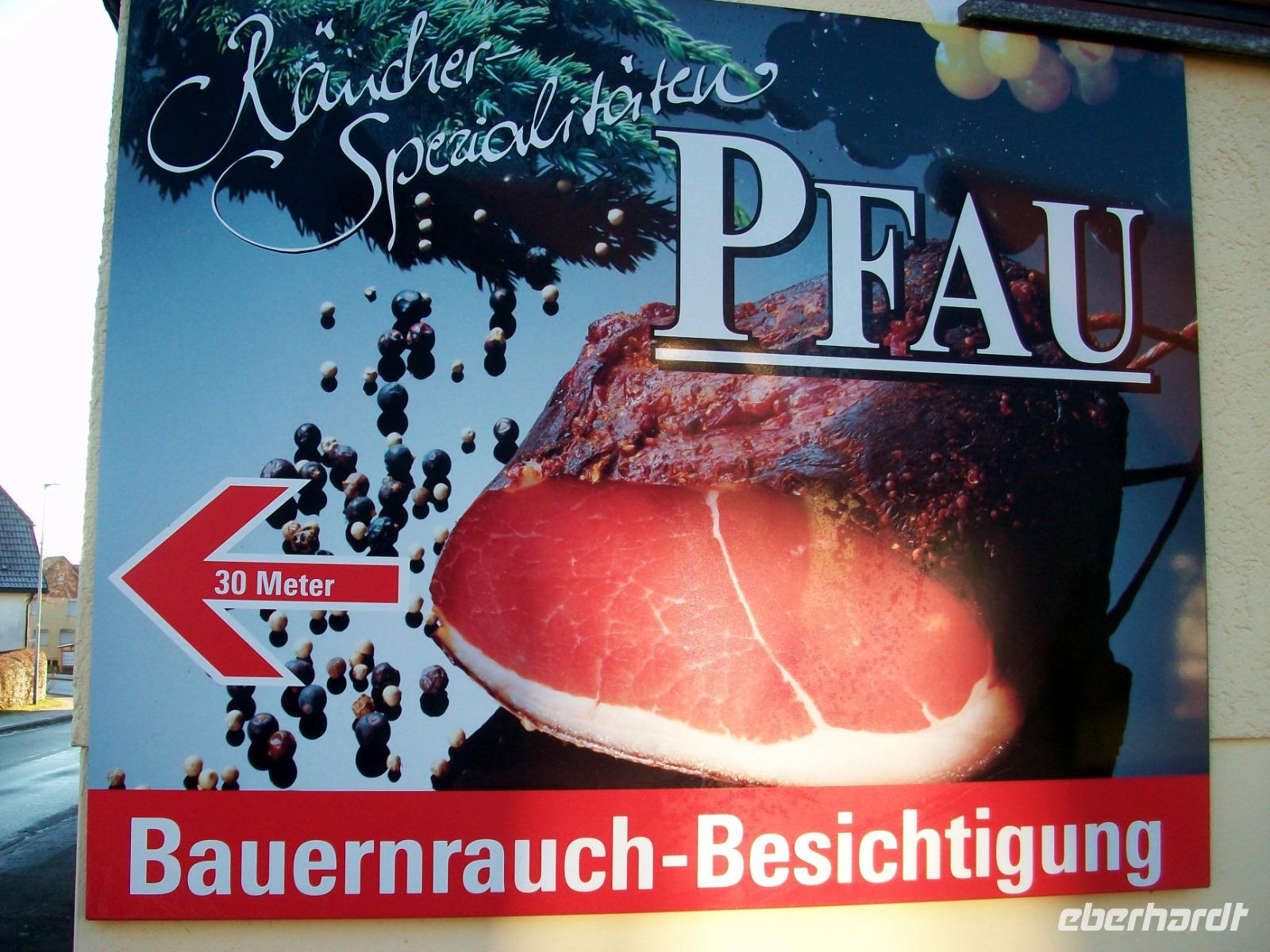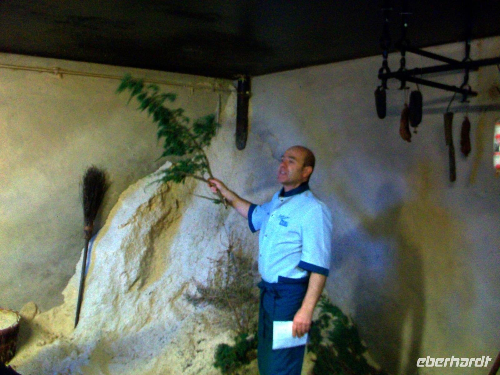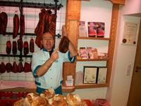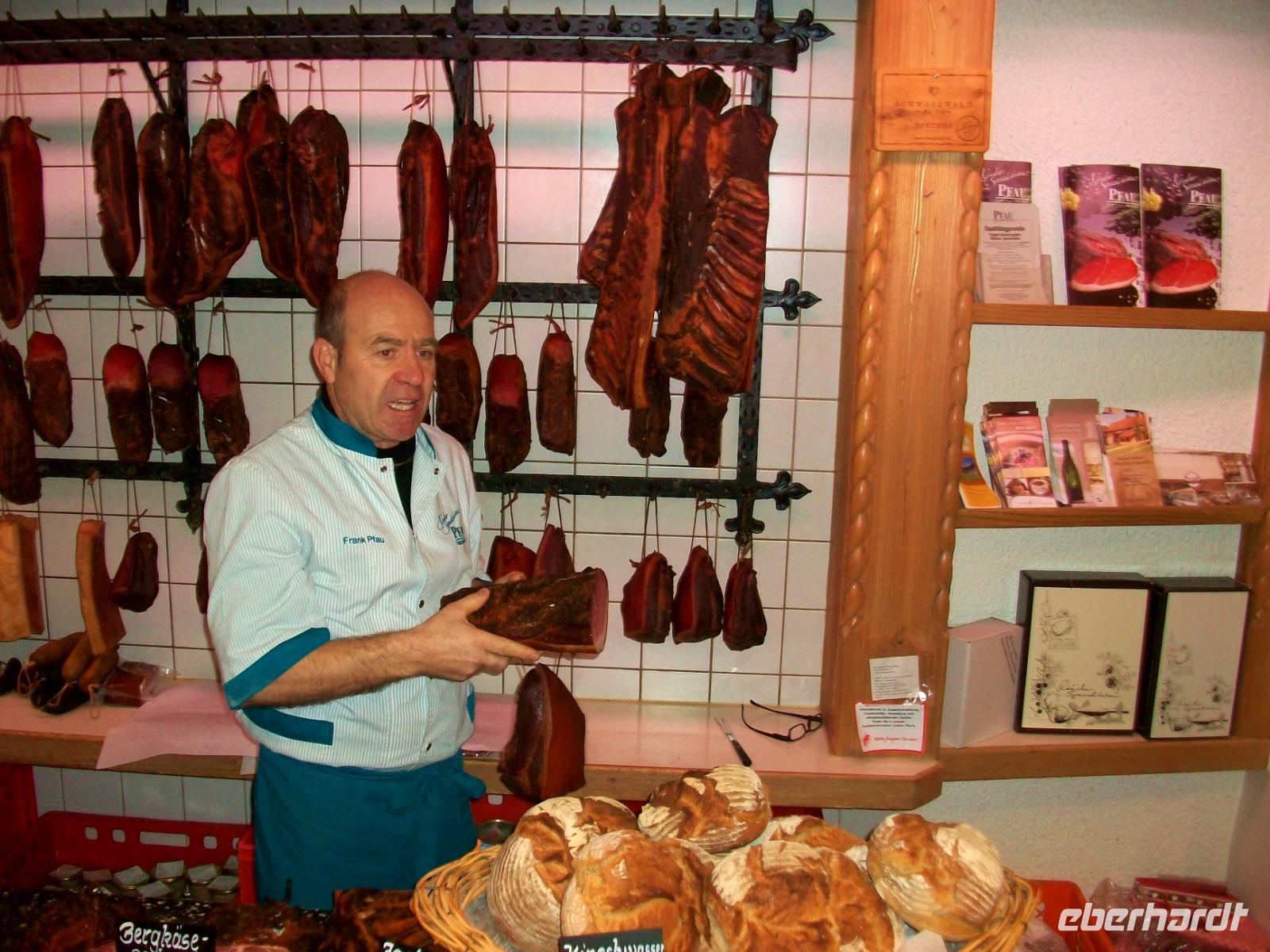 Unser Bus kommt vor der Metzgerei „Pfau" zum Stehen; der Chef lässt es sich nicht nehmen uns persönlich zu begrüßen und bald gelangen wir über die Straße um ins Heiligtum des Fleischers einzudringen: der Räucherkammer.