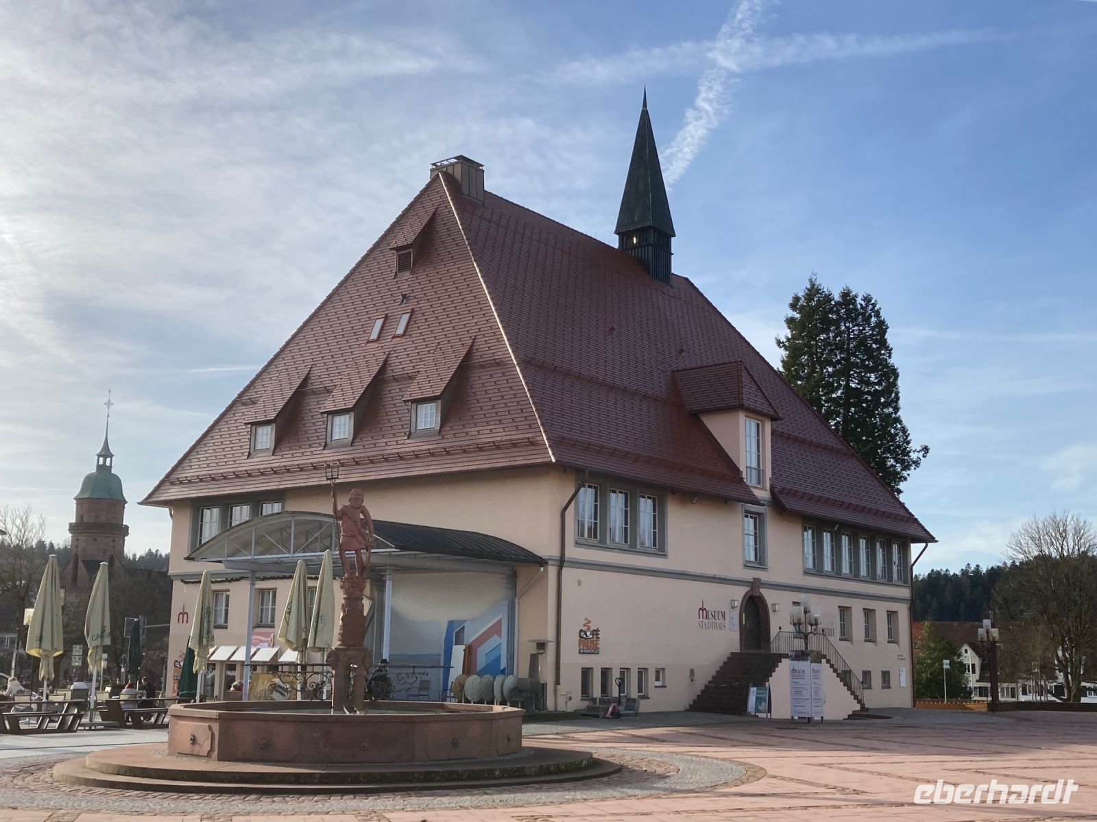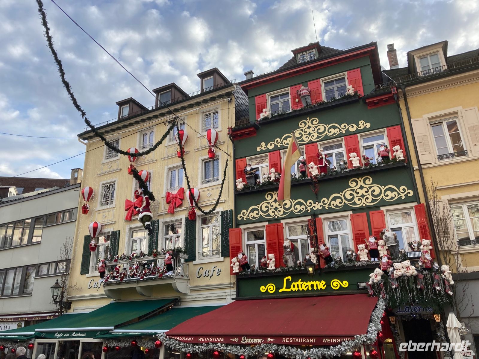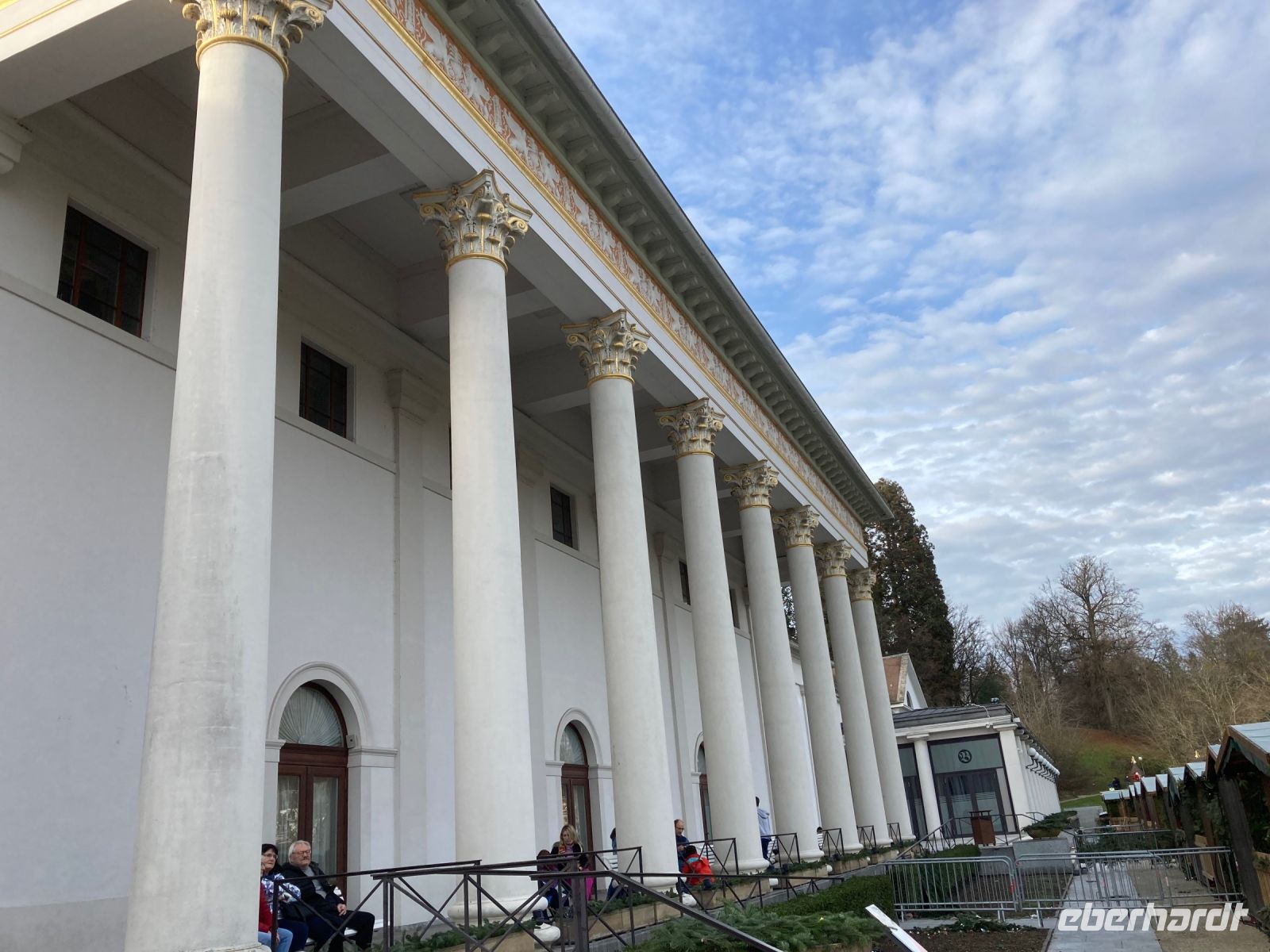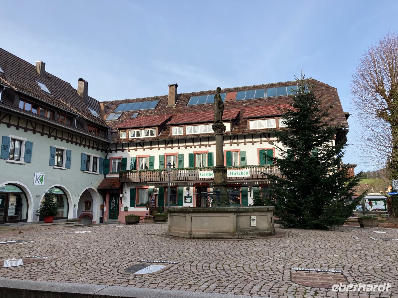 Ach, ein neues Jahr könnte wesentlich schlimmer beginnen als mit unserem leckeren und reichhaltigen Frühstücksbuffet, 18 °C, blauem Himmel und einem Ausflug nach Baden-Baden über die Schwarzwaldhochstraße. Und da Neujahr ist, bitte ich auch erst um Viertel nach 10 zur Abfahrt. In Freudenstadt erfolgt der erste Halt. Wir schlendern über den größten Marktplatz Deutschlands und genießen dabei die viel zu warme Wintersonne. Die als Winkelkirche errichtete Stadtkirche erregt dabei unsere besondere Aufmerksamkeit, denn ein solcher Grundriss ist sehr selten zu sehen. Hinter Freudenstadt beginnt dann die 60 km lange Schwarzwaldhochstraße bis Baden-Baden. Und natürlich kommt jetzt das schöne Wetter voll zur Geltung. Sonne und blauer Himmel ermöglichen uns eine unglaublich gute Fernsicht bis zu den Vogesen. Gerade auch beim Fotostopp am Mummelsee können wir diese Aussicht genießen. Mummeln bzw. Nixen sehen wir dafür in dem kleinen See unterhalb der Hornisgrinde zum Glück nicht, sonst wäre es wohl um uns geschehen. Dafür entpuppt sich der Reiseleiter mit spontan anprobierter Schwarzwald-Perücke zu meinem Leidwesen als allzu beliebtes Fotomotiv. Also schnell weiter nach Baden-Baden, damit meine Gäste auf andere Gedanken und Fotomotive kommen. In der weltberühmten und -berüchtigten Kur- und Casinostadt hat noch der Weihnachtsmarkt geöffnet. Der himmlische Duft und erstaunlich moderate Preise verführen uns zu einem kleinen Mittagsimbiss, bevor wir Innenstadt und Kuranlagen erkunden. Leider hat das Casino aufgrund einer Veranstaltung geschlossen, sodass es mit dem plötzlichen Reichtum wieder einmal nichts wird. Aber das ist vielleicht auch besser so; schon der gute Dostojewski hatte sich ja in tiefste Schulden gespielt. Im Friedrichsbad lassen sich zumindest die Eingangshalle und der Festsaal besichtigen und in der Innenstadt gibt es am Löwenbräu einen Platz mit sehr viel kitschiger Weihnachtsdekoration zu bestaunen. Viel Volk ist heute unterwegs, das gute Wetter lockt alle nach draußen. Die zwei Stunden Aufenthalt vergehen wie im Flug und wir schlendern gemütlich zurück zum Festspielhaus, wo unser Bus schon auf uns wartet. Wie schon bei der Anreise fährt uns Jens am Nachmittag durch das Murgtal nach Alpirsbach – ein letztes Mal geht es ins Hotel zurück. Diesmal ist es noch heller, sodass wir von der Umgebung mehr mitbekommen. Vor dem Abendessen können wir noch einen kleinen Spaziergang durch Alpirsbach machen, mal kurz bis zum Kloster laufen. Zum Abendessen gibt es eine Maultasche als Vorspeise, womit wir auch noch in den Genuss dieser lokalen Spezialität kommen. Das Dessert signalisiert dann langsam aber sicher, dass wir nun die Koffer packen sollten, denn morgen geht es (leider) nach Hause.
