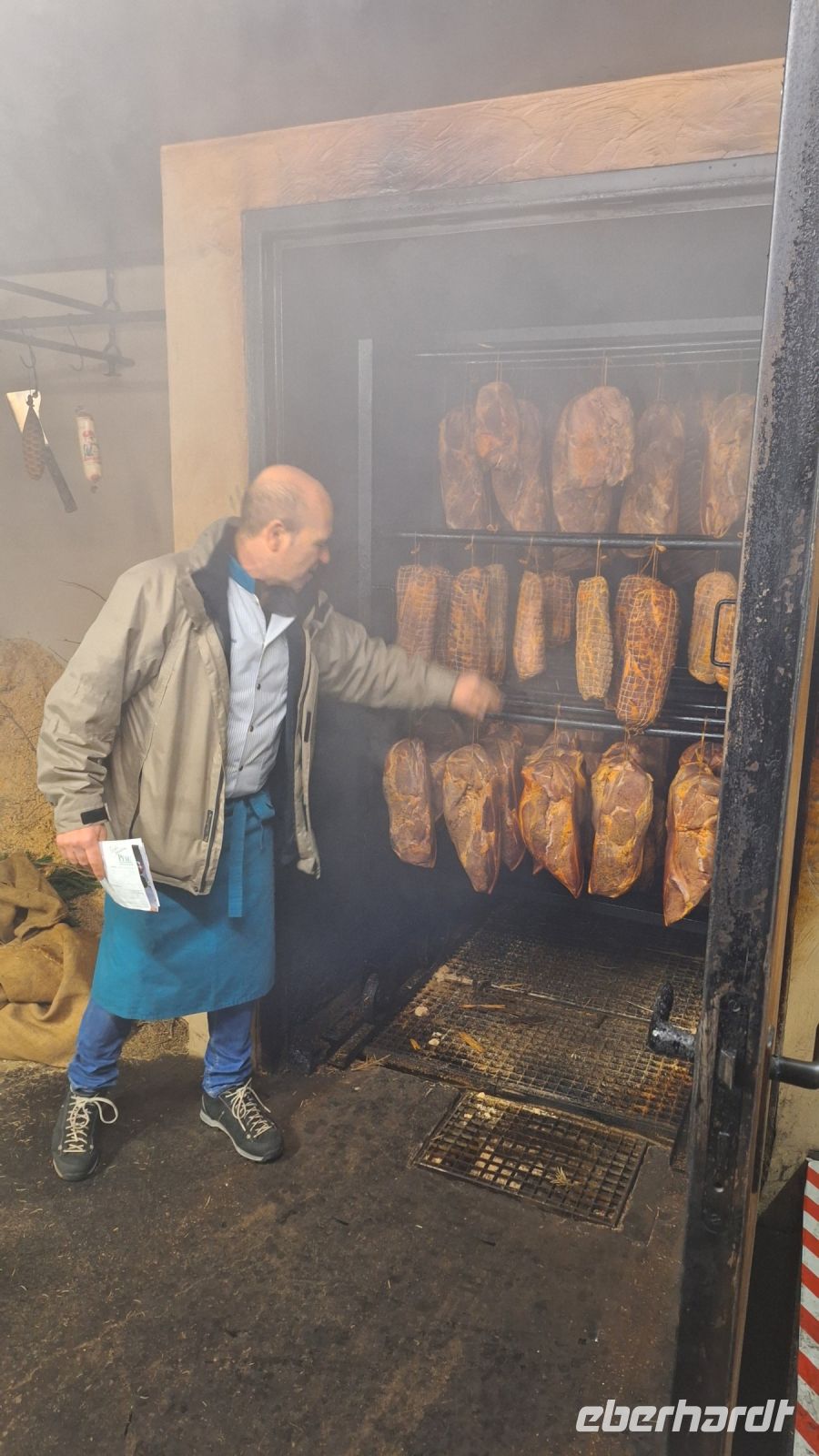 Wir werden nun eingeführt in die Geheimnisse, die den Schwarzwälder Schinken zu etwas ganz besonderem machen. Im Anschluss dürfen wir einen Blick in die Räucherkammern werfen und dann endlich auch probieren. Neben dem Schinken auch Salami mit Kirschwasser und Schwarzwurst, so wird die geräucherte Blutwurst hier genannt.