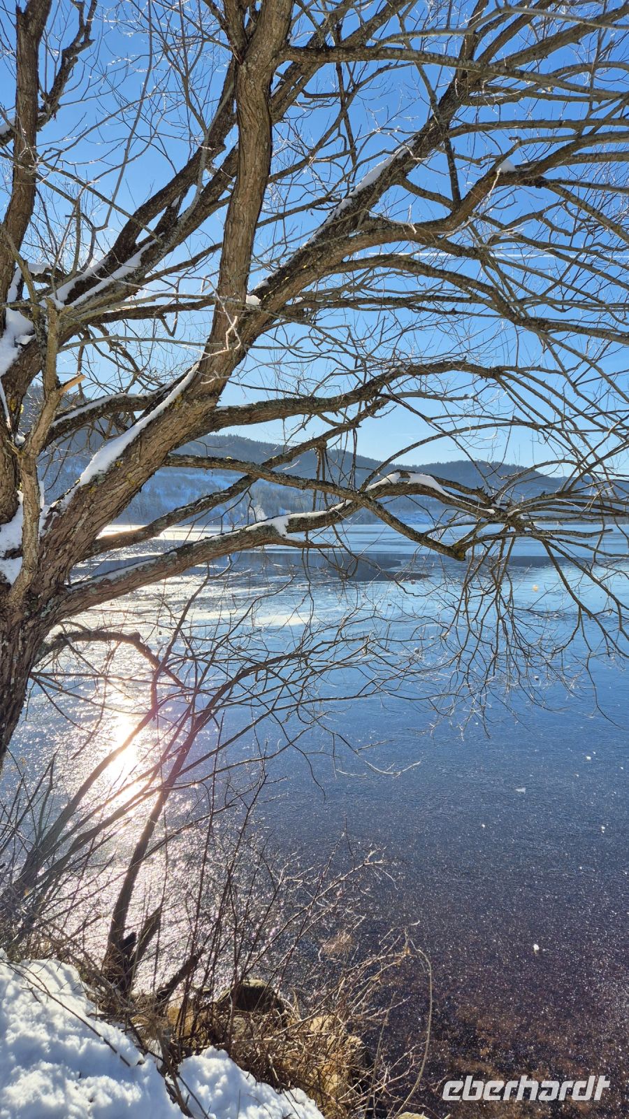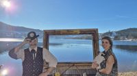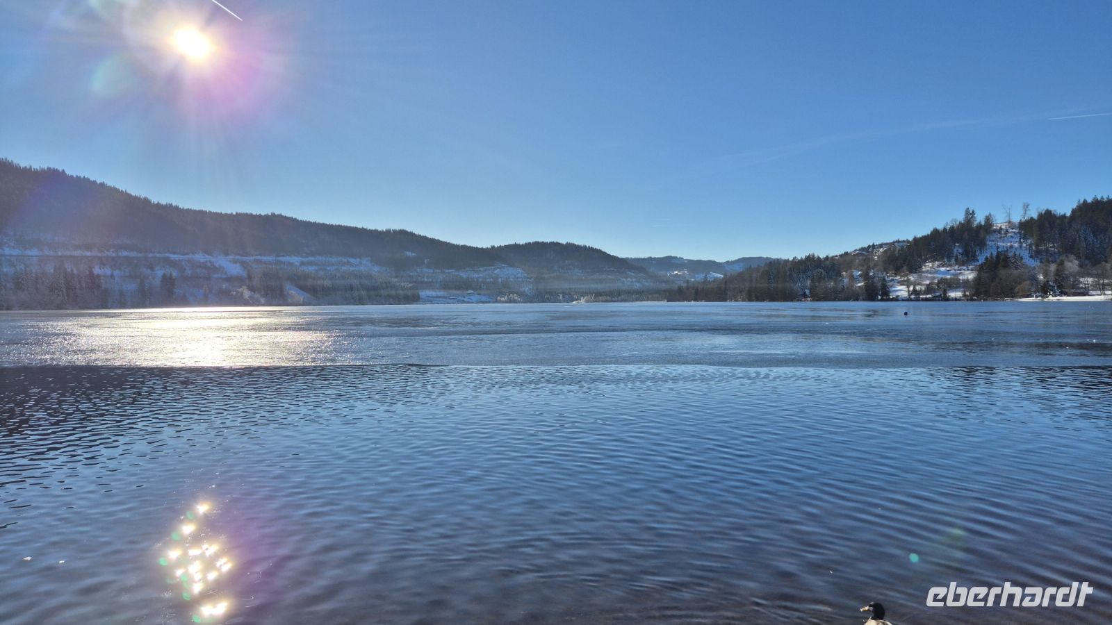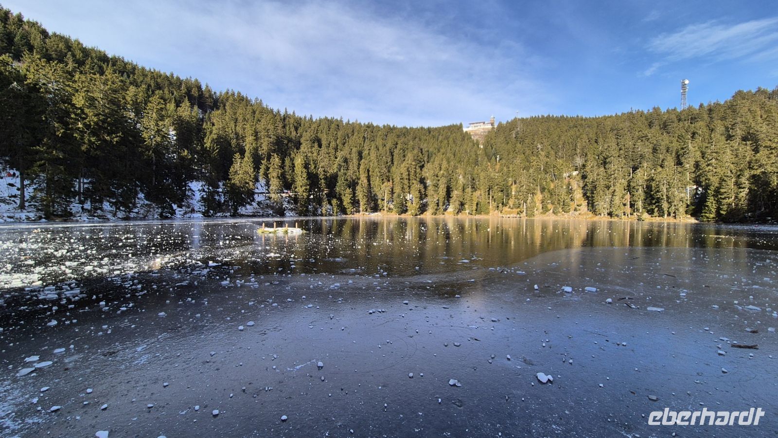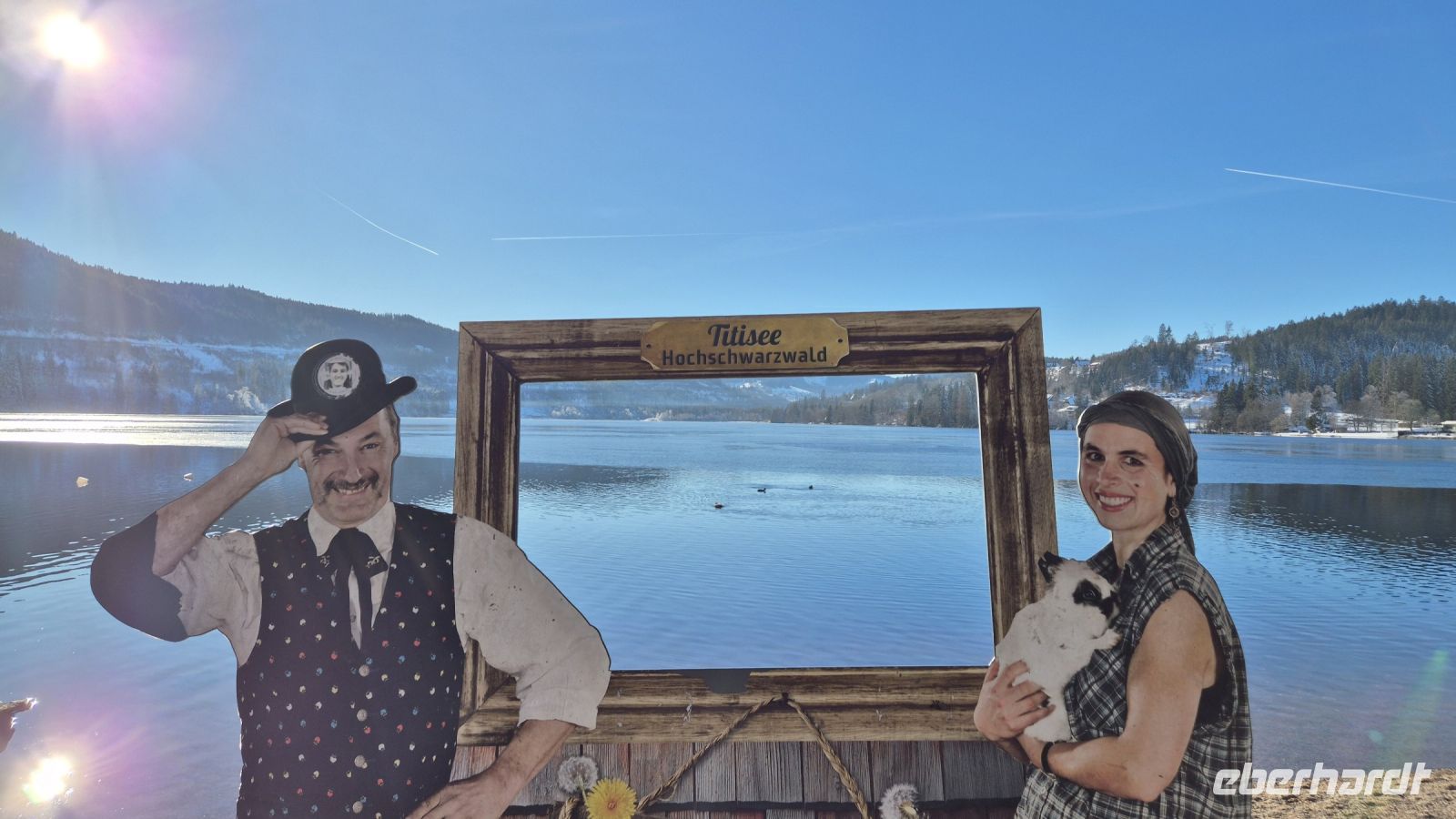 Bei dem herrlichen Wetter heute sind wir natürlich nicht die einzigen, die auf die Idee gekommen sind, in den Schnee zu fahren und so ist unterhalb des Gipfels eine ganze Menge los und der Skibetrieb in vollem Gange. Leider führt das auch dazu, dass wir mit unserem Bus keine Chance haben, einen Parkplatz zu finden, sodass wir uns mit einem kurzen Fotostopp begnügen müssen. Wir machen jedoch aus der Not eine Tugend und starten zu Plan B: wir fahren zum Titisee. Der etwa 1 km² große See ist eines der beliebtesten Ausflugsziele im Hochschwarzwald und Schauplatz verschiedenster Legenden. Die berühmteste von ihnen ist, dass die neugeborenen Kinder aus dem Gewässer kommen sollen. Dies ist auch eine der vielen Erklärungen für die Namensherkunft. Bei wunderbarem Sonnenschein haben wir hier die Möglichkeit, einen Spaziergang zu machen oder eine Kleinigkeit zu Mittag zu essen.