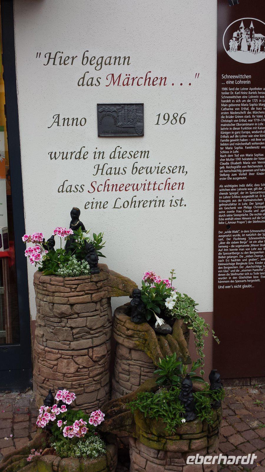 Lohr ist ebenfalls bekannt als „ Schneewittchenstadt" .1986 bemerkten ein Apotheker, Karl Heinz Bartels ,mit seinen Stammtischbrüdern, dass sich in dem Märchen Bezugspunkte zu Lohr und zum Spessart befinden sollen und er stellte die These auf, dass Schneewittchen eine Lohrerin gewesen sein muss. Natürlich nutzt nun die Stadt Lohr diese These für ihr Tourismuskonzept und begann damit zu werben, was wohl auch gelingt. Im Spessartmuseum und auch in der Stadt findet man immer wieder Bezugspunkte dazu, z.B. der Schneewittchenbrunnen neben der Marienapotheke. Es gibt sogar einen Schneewittchenwanderweg, der dem Fluchtweg Schneewittchens vor der bösen Königin entsprechen soll.