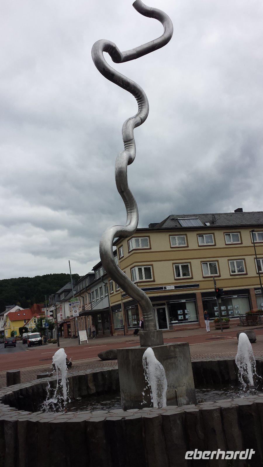 Günther führte uns an diversen Brunnen der Stadt vorbei, u.a. zum sogenannten Schlangenbrunnen am Untertorplatz, der die Stelle des früheren Untertors markiert, im Betonpflaster sieht man einen Streifen aus Naturstein, der den Verlauf der früheren Stadtmauer zeigt. Wir sahen das Goldene Rad, ehemalige Gastwirtschaft, in der der Gründer des Bades Leopld Koch seine Frau kennnenlernte, den Wendelinbrunnen ( St. Wendelin wird als Hirte mit einer Kuh dargestellt).