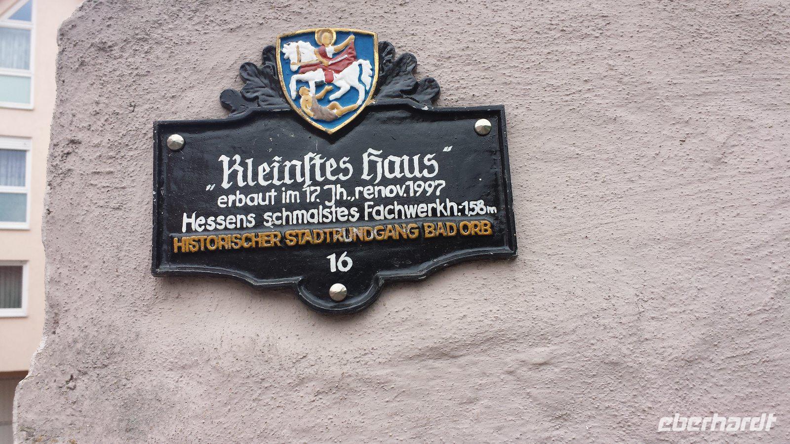 Auch das schmalste Fachwerkhaus von Hessen bestaunten wir in Bad Orb in der Kirchgasse, es mißt an einer Fassenseite nur eine Breite 1,58 m,seit 2014 befindet sich darin ein Museum, zeigt Werke von Helmut Jahn, der bis zu seinem Tod dort wohnte.