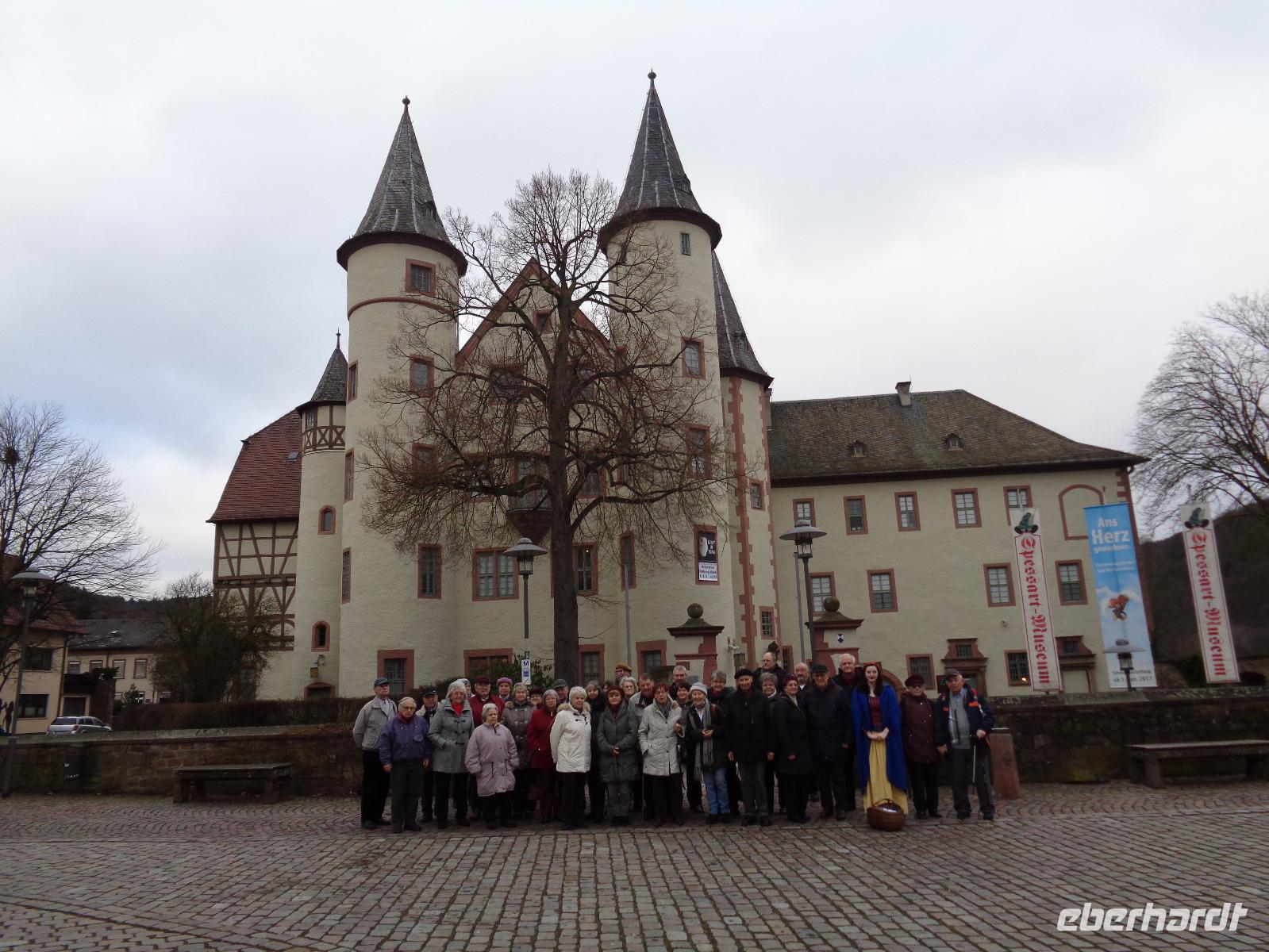 Heute am 1. Weihnachtsfeiertag führte uns die Reise über Großheubach, gekrönt vom Kloster Engelberg, nach Lohr. Es wird erzählt, dass "Schneewittchen" hier im Schloss zu Lohr das Licht der Welt erblickt haben soll und dafür spricht immerhin so einiges, wie uns Katrin bereits auf der Fahrt berichtete... Diese Märchengestalt lernten wir dann schließlich auch höchstpersönlich kennen, denn Schneewittchen empfing uns direkt am Schloss mit ihren Äpfeln. Zum Glück war kein giftiger Apfel dabei! Schneewittchen plauderte mit uns über ihr Leben und sie verabschiedete sich herzlich, bevor es für uns mit einer geführten Besichtigung durch das Spessartmuseum weiter ging. Das ist nämlich bereits seit 1972 im Schloss untergebracht und eine wahre Schatzkammer des Spessarts, gespickt mit viel Geschichte und wunderbaren Geschichten. Es gibt verschiedene Ausstellungen, die sich natürlich auch unterschiedlichen Themen widmen. So kamen wir beispielsweise immer wieder auf das Märchen der Gebrüder Grimm, "Schneewittchen", zurück. Wie heißt es so schön: "Spieglein, Spieglein an der Wand ..." - hier im Lohrer Schloss beginnt eben ein echtes Märchen! Im Anschluss an diese erlebnisreiche Führung verblieb noch etwas Freizeit, denn ein kleiner Spaziergang durch die Lohrer Altstadt rundete unseren hiesigen Aufenthalt ab. Nun stand aber auch noch die bekannteste Sehenswürdigkeit des Spessarts auf unserem Programm, das gut 600 Jahre alte Schloss Mespelbrunn! Leider ist dieses im Winter geschlossen und somit war für uns zu dieser Jahreszeit keine Innenbesichtigung möglich! Zugegeben, es liegt etwas versteckt in einem abgelegenen Seitental des Elsava-Tals, aber seit dem Erscheinen des Film "Das Wirtshaus im Spessart" in den 1950´er Jahren mit Liselotte Pulver ist das Wasserschloss mit seinen umliegenden Wäldern so etwas wie das "Spessart-Sinnbild". Nach dem guten Essen der letzten Tage bot es sich an, mit einigen Gästen zurück zum Hotel zu spazieren - das Wetter meinte es immerhin gut mit uns und die klare Luft tat ihr übriges... Am späten Nachmittag konnten wir uns dann im Hotel auch noch den Film-Klassiker "Das Wirtshaus im Spessart" anschauen - viele Gäste genossen es, denn manch einer hatte den Film eine halbe Ewigkeit nicht mehr angesehen und so wurden immerhin alte Erinnerungen wach.