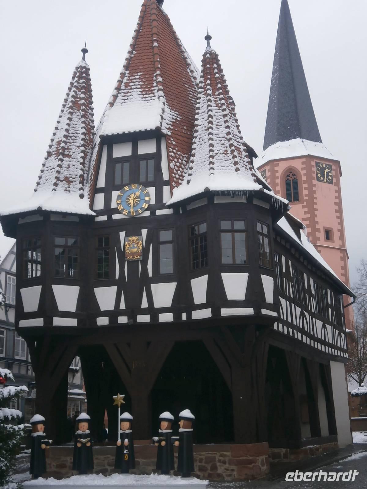 Schon geht es auf Mittag zu, und so begeben wir uns ins nahe Michelstadt. Das winzige Städtchen wartet mit einem der berühmtesten Rathäuser Deutschlands auf. Es stammt von 1484 und steht im Erdgeschoss auf einer offenen Tuchhalle aus mächtigen Eichenbalken. Nach einem kleinen Rundgang durch das Städtchen begeben sich fast alle Gäste zu Kaffee und Kuchen in die lockenden Cafés und Restaurants.