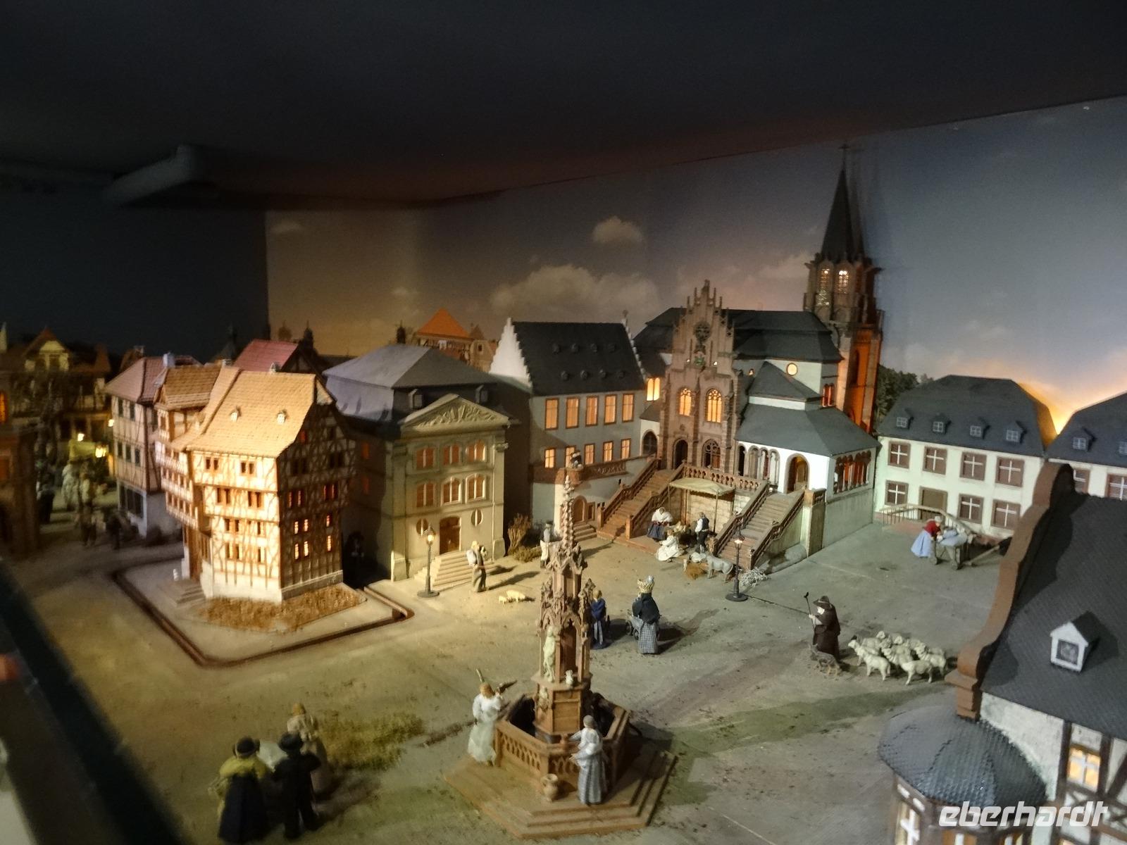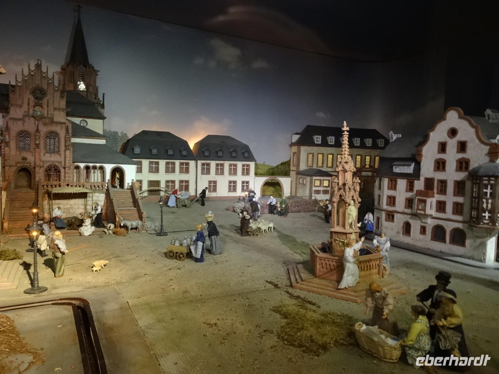 Direkt am Markt konnte der Reisebus abgestellt werden und es ging zum Schloss Johannesburg, zu Recht die bekannteste Attraktion, schon die Ansicht der rotsandsteinernen vier Gebäudeflügel faszinierte uns. Eine ehemalige Residenz der Mainzer Kurfürsten. Bereits von zwei Führern erwartet, startet die Führung im Schloss. Besonders sehenswert die weltberühmte Sammlung aus Kork. Die Modelle tragen den Namen „ROM über die Alpen getragen". Über 40 Modelle luden zum bestaunen ein. Das Größte war das Koloseum. Nicht alle Räume konnten durch Restaurierung und Umbau besichtigt werden, das hätte auch die geplante Zeit nicht erlaubt. Nach der heiligen Messe gegen 12.30 Uhr konnte noch die Stiftskirche besichtigt werde. Es gab genügend freie Zeit für die Altstadt und den Aschaffenburger Weihnachtsmarkt. Der weitere Tagespunkt war der Besuch der Krippenausstellung. Einige Gäste spazierten bei guten beständigem Wetter in Richtung Bahnhof.