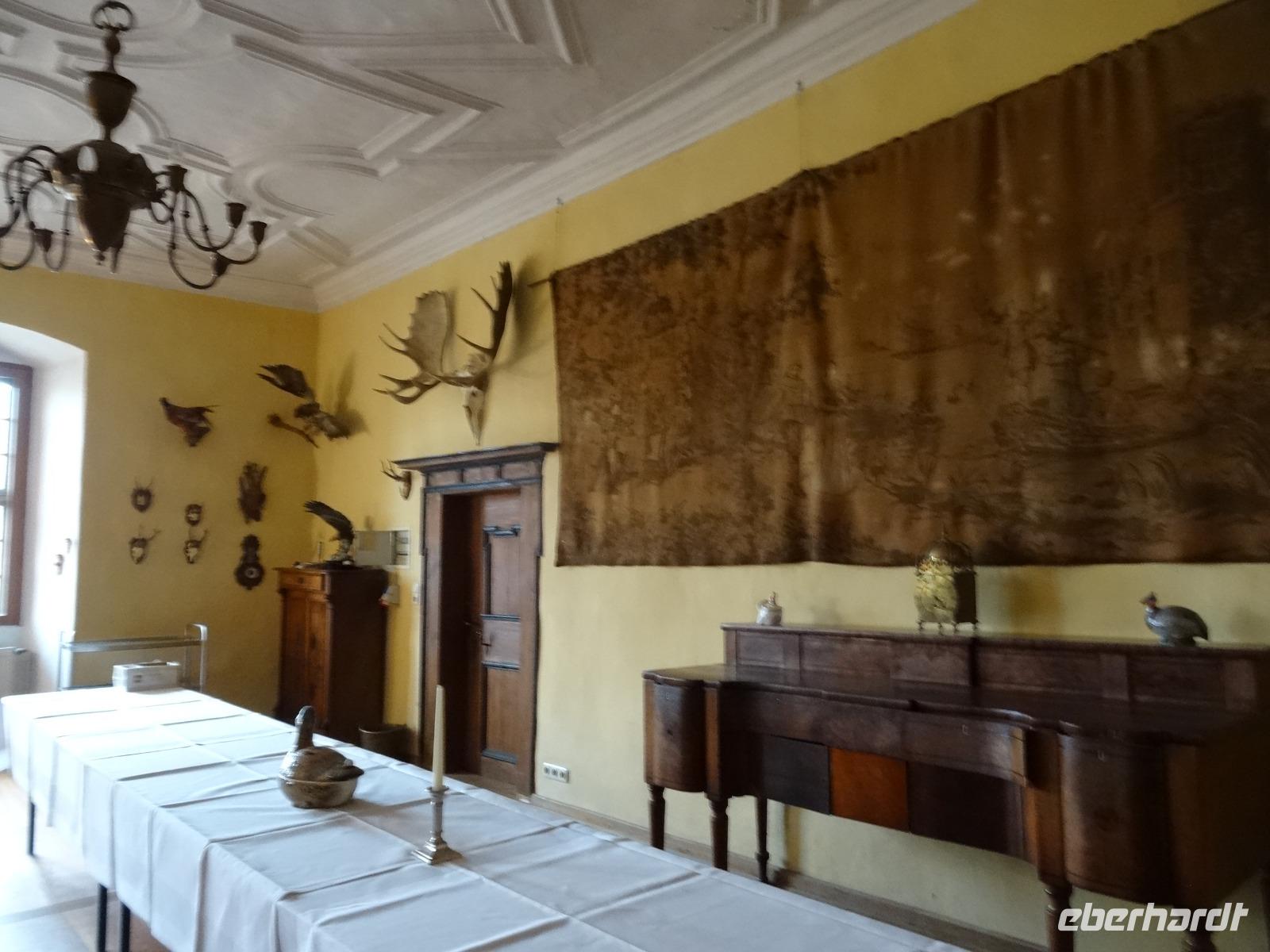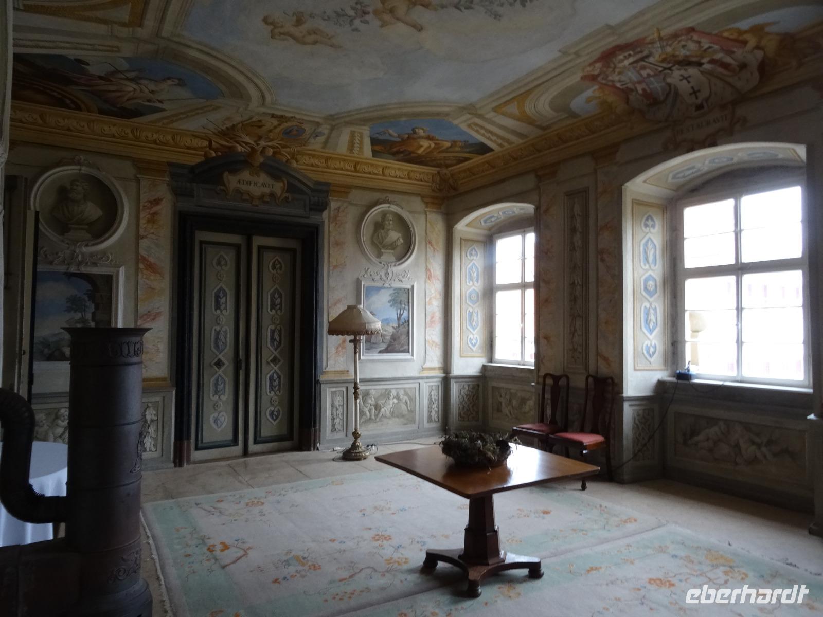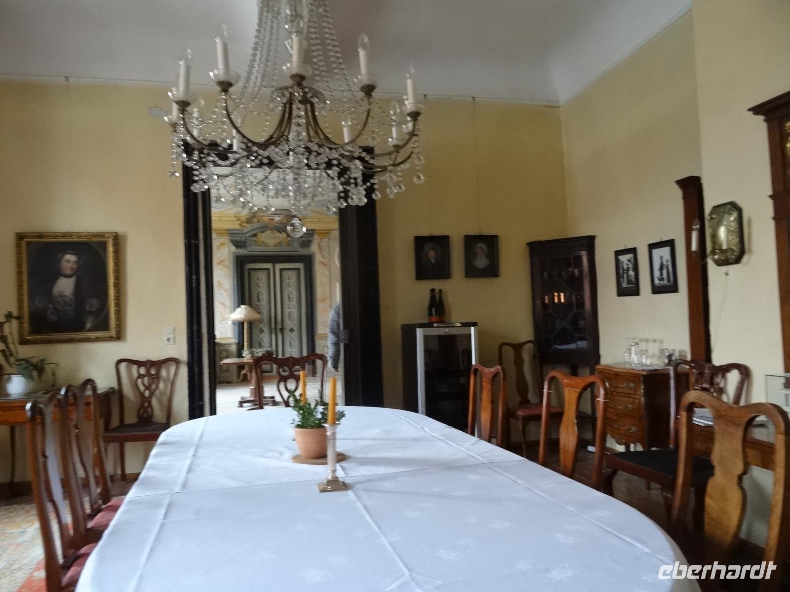 Das weihnachtlich üppige Frühstücksbuffet bot uns alles lecker an. Wir fuhren bei kühlen Temperaturen gut gelaunt los. Die Natur hatte sich über Nacht in ein leichtes weises Kleid gehüllt. Der Raureif lud unsere Blicke ein, weit über die Hügel, Täler und kleinen Orte zu schauen, teils mit einem kleinen Blick der Sonne durch den Dunst. Es war eine sehr schöne Anfahrt vorbei an Würzburg nach Zeilitzheim zum Schloss. Wir wurden von Frau von Halem erwartet. Sie berichtete uns viel über das Schloss, was bereits im 17.Jahrhundert erbaut wurde. Das Anwesen hat viele Räumlichkeiten die beim Kauf 1978 nicht im besten Zustand waren. Es gehört schon sehr viel Mut, Geschicklichkeit und Enthusiasmus dazu, so ein Objekt zu übernehmen. Frau von Halem berichtet uns viel über die Baugeschichte von damals bis heute. Wir besichtigten einige Zimmer und Säle mit wunderbar erhaltener Stuckarbeit.