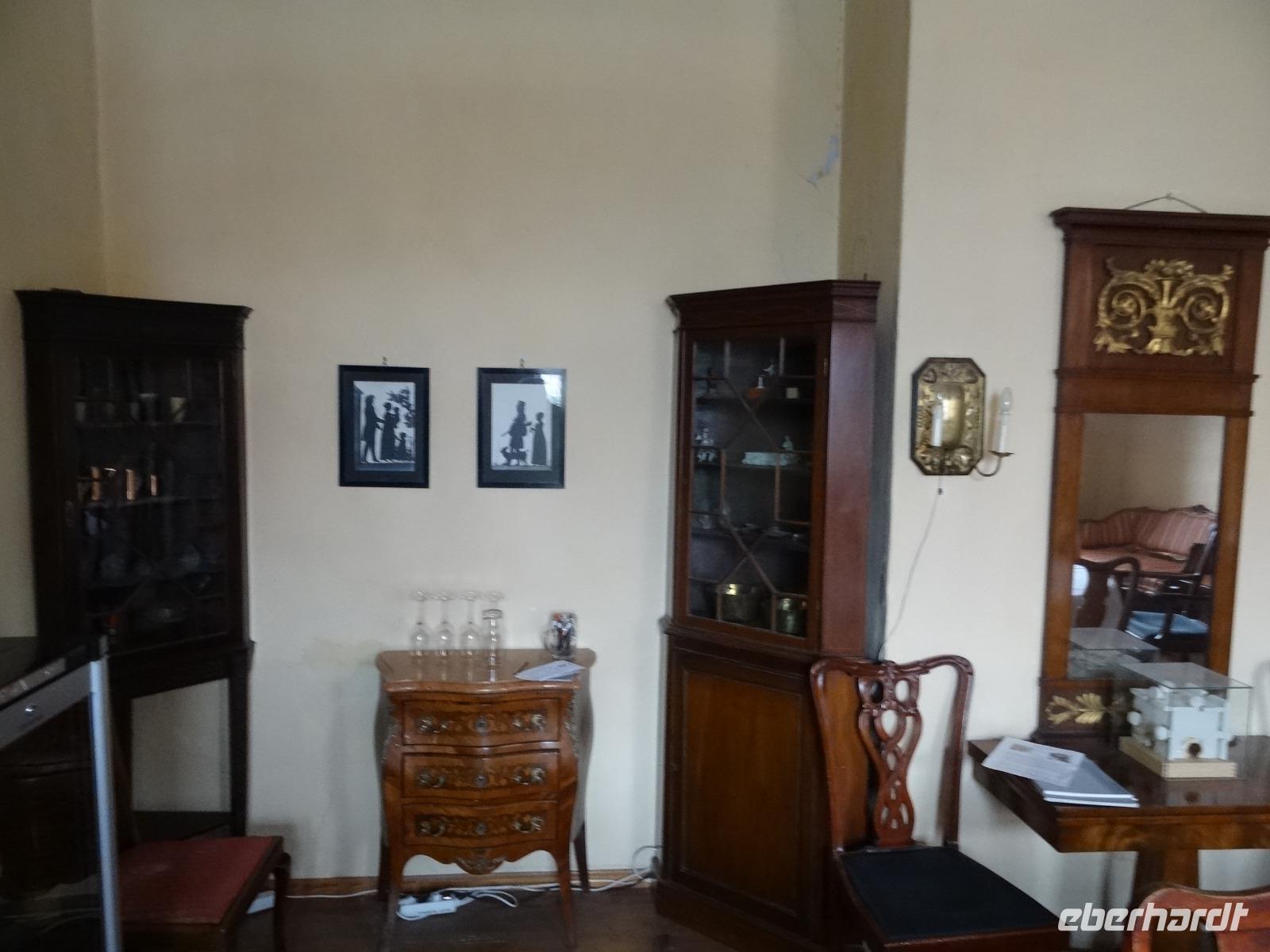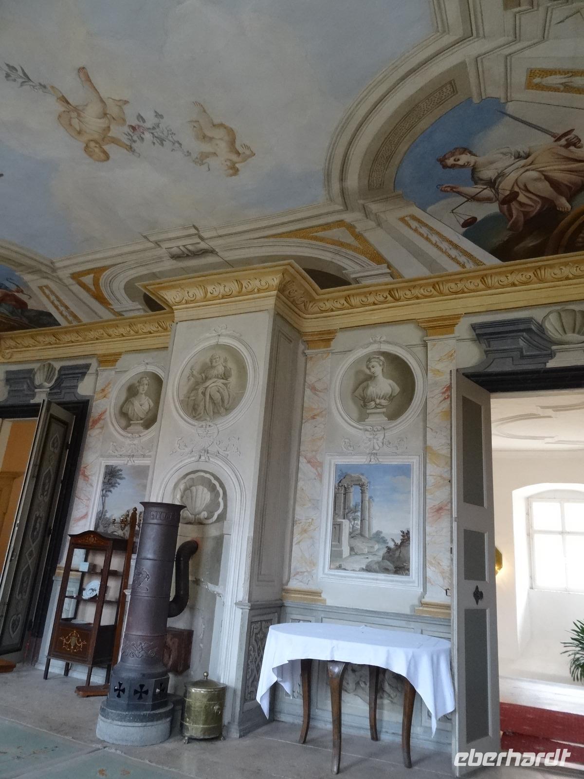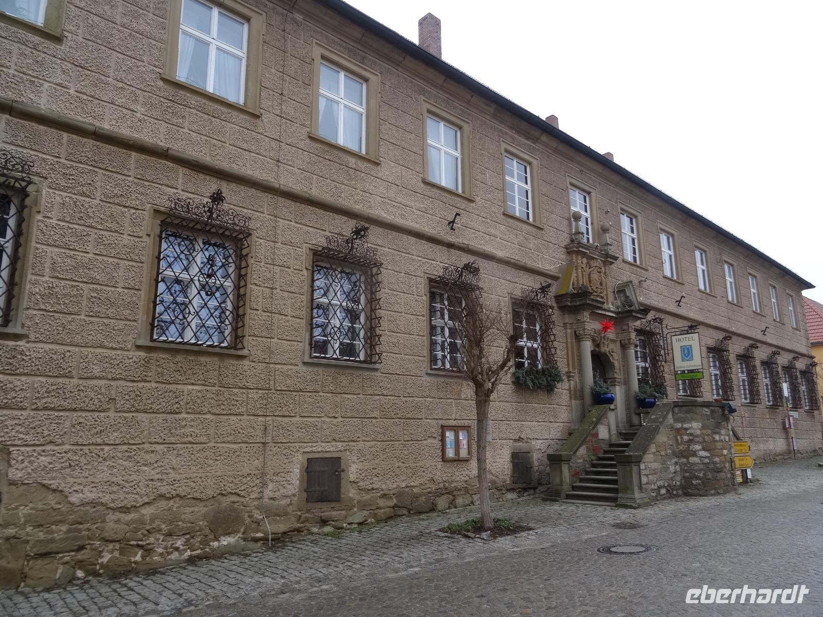 Das weihnachtlich üppige Frühstücksbuffet bot uns alles lecker an. Wir fuhren bei kühlen Temperaturen gut gelaunt los. Die Natur hatte sich über Nacht in ein leichtes weises Kleid gehüllt. Der Raureif lud unsere Blicke ein, weit über die Hügel, Täler und kleinen Orte zu schauen, teils mit einem kleinen Blick der Sonne durch den Dunst. Es war eine sehr schöne Anfahrt vorbei an Würzburg nach Zeilitzheim zum Schloss. Wir wurden von Frau von Halem erwartet. Sie berichtete uns viel über das Schloss, was bereits im 17.Jahrhundert erbaut wurde. Das Anwesen hat viele Räumlichkeiten die beim Kauf 1978 nicht im besten Zustand waren. Es gehört schon sehr viel Mut, Geschicklichkeit und Enthusiasmus dazu, so ein Objekt zu übernehmen. Frau von Halem berichtet uns viel über die Baugeschichte von damals bis heute. Wir besichtigten einige Zimmer und Säle mit wunderbar erhaltener Stuckarbeit.