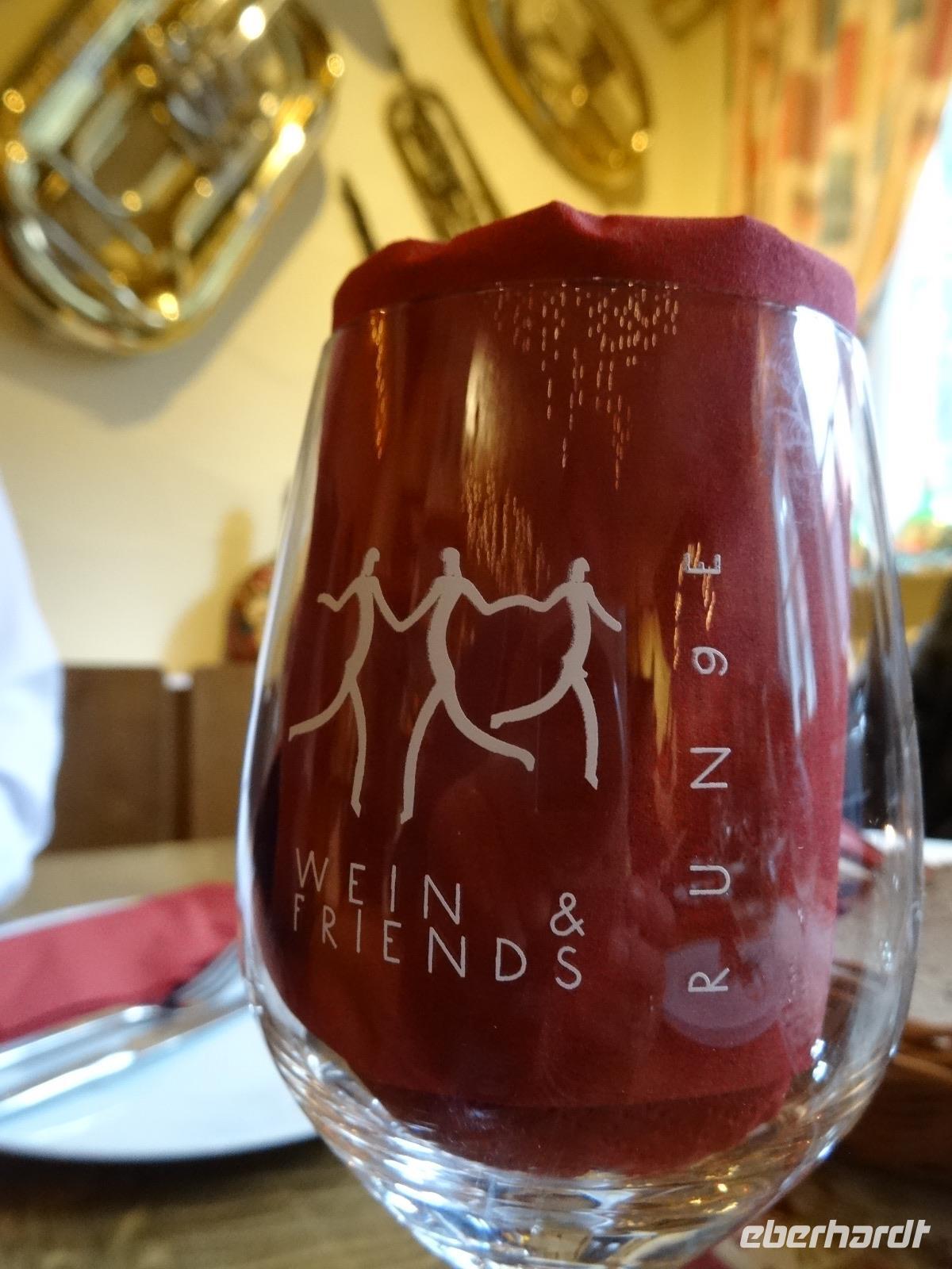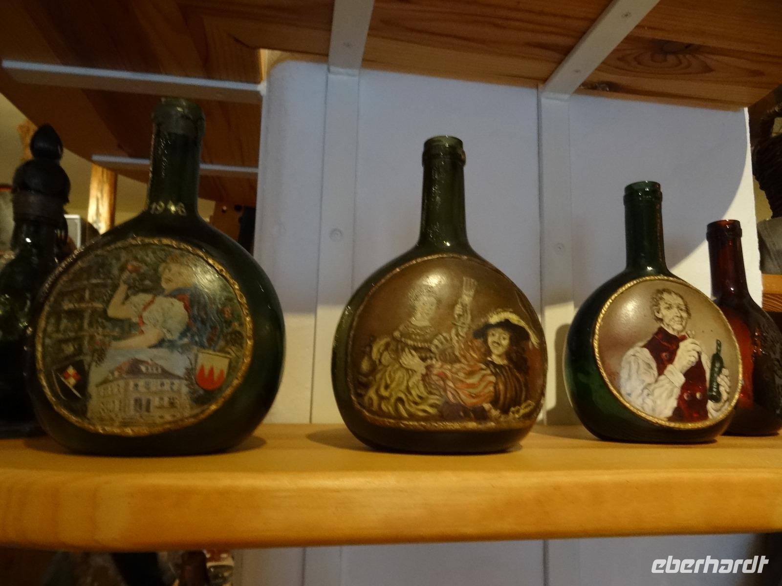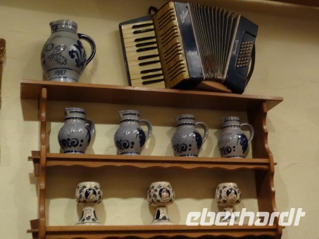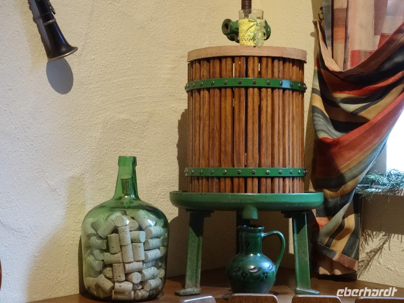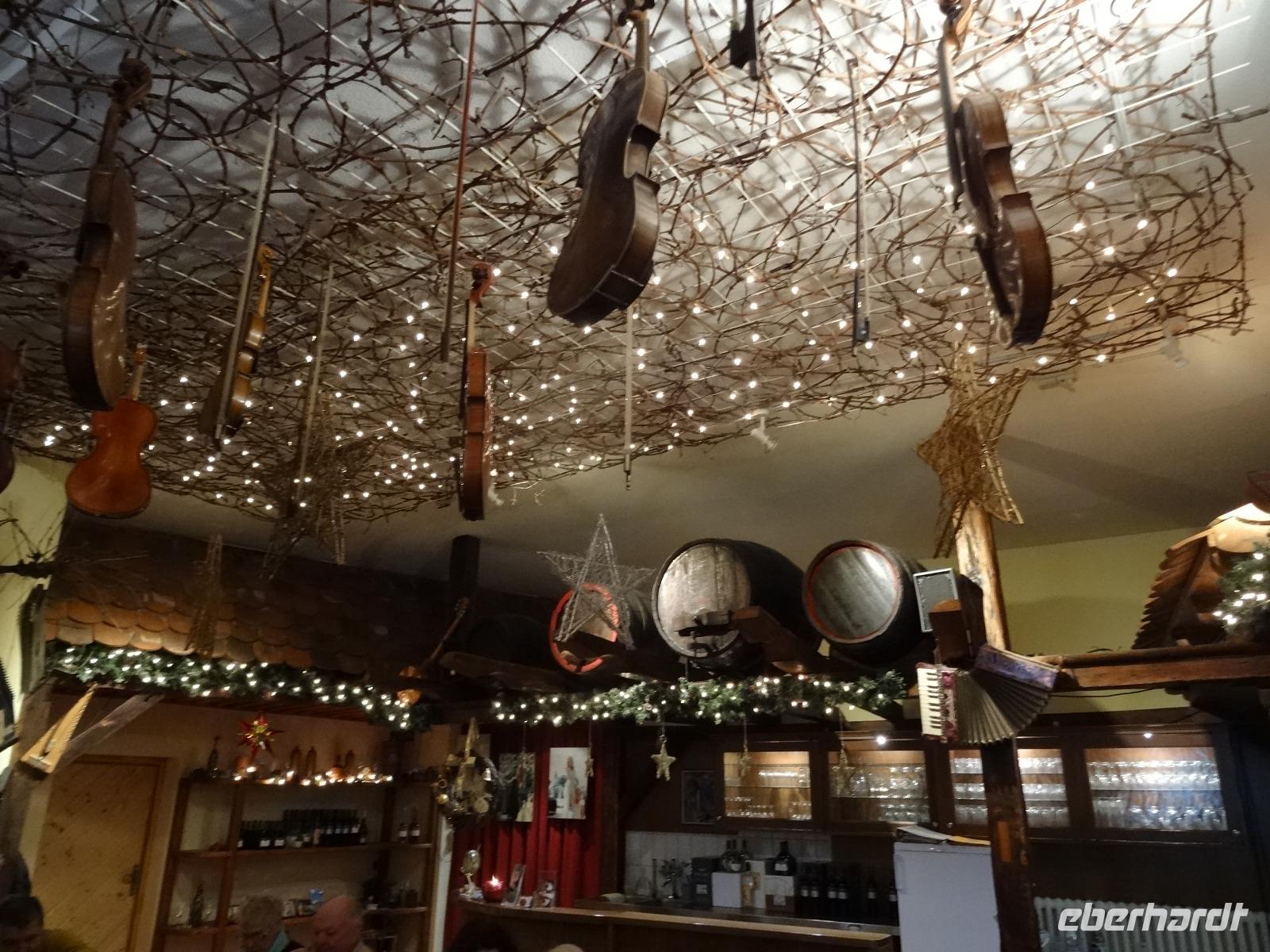 Es wurde Mittagszeit und es folgte ein gemütlicher Abschluss der Weihnachtsreise beim Weingut Runge in Dürrfeld. Eine wunderbare Weinstube erwartete uns. Über uns hingen im wahrsten Wort „der Himmel voller Geigen". Es gab für uns eine leckere Steigerwälder Hackerbrotzeit. Das war auch wichtig für die darauffolgende Weinprobe.