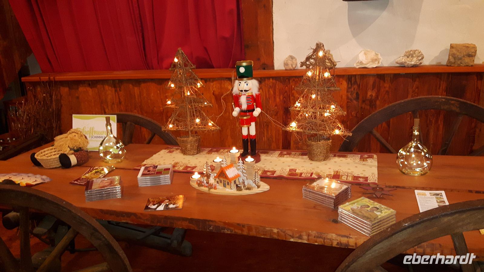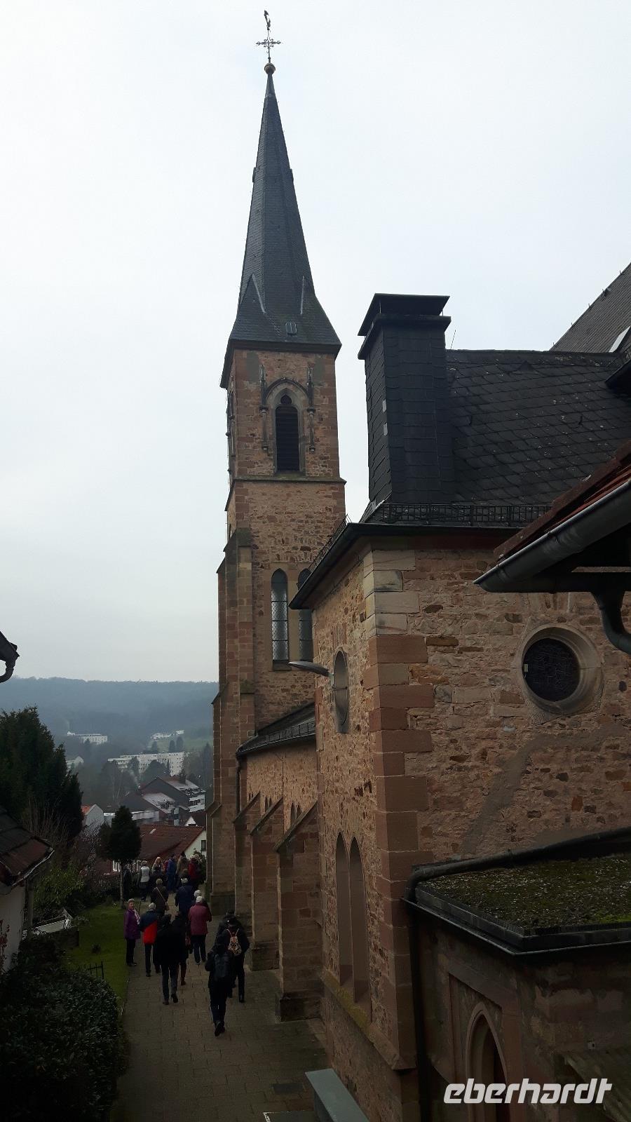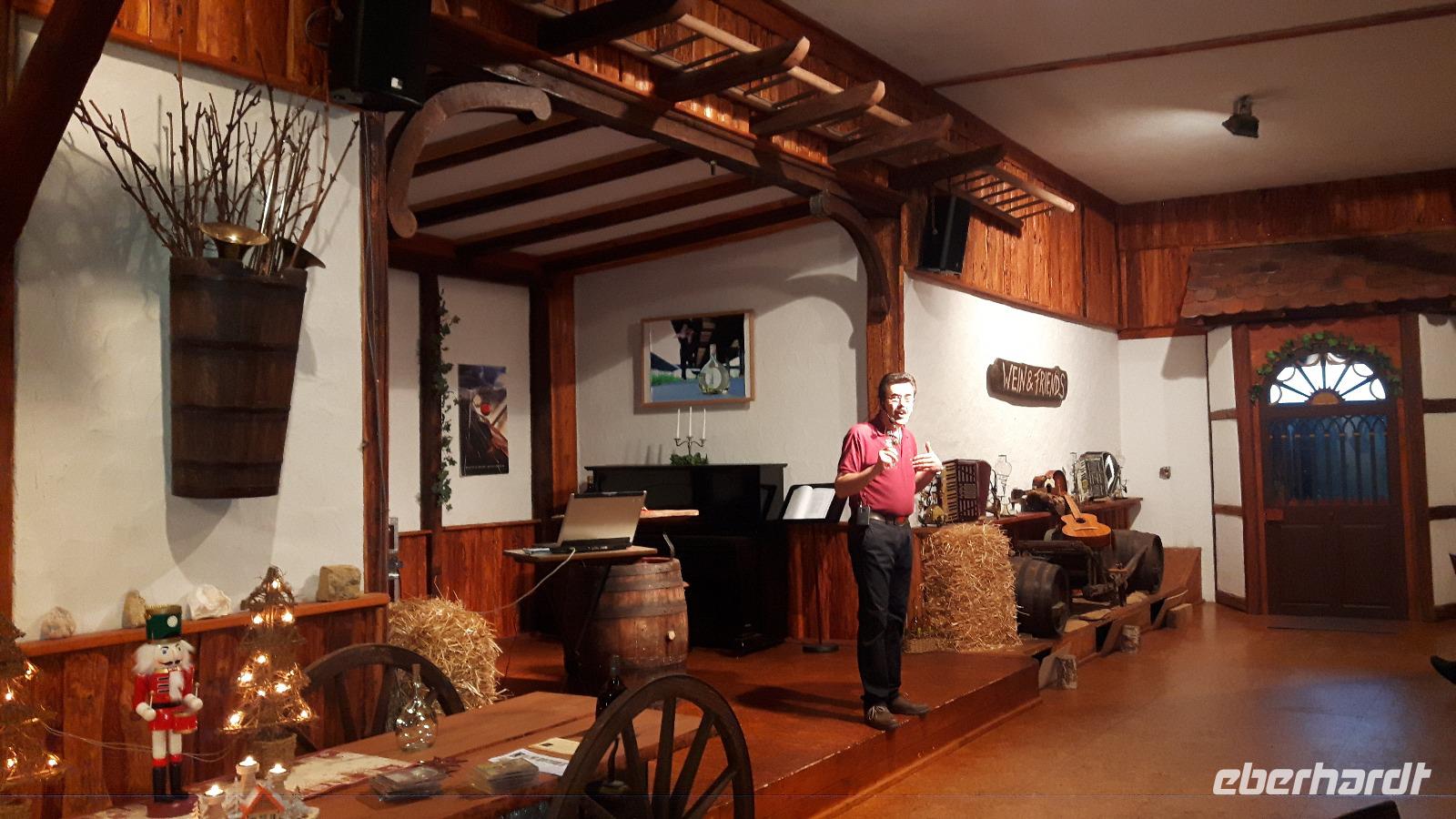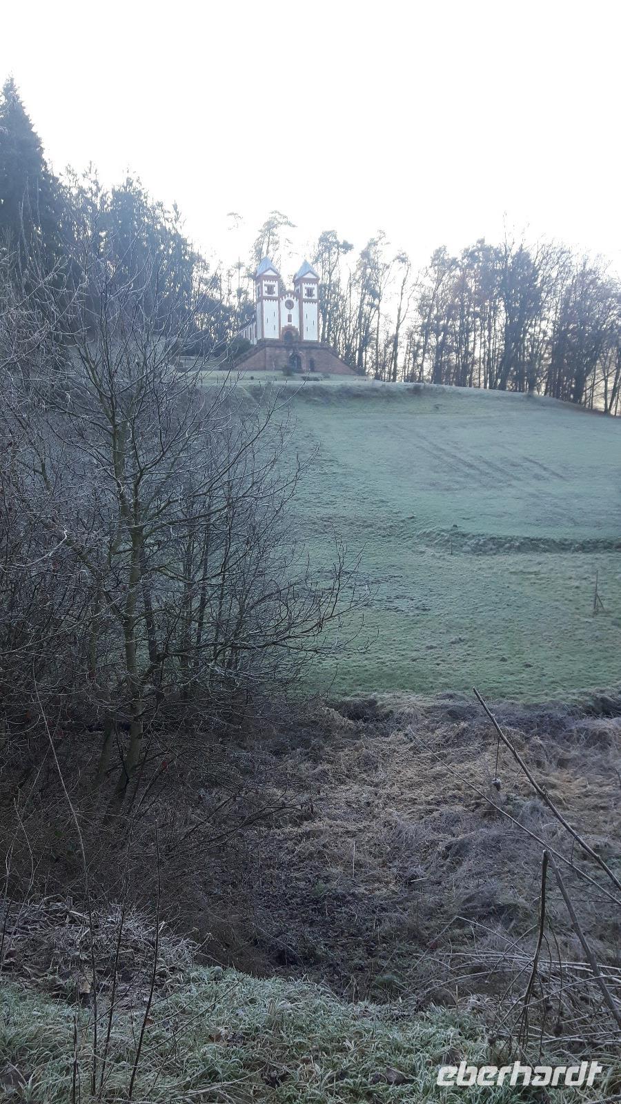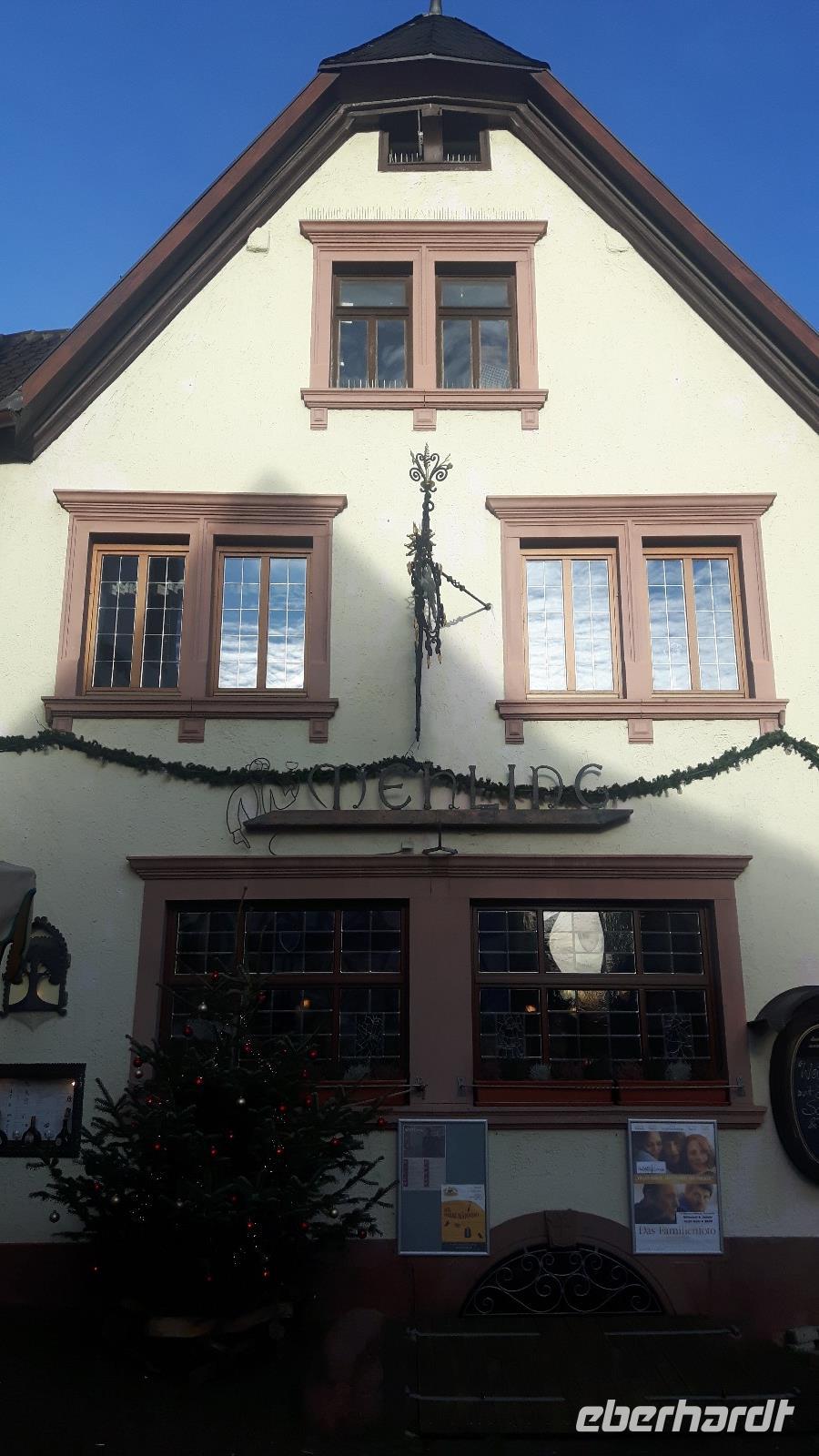 Frisch und munter trafen sich am Neujahrsmorgen einige Gäste zusammen mit Katrin und Antonia zu einer fakultativen Wanderung zum Wasserschloss Mespelbrunn. Natürlich durfte auf dem Weg eine kleine Wegzehrung nicht fehlen. Auf dem Weg zum Schloss kamen wir an der Basilika St. Maria Schnee - Gruftkapelle vom Wasserschloss Mespelbrunn vorbei. Wieder im Hotel angekommen, machten wir uns kurz frisch bevor wir zum singenden Winzer Gerhard Runge fuhren. An vereisten Weinfeldern und Wäldern vorbei, kamen wir gegen 14 Uhr am Weingut Runge an. Bei gutem Wein, toller Musik und einer genussvollen Häckerbrotzeit genossen wir den ersten Tag 2020. Gegen 19:30 Uhr trafen wir uns wieder zum gemeinsamen Abendessen und wer mochte, konnte noch einmal den Film „das Wirtshaus im Spessart" ansehen.