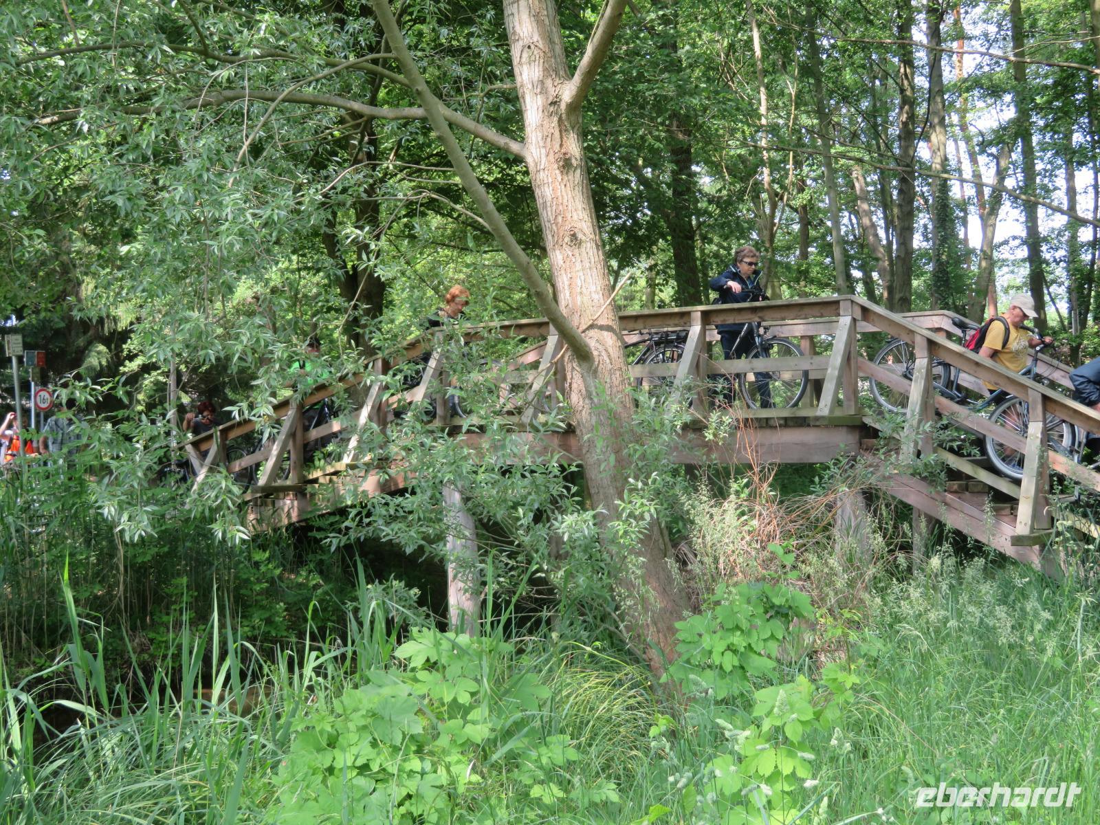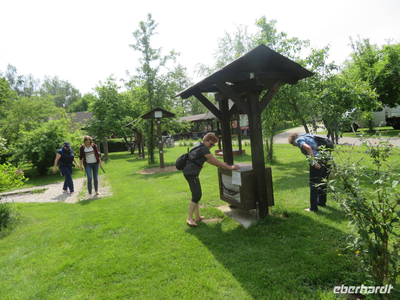 In Burg angekommen, brachte ich einige Gäste zur Spreewald-Therme. Der Großteil unserer Single-Gruppe hatte sich aber für die Radtour entschieden, und so ließen wir uns die bestellten Leihräder in der Radlerscheune von den Fahrrad-Experten für jeden Reisegast individuell anpassen. Das Wetter war ideal für eine Radtour durch den Spreewald! Vom Radverleih starteten wir also gemeinsam entlang des Gurkenradweges, der direkt an der Radlerscheune vorbei führt. Wir fuhren in gemütlichem Tempo, sodass jeder ohne große Anstrengung mitfahren konnte. Auf Radwegen mit keinem oder nur wenig Autoverkehr konnten wir ganz entspannt und sicher fahren. Es ging entlang der idyllischen Fließe und Wasserwege, auf denen uns Paddler oder Kahnfahrer heiter zuwinkten. Ab und an wurde eine Holzbrücke überquert, eine Pferdeweide oder ein Storchennest passiert. Für das Auge gab es reichlich zu sehen und die Seele konnte baumeln. Bei einer Rastpause am Barfuß-Park ließen wir uns ein kühles Getränk oder Eis schmecken. Und wer wollte, konnte Socken und Schuhe ausziehen und seinen Füßen etwas Gutes tun beim Rundgang durch den Barfuß-Parcours. Vorbei an der Radduscher Buschmühle, welche direkt am Südumfluter der Spree liegt, und der Dubkow-Mühle, wo wir ein Wehr überquerten, ging es weiter zum Spreewald-Dorf Leipe.