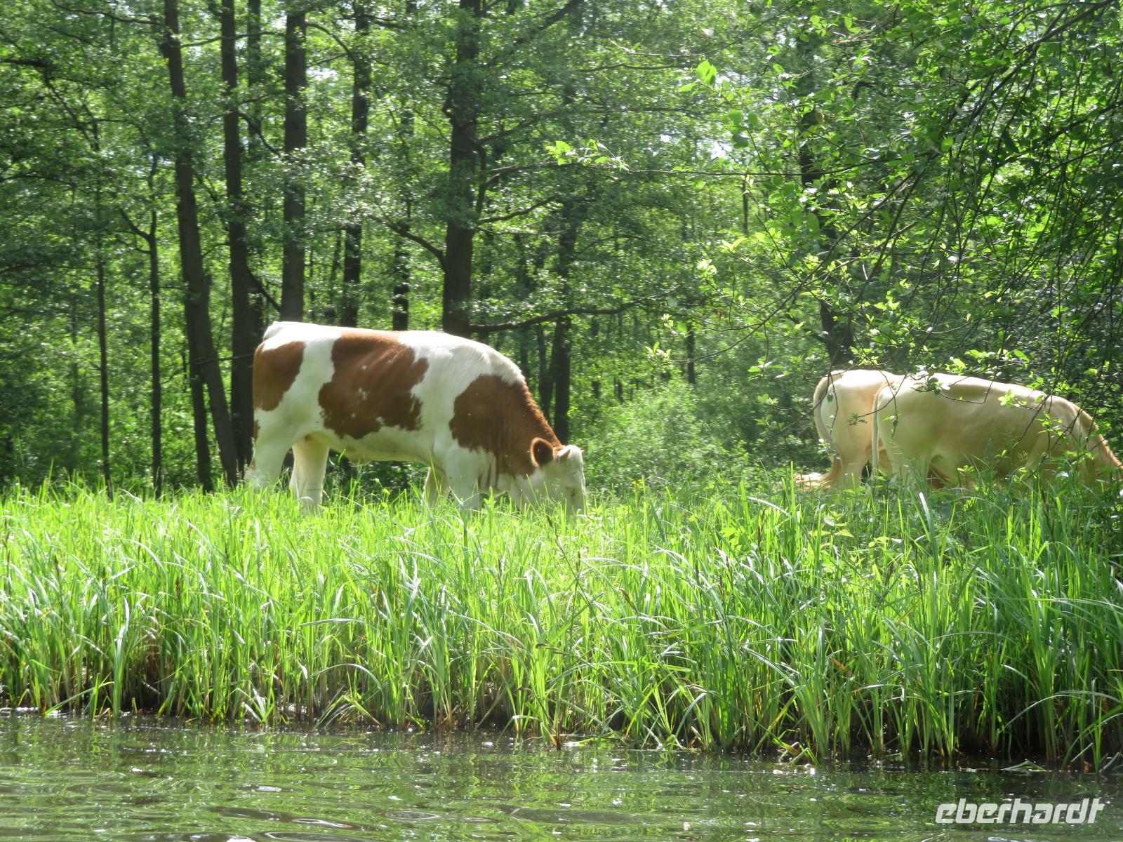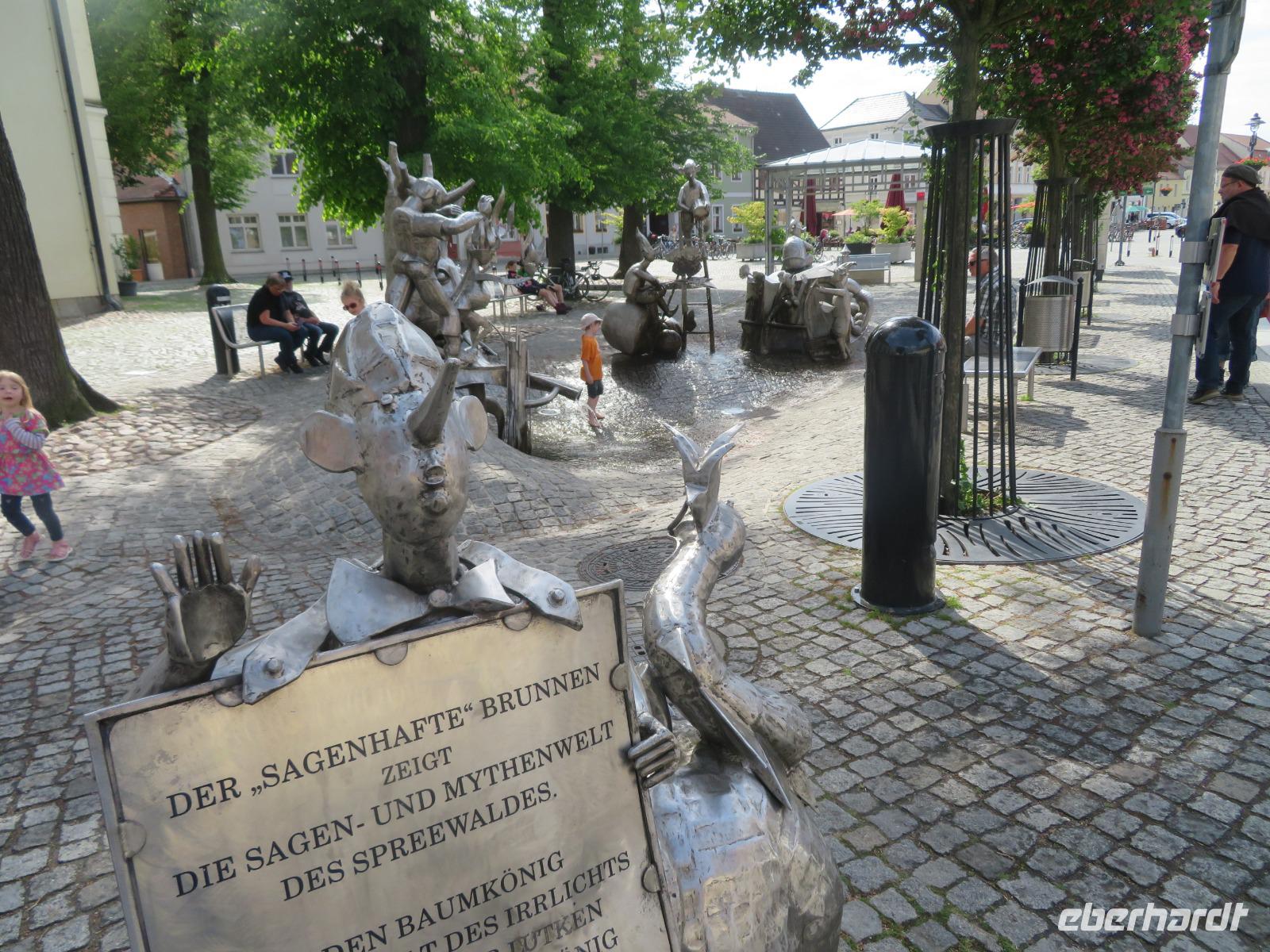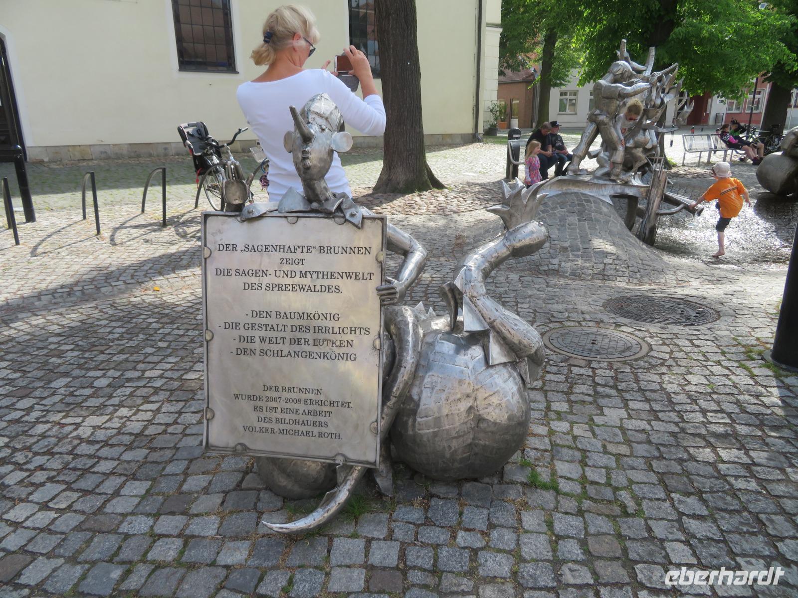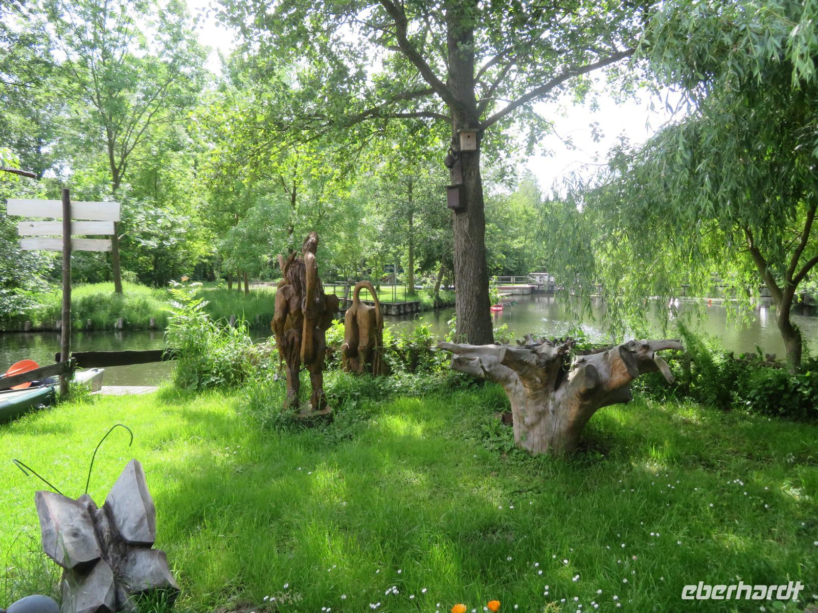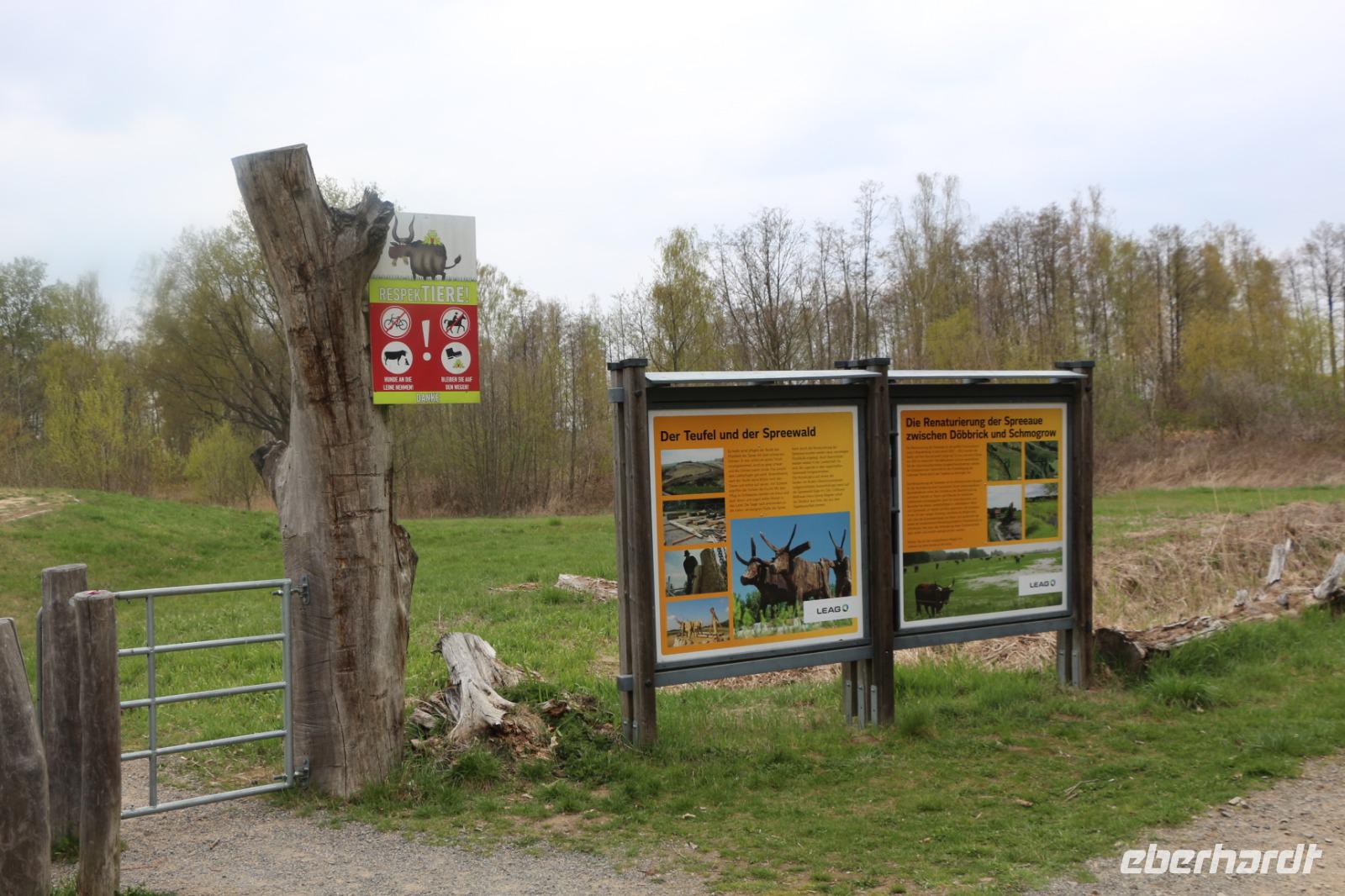Hier unternahmen wir einen Spaziergang zum Teufelsberg, auf dem die Sagengestalt des Teufels mit seinem Ochsengespann als große Holzskulptur thront. Der Sage nach, soll er den Spreewald geschaffen haben. Am Fuße des kleinen Hügels liegt das Aueroxenreservat der Spreeaue. Hier werden die Urrinder, die vor Hunderten von Jahren diesen Landstrich besiedelt haben, in einer Freilandherde nachgezüchtet.