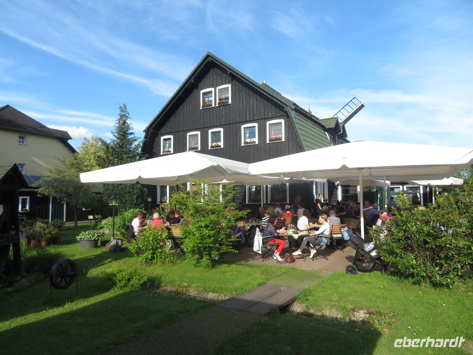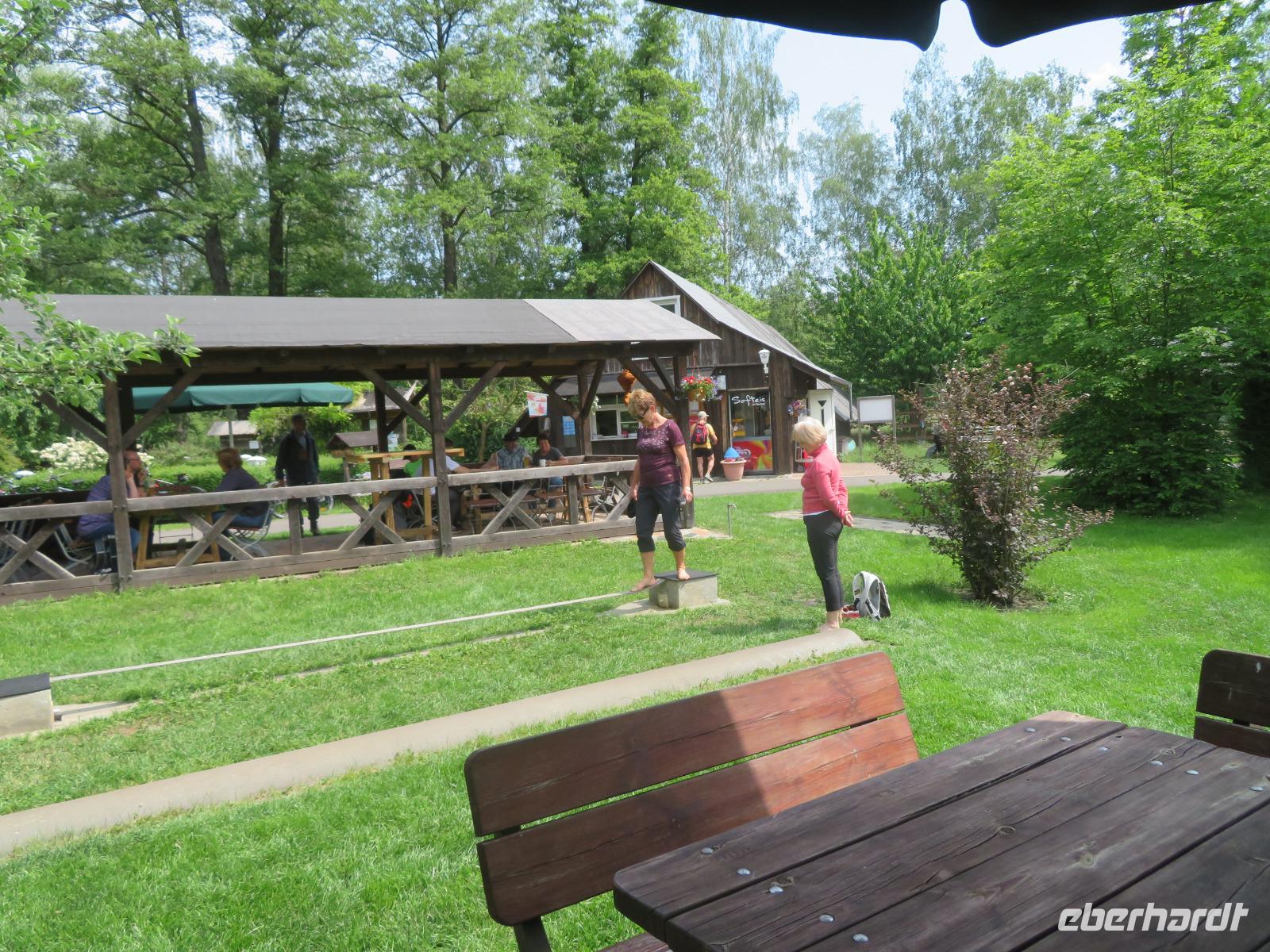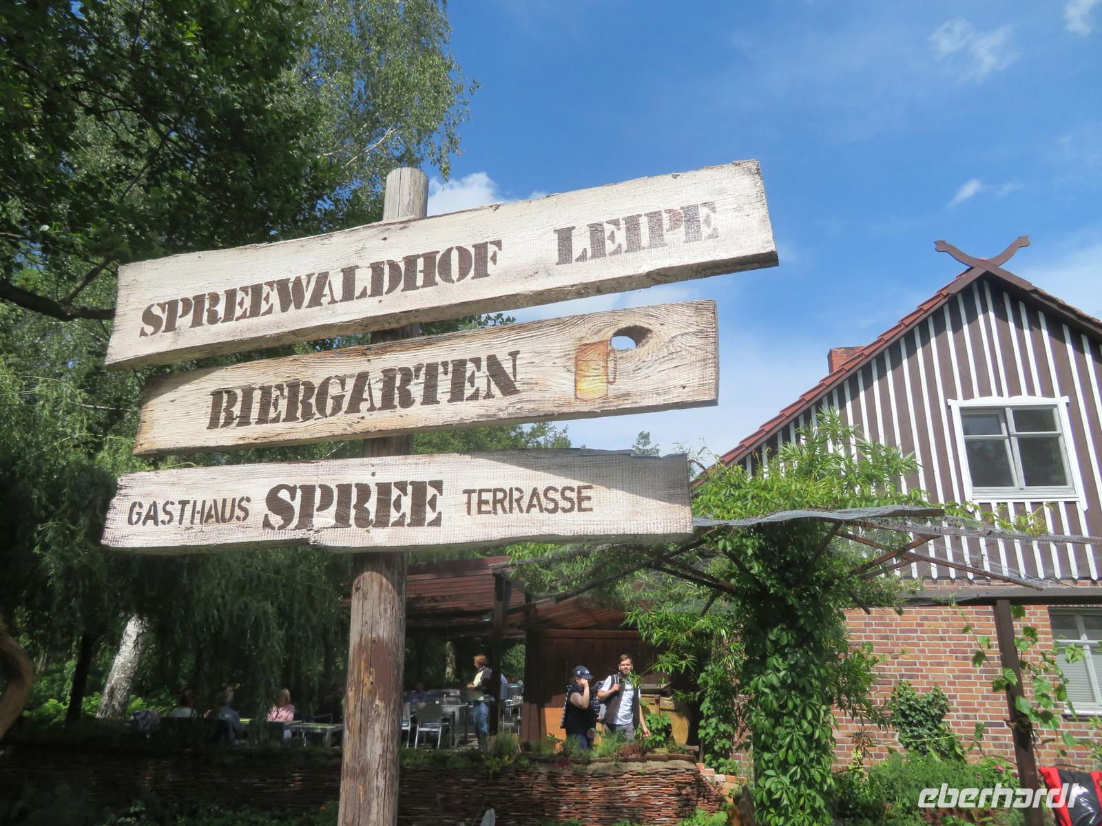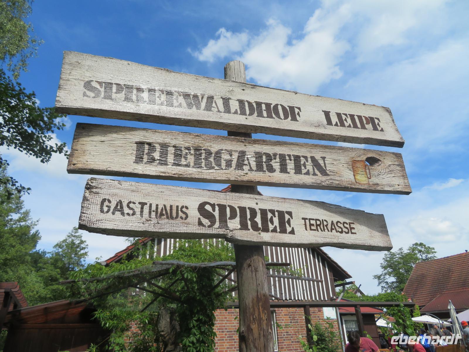 Auf einer Insel gelegen, war der Ort früher nur per Boot oder Fahrrad erreichbar. Heute gibt es zwar auch eine kleine Straße, aber dennoch geht es in Leipe noch sehr ruhig und idyllisch zu - abgesehen von den vielen Besuchern, Paddlern und Radlern, die zur Mittagszeit hier gern Rast machen. So auch wir! Wir kehrten zur Mittagspause im Biergarten des Spreewaldhofes ein, wo uns der redsame und gesellige Wirt bereits Tische reserviert hatte. Bei einem kühlen Getränk, einem Fischgericht oder Schnitzel mit Spargel ließen wir es uns gut gehen. Dann schwangen wir uns wieder aufs Fahrrad und radelten auf dem Spree-Fernradweg nochmals eine gute Stunde von Leipe zurück nach Burg. Beim Fahrradverleih gaben wir unsere Räder ab und bummelten zu Fuß noch einmal durch den Kur- und Sagenpark von Burg, in dem typische Sagengestalten aus dem Spreewald mit ihren Geschichten zu finden sind. Zum frühen Abendessen kehrten wir in das bekannteste Restaurant am Platze ein - den Kräutermühlenhof, der sich in einem traditionellen Spreewälder Holzbohlenhof befindet. Bei tollem Wetter konnten wir im Biergarten sitzen, der wie üblich, sehr gut besucht war. Zum Glück hatten wir für unsere Reisegruppe Tische reserviert. Am Abend holten uns unsere Transferfahrer in Burg ab und fuhren uns zurück zum Hotel in Bersteland. Einige Reisegäste trafen sich noch zum Absacker an der Hotelbar.
