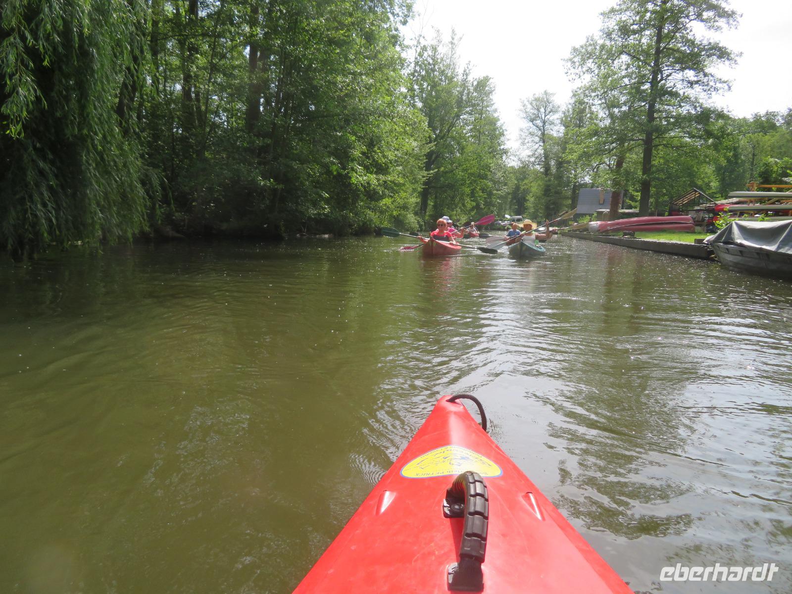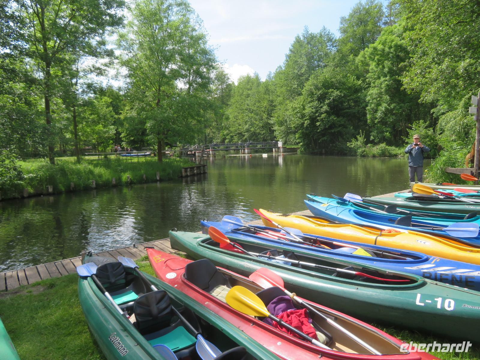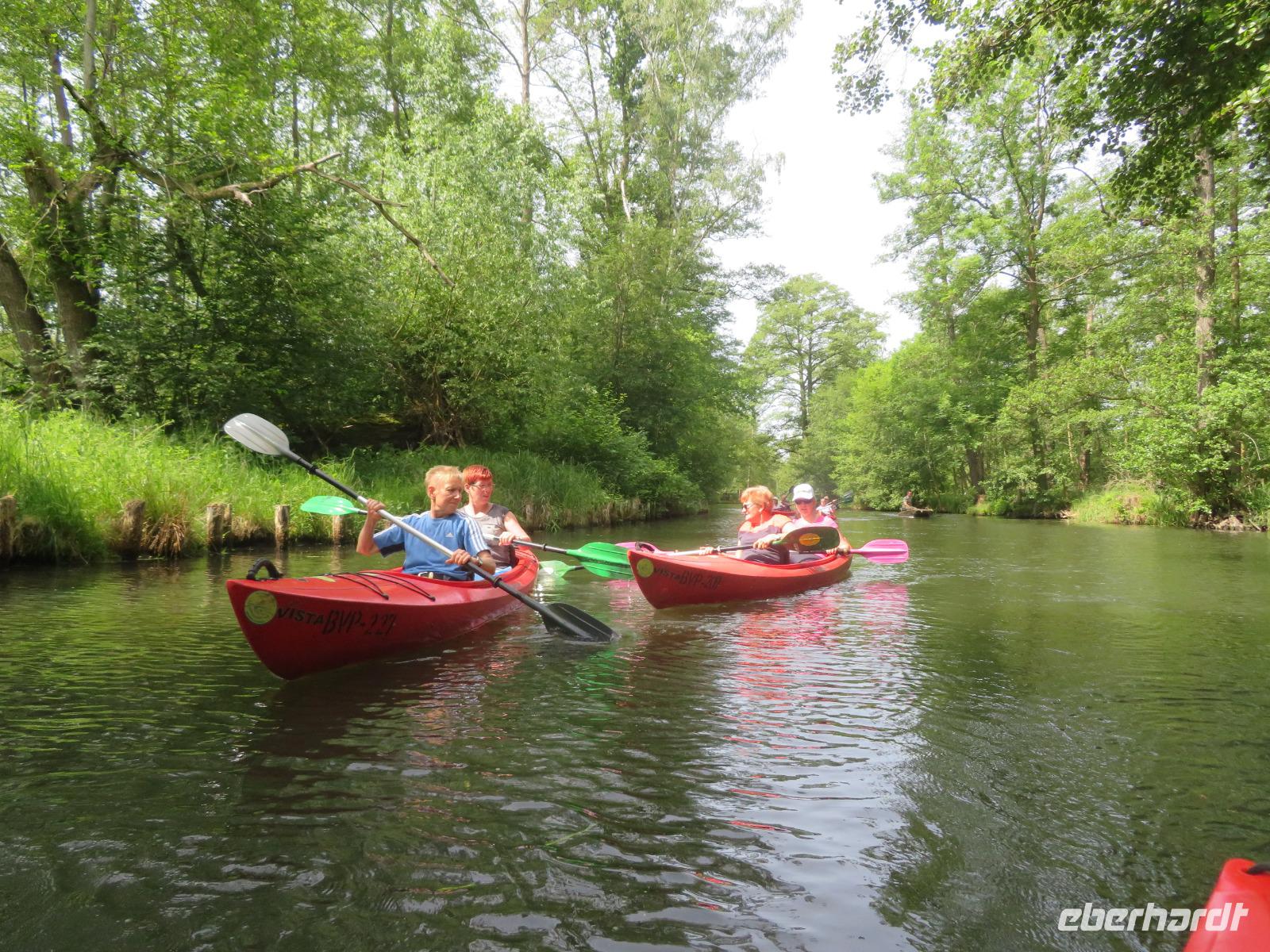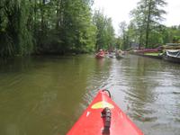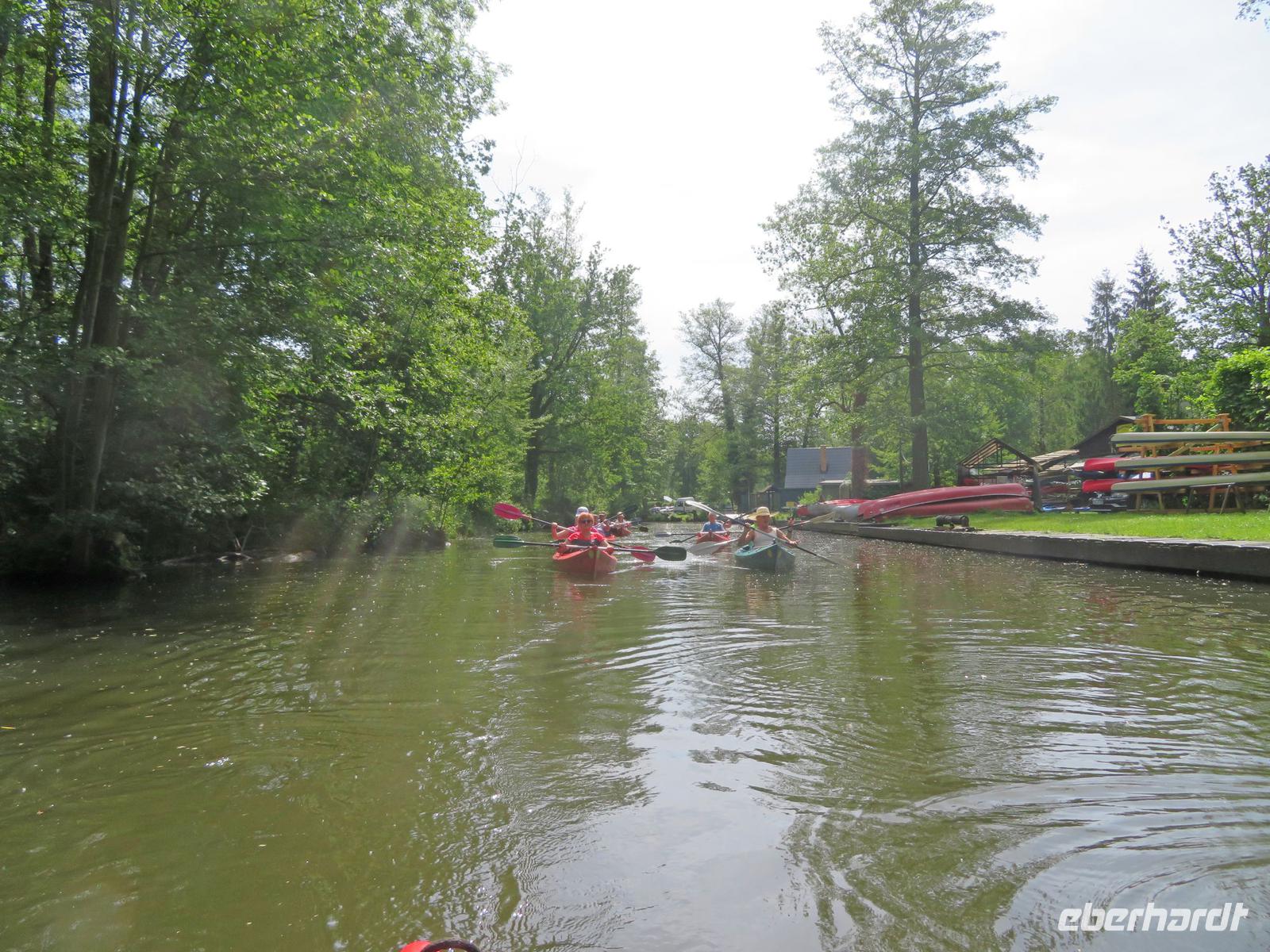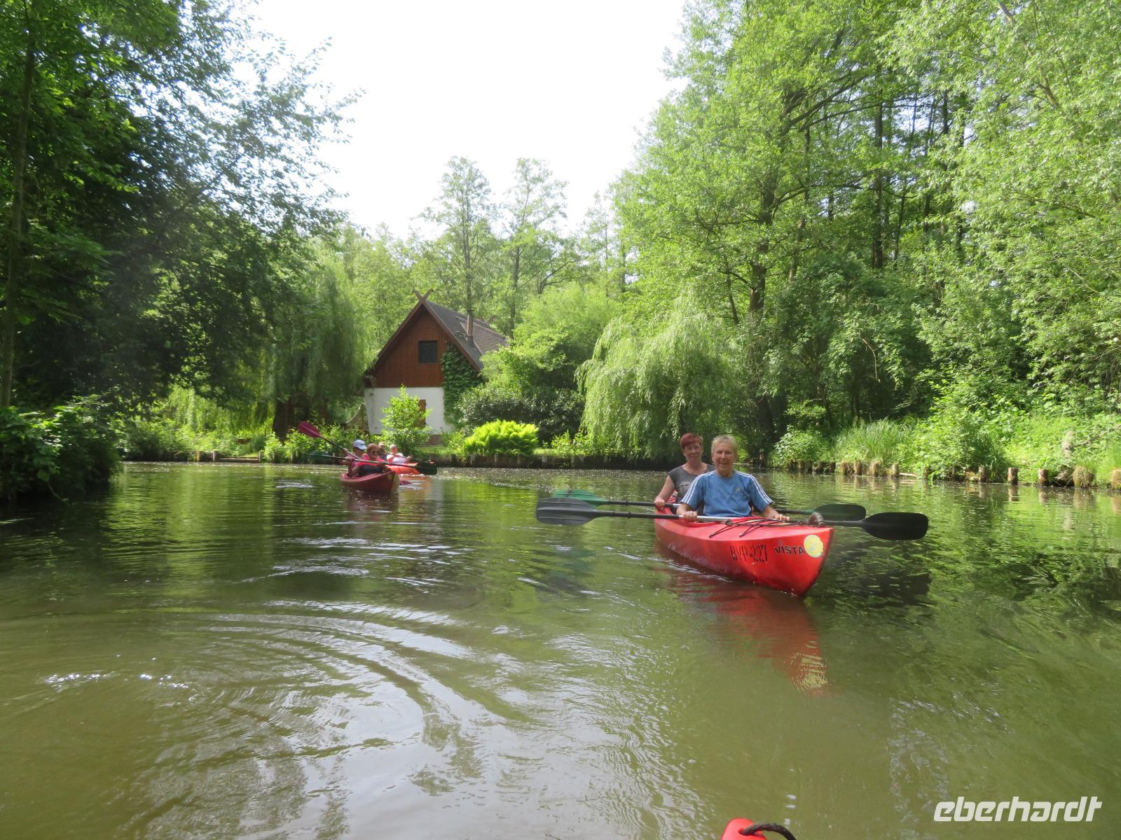 Nachdem unsere Kahnfahrer "eingecheckt" waren und Ihre Bootsfahrt beginnen konnten, spazierten die Paddler mit der Reisebegleiterin vom Großen Hafen durch den Schlosspark bis zum Bootsverleih. Hier wurden wir mit Paddel, Kartenmaterial und 2-Personen-Kajaks ausgestattet. Wer mit wem paddelte, war schnell gefunden und es hatten sich sechs Zweierteams gebildet. Nach einer kleinen Einweisung ins Paddel halten und Steuern ging es los. Eine etwa 12 Kilometer lange Paddeltour lag vor uns, für die wir uns ebenfalls 4,5 Stunden Zeit lassen konnten. Auch die Paddelgruppe machte Mittagsrast in der Ausflugsgaststätte Wotschofska, wo wir unsere Kahnfahrer trafen. Bei typisch Spreewälder Gerichten und Kaffee, Eis oder kühlen Getränken ruhten wir uns ein wenig aus, bevor uns die Bootstouren weiter durch die romantischen Kanäle und schattigen Alleen des Spreewaldes führten. Dabei konnten wir die Ruhe und die sattgrüne Natur so richtig genießen und noch einmal aktiv entspannen.