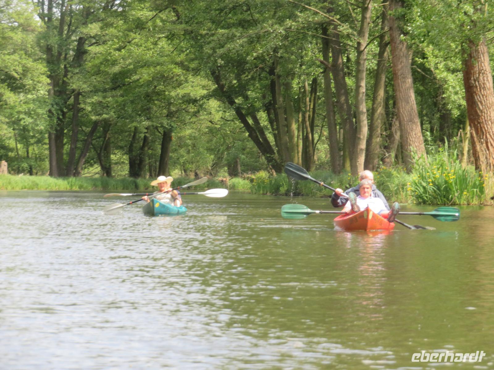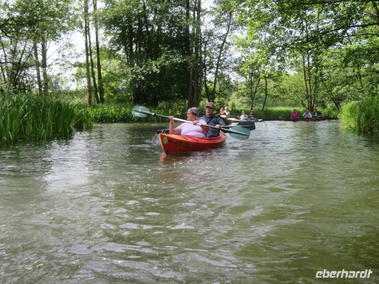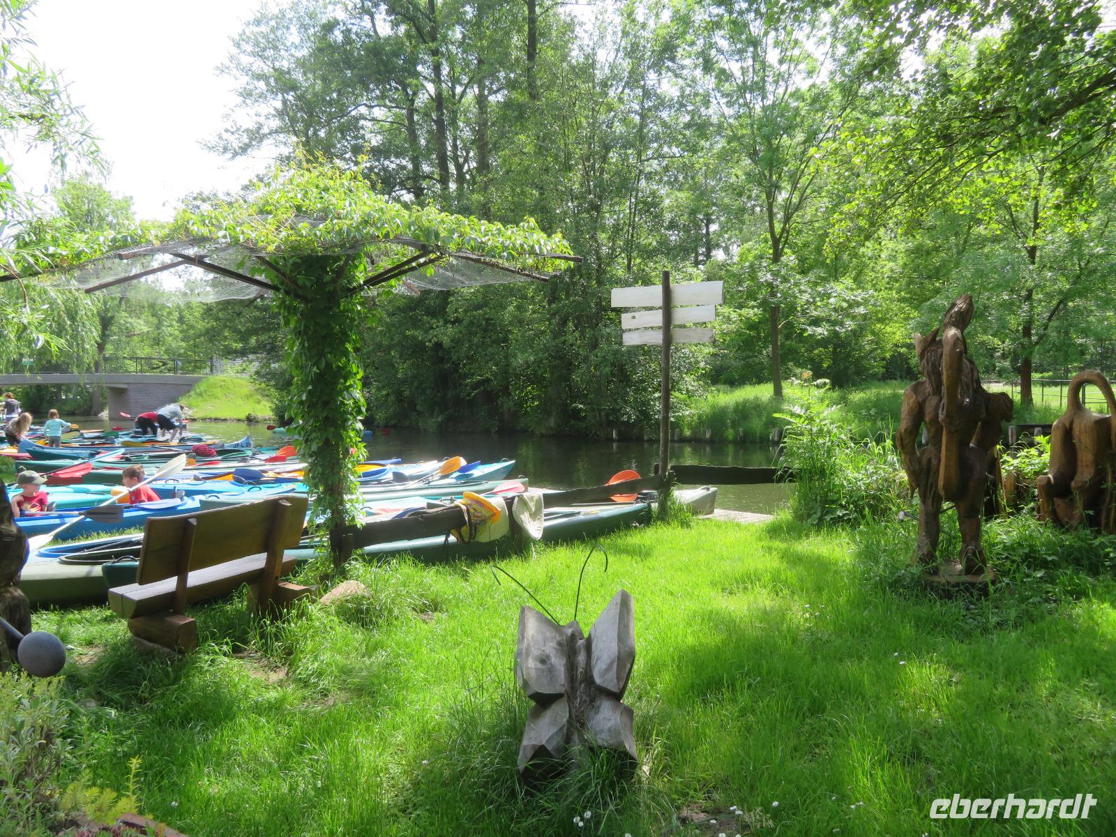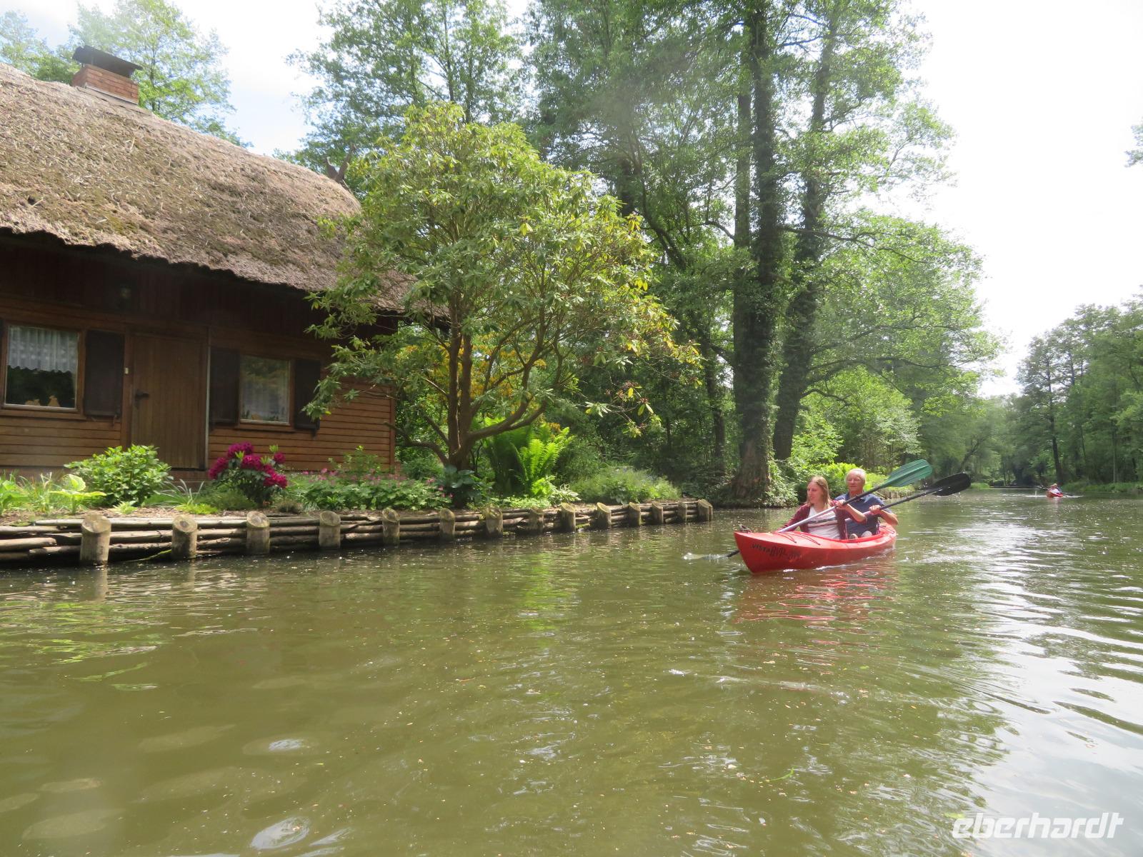 Nachdem unsere Kahnfahrer "eingecheckt" waren und Ihre Bootsfahrt beginnen konnten, spazierten die Paddler mit der Reisebegleiterin vom Großen Hafen durch den Schlosspark bis zum Bootsverleih. Hier wurden wir mit Paddel, Kartenmaterial und 2-Personen-Kajaks ausgestattet. Wer mit wem paddelte, war schnell gefunden und es hatten sich sechs Zweierteams gebildet. Nach einer kleinen Einweisung ins Paddel halten und Steuern ging es los. Eine etwa 12 Kilometer lange Paddeltour lag vor uns, für die wir uns ebenfalls 4,5 Stunden Zeit lassen konnten. Auch die Paddelgruppe machte Mittagsrast in der Ausflugsgaststätte Wotschofska, wo wir unsere Kahnfahrer trafen. Bei typisch Spreewälder Gerichten und Kaffee, Eis oder kühlen Getränken ruhten wir uns ein wenig aus, bevor uns die Bootstouren weiter durch die romantischen Kanäle und schattigen Alleen des Spreewaldes führten. Dabei konnten wir die Ruhe und die sattgrüne Natur so richtig genießen und noch einmal aktiv entspannen.