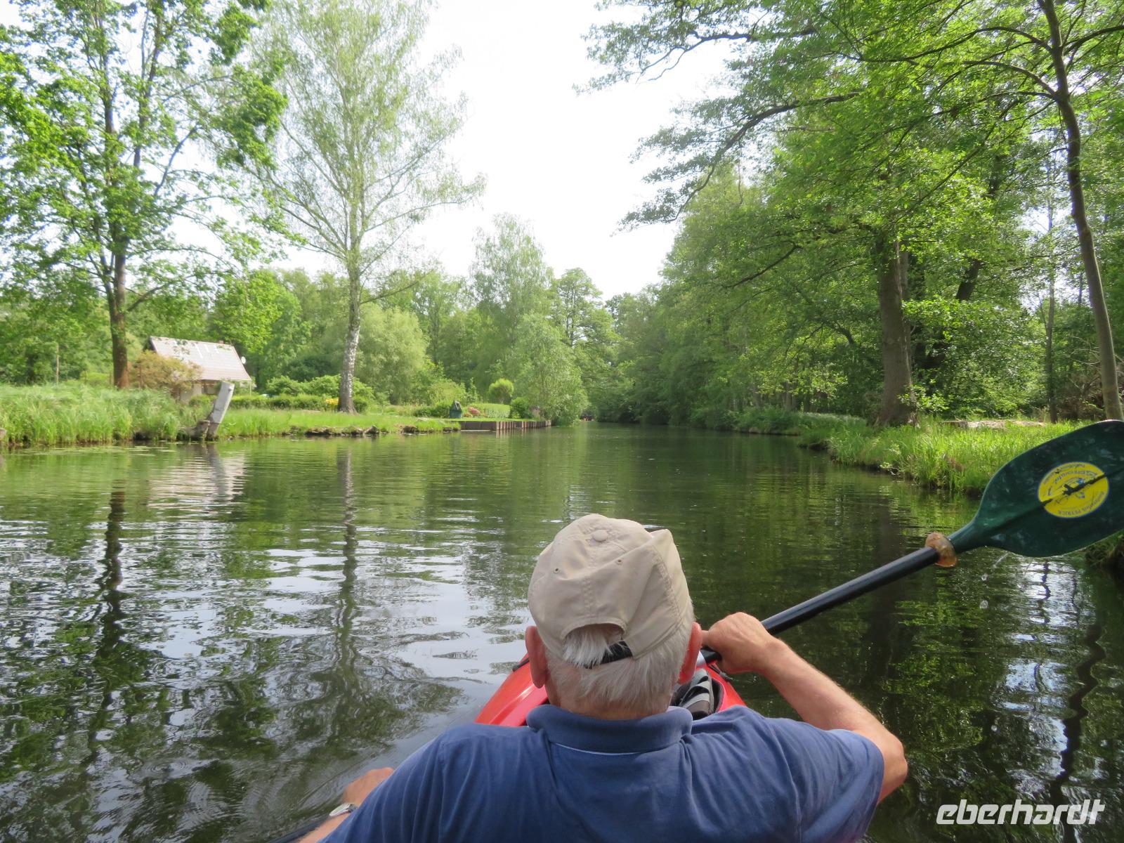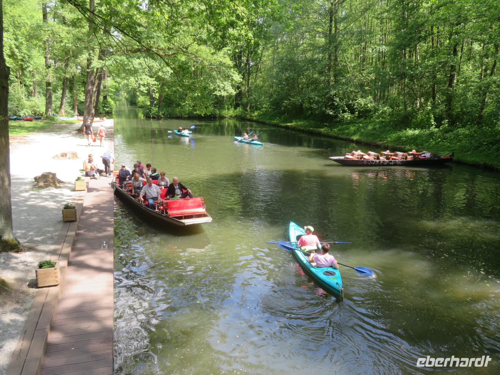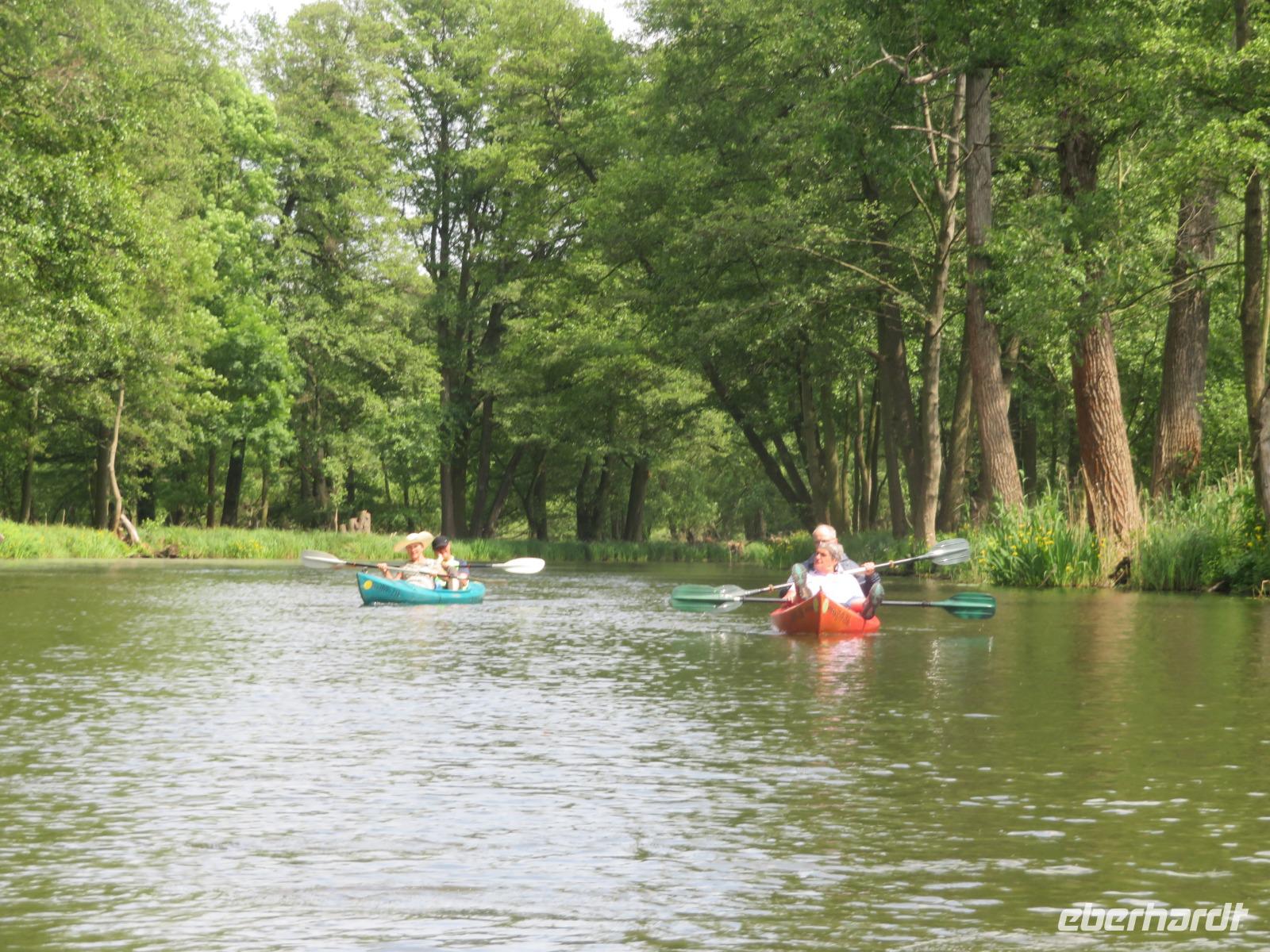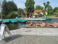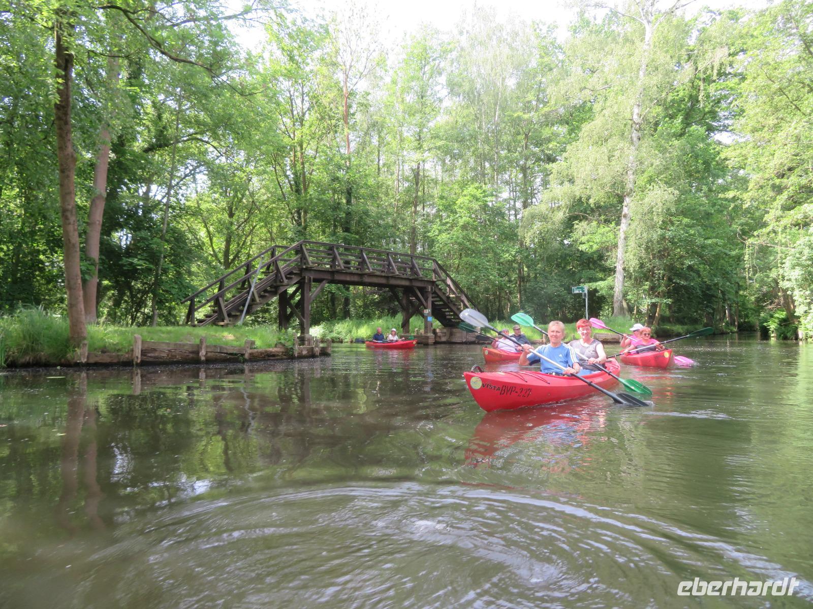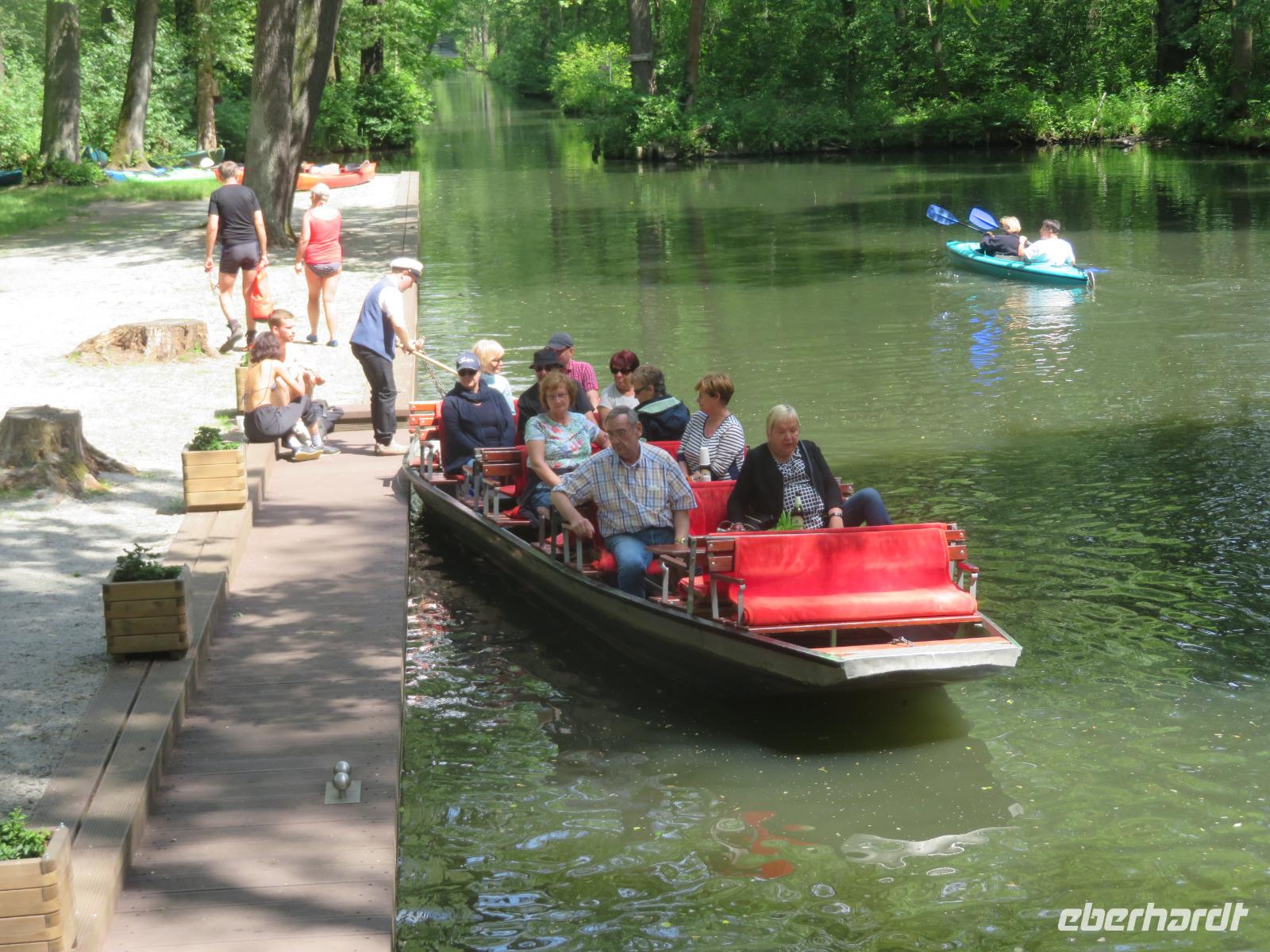 Nachdem unsere Kahnfahrer "eingecheckt" waren und Ihre Bootsfahrt beginnen konnten, spazierten die Paddler mit der Reisebegleiterin vom Großen Hafen durch den Schlosspark bis zum Bootsverleih. Hier wurden wir mit Paddel, Kartenmaterial und 2-Personen-Kajaks ausgestattet. Wer mit wem paddelte, war schnell gefunden und es hatten sich sechs Zweierteams gebildet. Nach einer kleinen Einweisung ins Paddel halten und Steuern ging es los. Eine etwa 12 Kilometer lange Paddeltour lag vor uns, für die wir uns ebenfalls 4,5 Stunden Zeit lassen konnten. Auch die Paddelgruppe machte Mittagsrast in der Ausflugsgaststätte Wotschofska, wo wir unsere Kahnfahrer trafen. Bei typisch Spreewälder Gerichten und Kaffee, Eis oder kühlen Getränken ruhten wir uns ein wenig aus, bevor uns die Bootstouren weiter durch die romantischen Kanäle und schattigen Alleen des Spreewaldes führten. Dabei konnten wir die Ruhe und die sattgrüne Natur so richtig genießen und noch einmal aktiv entspannen.