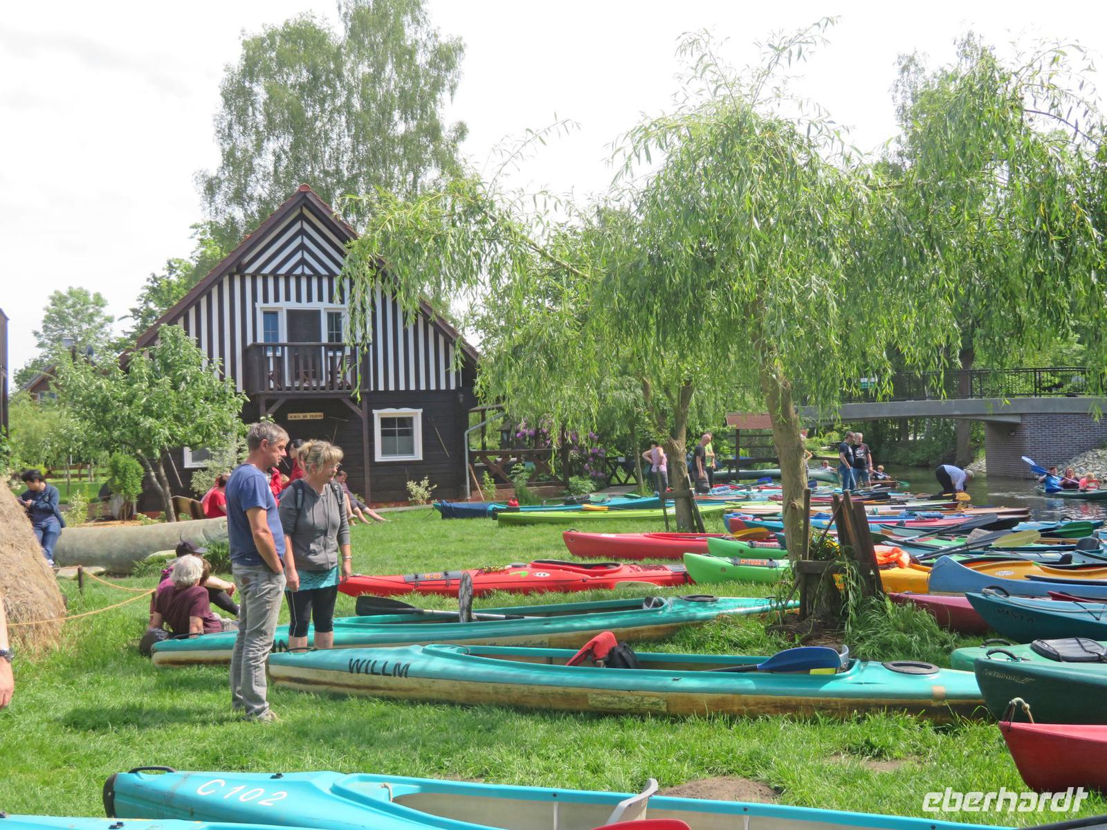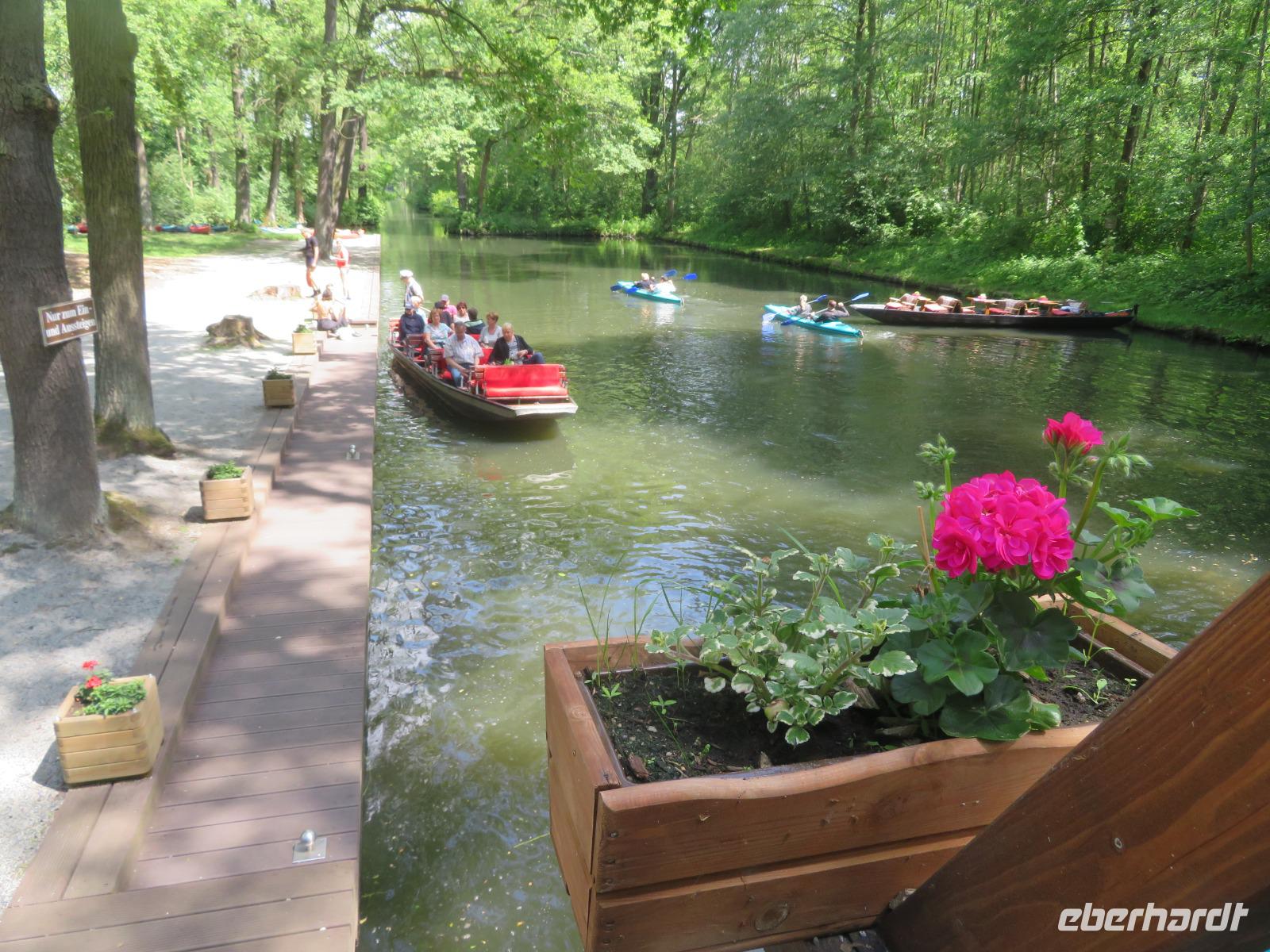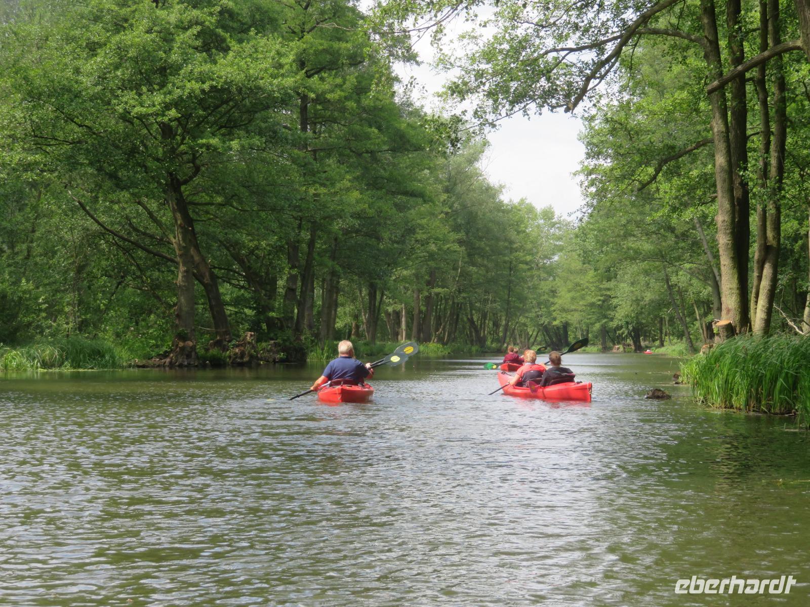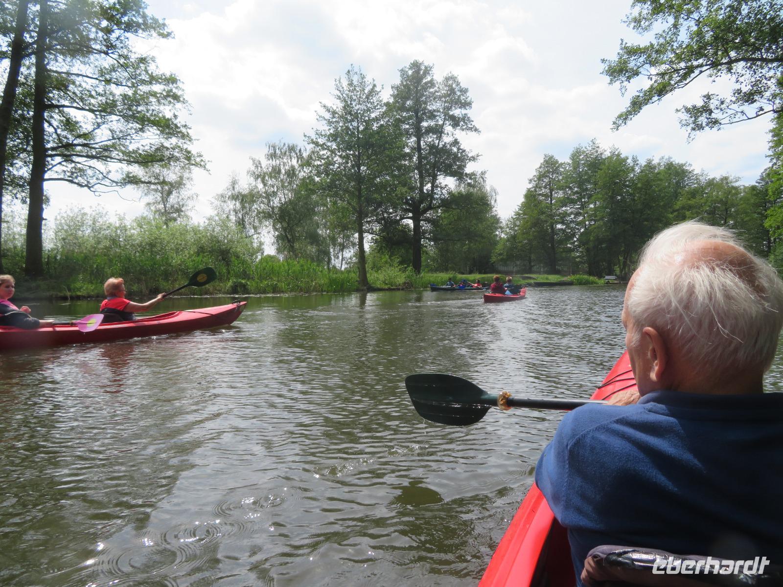 Nachdem unsere Kahnfahrer "eingecheckt" waren und Ihre Bootsfahrt beginnen konnten, spazierten die Paddler mit der Reisebegleiterin vom Großen Hafen durch den Schlosspark bis zum Bootsverleih. Hier wurden wir mit Paddel, Kartenmaterial und 2-Personen-Kajaks ausgestattet. Wer mit wem paddelte, war schnell gefunden und es hatten sich sechs Zweierteams gebildet. Nach einer kleinen Einweisung ins Paddel halten und Steuern ging es los. Eine etwa 12 Kilometer lange Paddeltour lag vor uns, für die wir uns ebenfalls 4,5 Stunden Zeit lassen konnten. Auch die Paddelgruppe machte Mittagsrast in der Ausflugsgaststätte Wotschofska, wo wir unsere Kahnfahrer trafen. Bei typisch Spreewälder Gerichten und Kaffee, Eis oder kühlen Getränken ruhten wir uns ein wenig aus, bevor uns die Bootstouren weiter durch die romantischen Kanäle und schattigen Alleen des Spreewaldes führten. Dabei konnten wir die Ruhe und die sattgrüne Natur so richtig genießen und noch einmal aktiv entspannen.