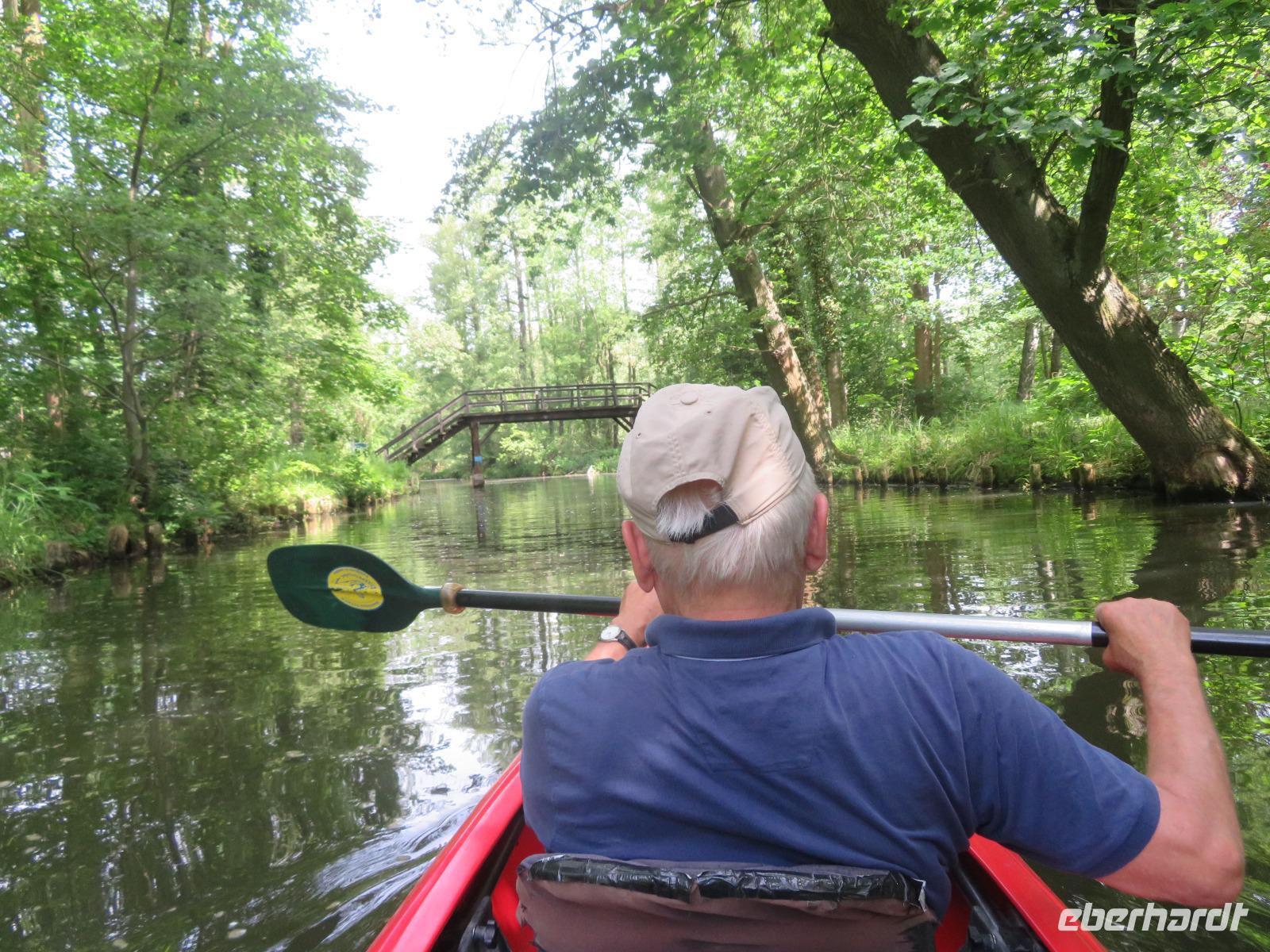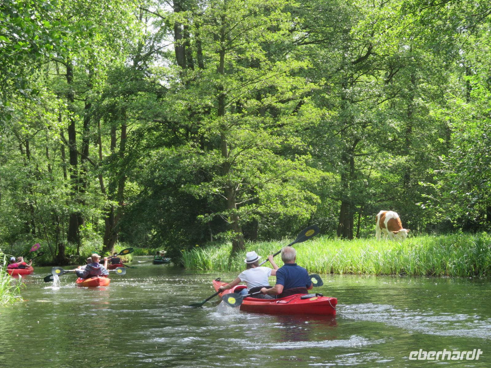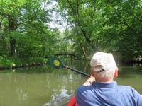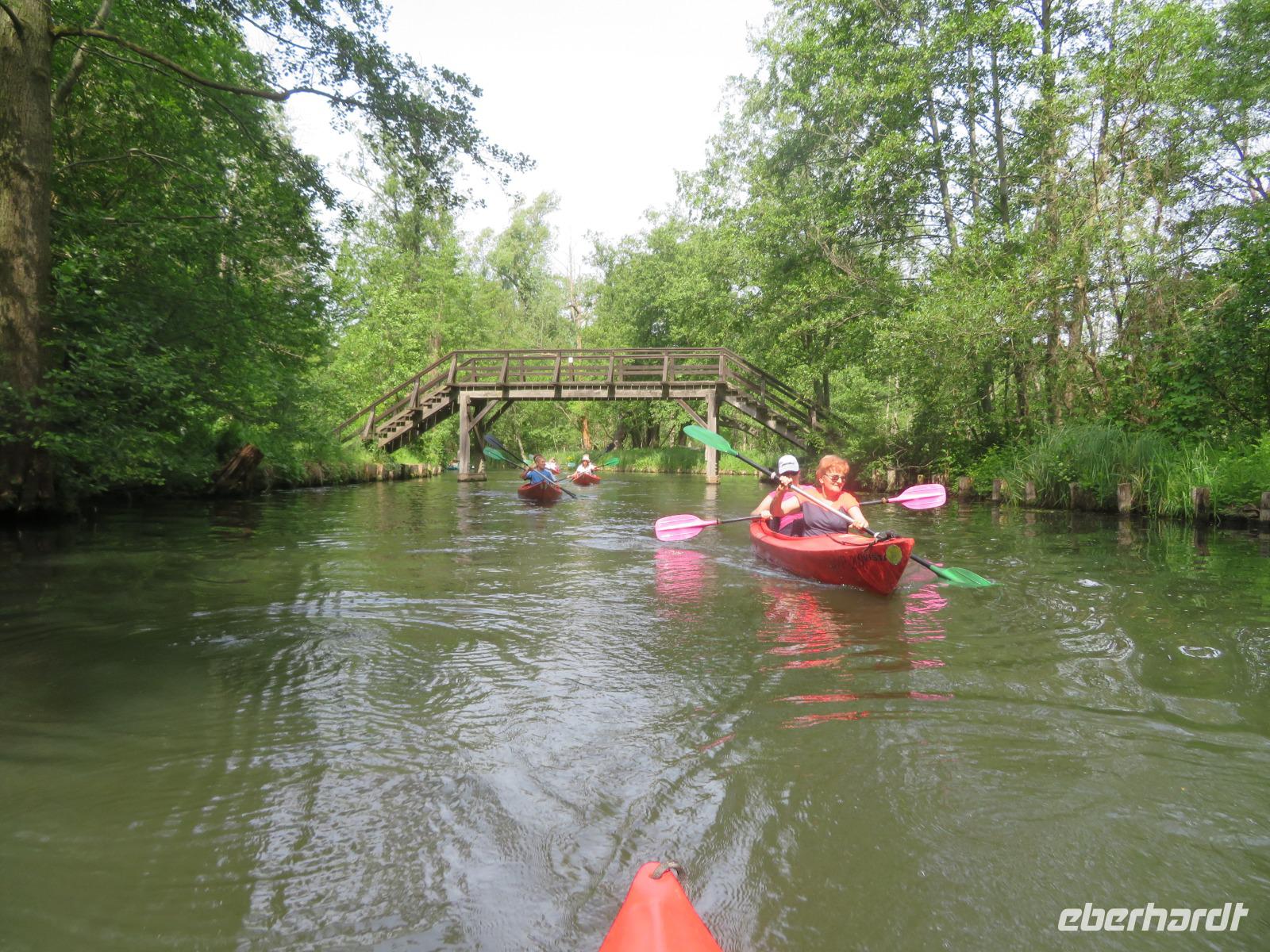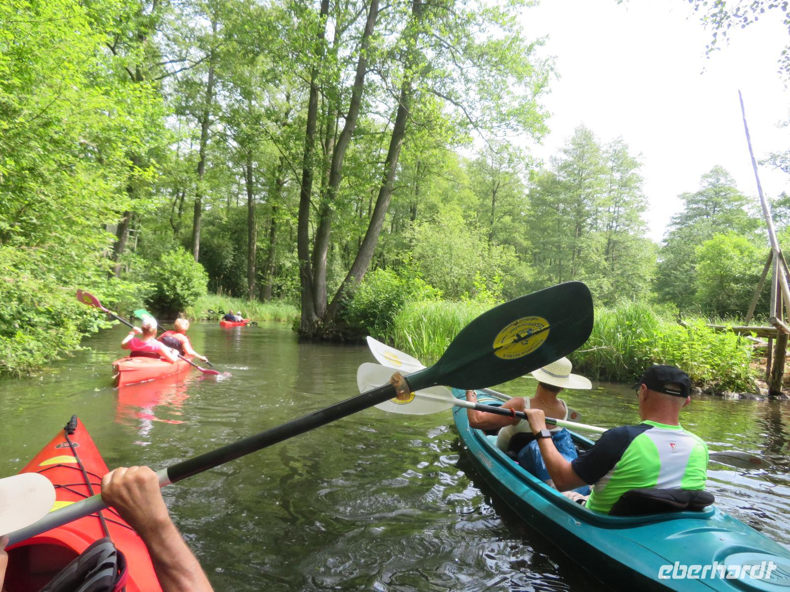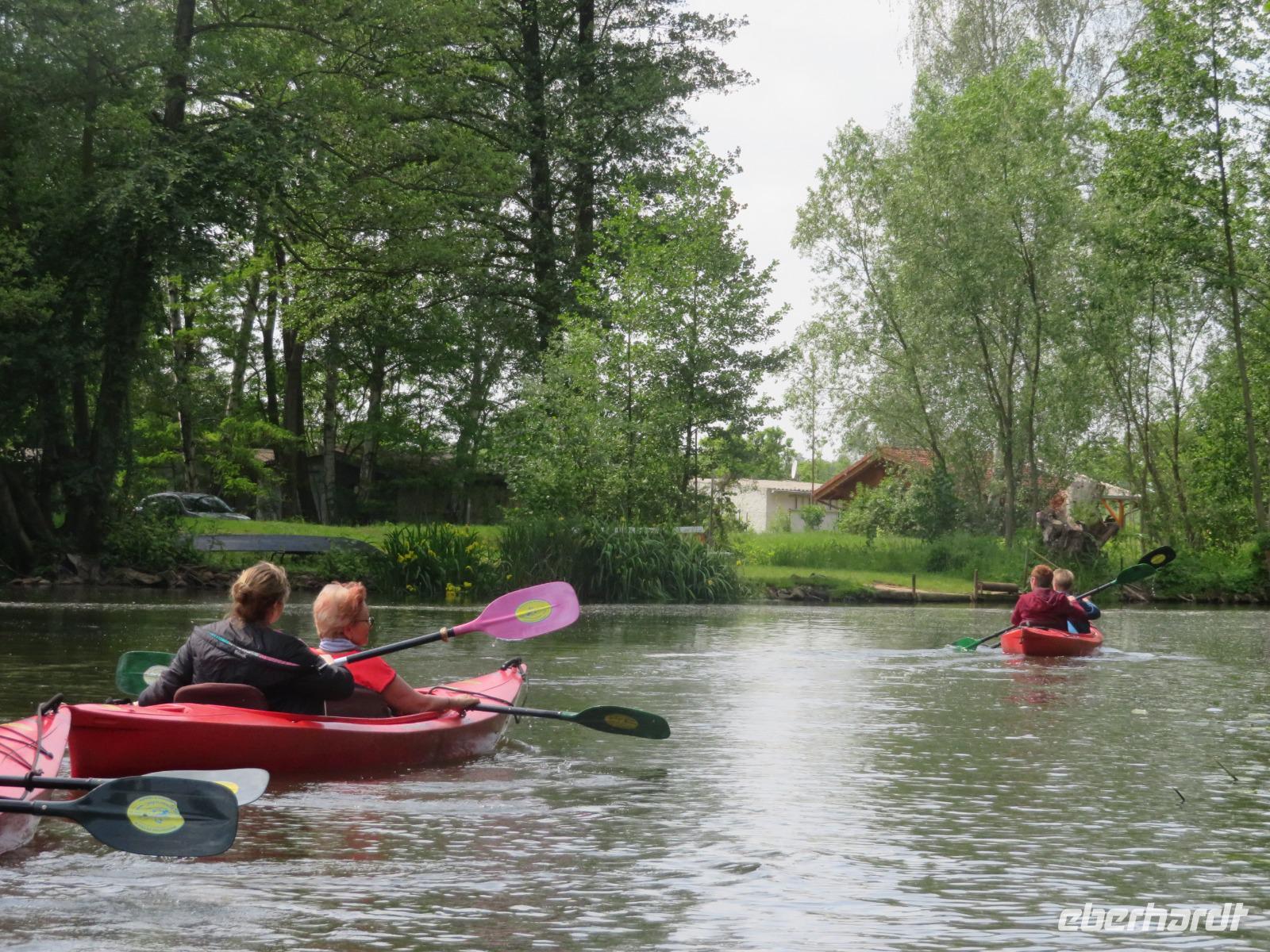 Nachdem unsere Kahnfahrer "eingecheckt" waren und Ihre Bootsfahrt beginnen konnten, spazierten die Paddler mit der Reisebegleiterin vom Großen Hafen durch den Schlosspark bis zum Bootsverleih. Hier wurden wir mit Paddel, Kartenmaterial und 2-Personen-Kajaks ausgestattet. Wer mit wem paddelte, war schnell gefunden und es hatten sich sechs Zweierteams gebildet. Nach einer kleinen Einweisung ins Paddel halten und Steuern ging es los. Eine etwa 12 Kilometer lange Paddeltour lag vor uns, für die wir uns ebenfalls 4,5 Stunden Zeit lassen konnten. Auch die Paddelgruppe machte Mittagsrast in der Ausflugsgaststätte Wotschofska, wo wir unsere Kahnfahrer trafen. Bei typisch Spreewälder Gerichten und Kaffee, Eis oder kühlen Getränken ruhten wir uns ein wenig aus, bevor uns die Bootstouren weiter durch die romantischen Kanäle und schattigen Alleen des Spreewaldes führten. Dabei konnten wir die Ruhe und die sattgrüne Natur so richtig genießen und noch einmal aktiv entspannen.