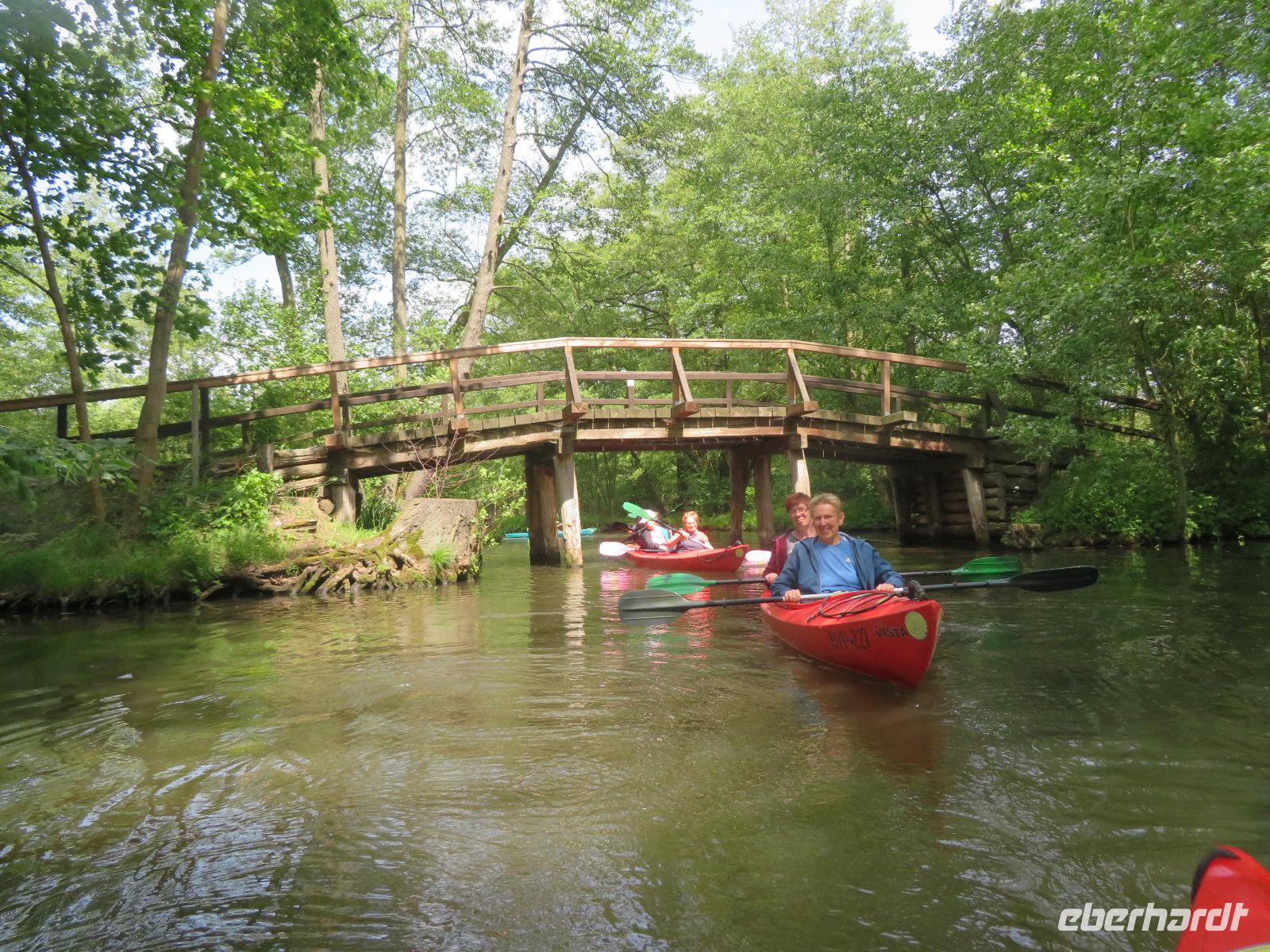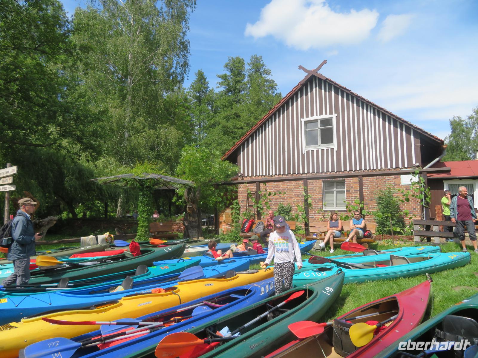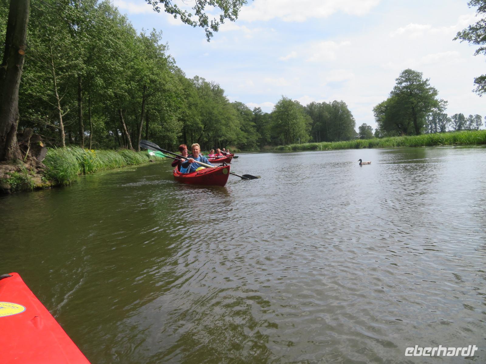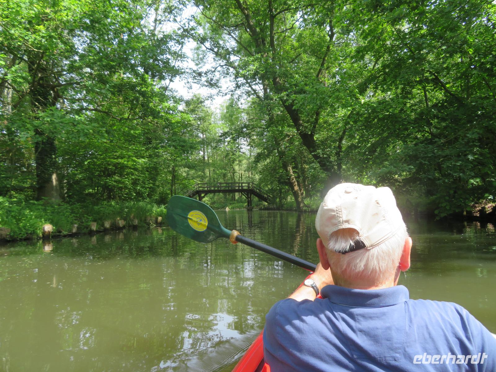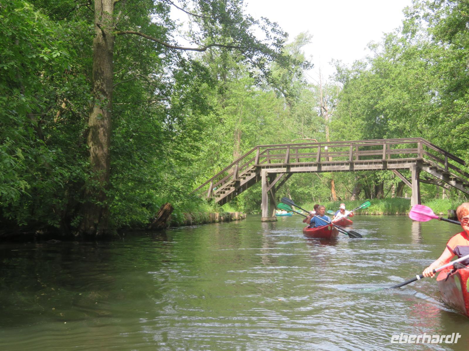Nachdem unsere Kahnfahrer "eingecheckt" waren und Ihre Bootsfahrt beginnen konnten, spazierten die Paddler mit der Reisebegleiterin vom Großen Hafen durch den Schlosspark bis zum Bootsverleih. Hier wurden wir mit Paddel, Kartenmaterial und 2-Personen-Kajaks ausgestattet. Wer mit wem paddelte, war schnell gefunden und es hatten sich sechs Zweierteams gebildet. Nach einer kleinen Einweisung ins Paddel halten und Steuern ging es los. Eine etwa 12 Kilometer lange Paddeltour lag vor uns, für die wir uns ebenfalls 4,5 Stunden Zeit lassen konnten. Auch die Paddelgruppe machte Mittagsrast in der Ausflugsgaststätte Wotschofska, wo wir unsere Kahnfahrer trafen. Bei typisch Spreewälder Gerichten und Kaffee, Eis oder kühlen Getränken ruhten wir uns ein wenig aus, bevor uns die Bootstouren weiter durch die romantischen Kanäle und schattigen Alleen des Spreewaldes führten. Dabei konnten wir die Ruhe und die sattgrüne Natur so richtig genießen und noch einmal aktiv entspannen.