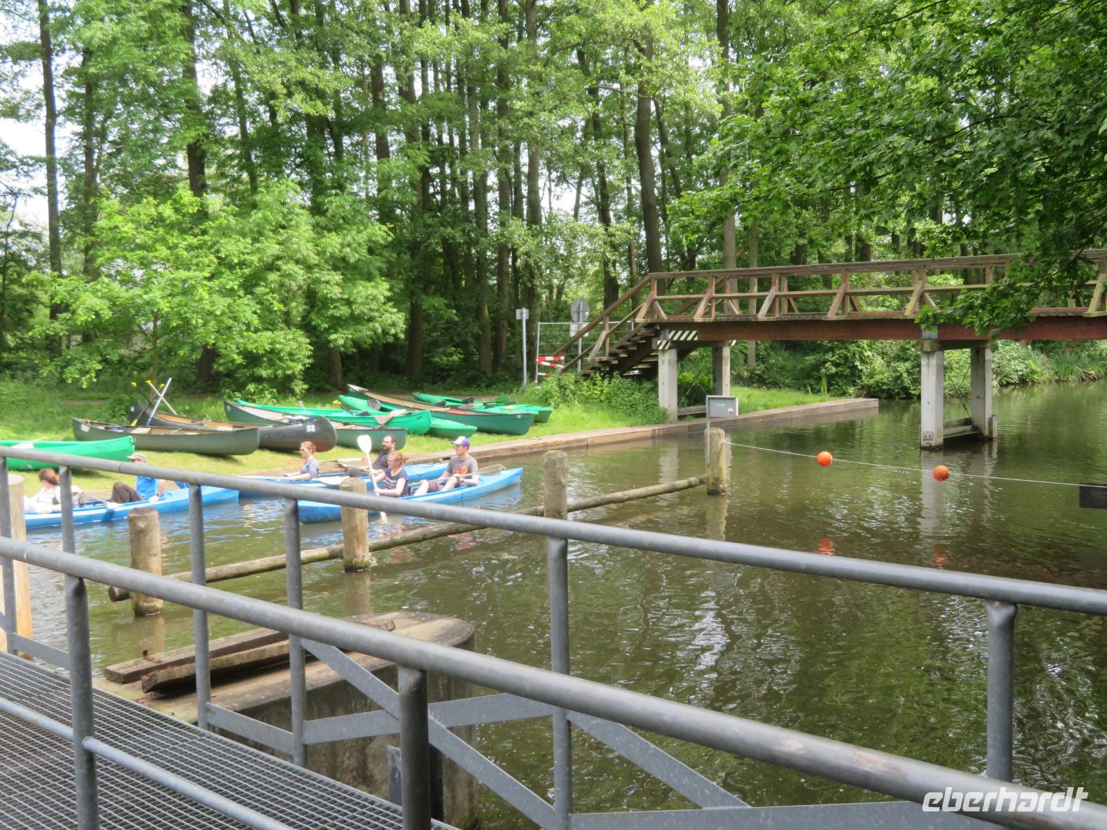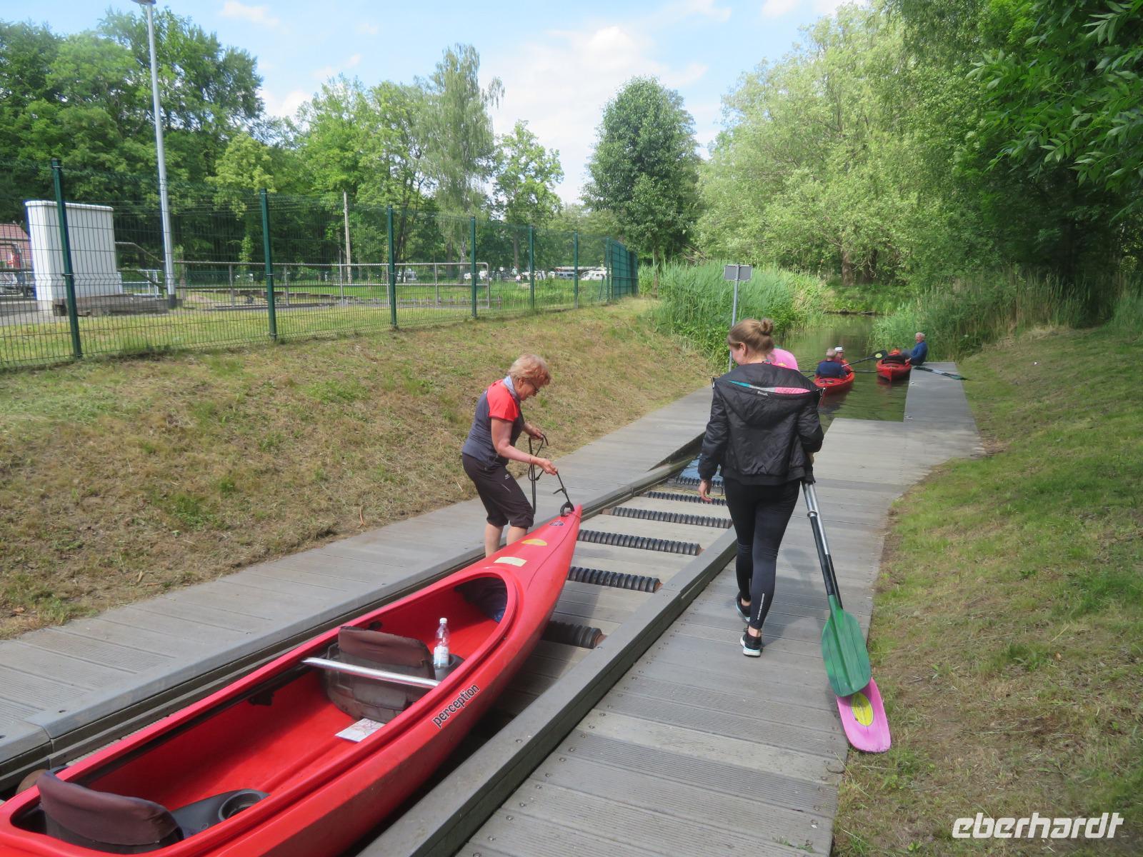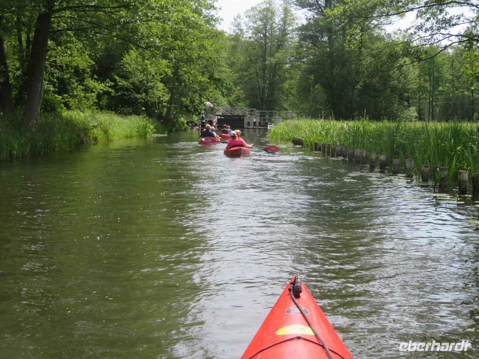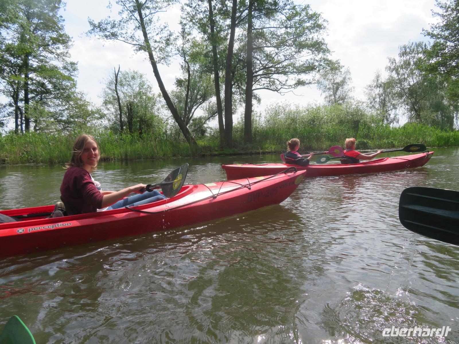 Nachdem unsere Kahnfahrer "eingecheckt" waren und Ihre Bootsfahrt beginnen konnten, spazierten die Paddler mit der Reisebegleiterin vom Großen Hafen durch den Schlosspark bis zum Bootsverleih. Hier wurden wir mit Paddel, Kartenmaterial und 2-Personen-Kajaks ausgestattet. Wer mit wem paddelte, war schnell gefunden und es hatten sich sechs Zweierteams gebildet. Nach einer kleinen Einweisung ins Paddel halten und Steuern ging es los. Eine etwa 12 Kilometer lange Paddeltour lag vor uns, für die wir uns ebenfalls 4,5 Stunden Zeit lassen konnten. Auch die Paddelgruppe machte Mittagsrast in der Ausflugsgaststätte Wotschofska, wo wir unsere Kahnfahrer trafen. Bei typisch Spreewälder Gerichten und Kaffee, Eis oder kühlen Getränken ruhten wir uns ein wenig aus, bevor uns die Bootstouren weiter durch die romantischen Kanäle und schattigen Alleen des Spreewaldes führten. Dabei konnten wir die Ruhe und die sattgrüne Natur so richtig genießen und noch einmal aktiv entspannen.