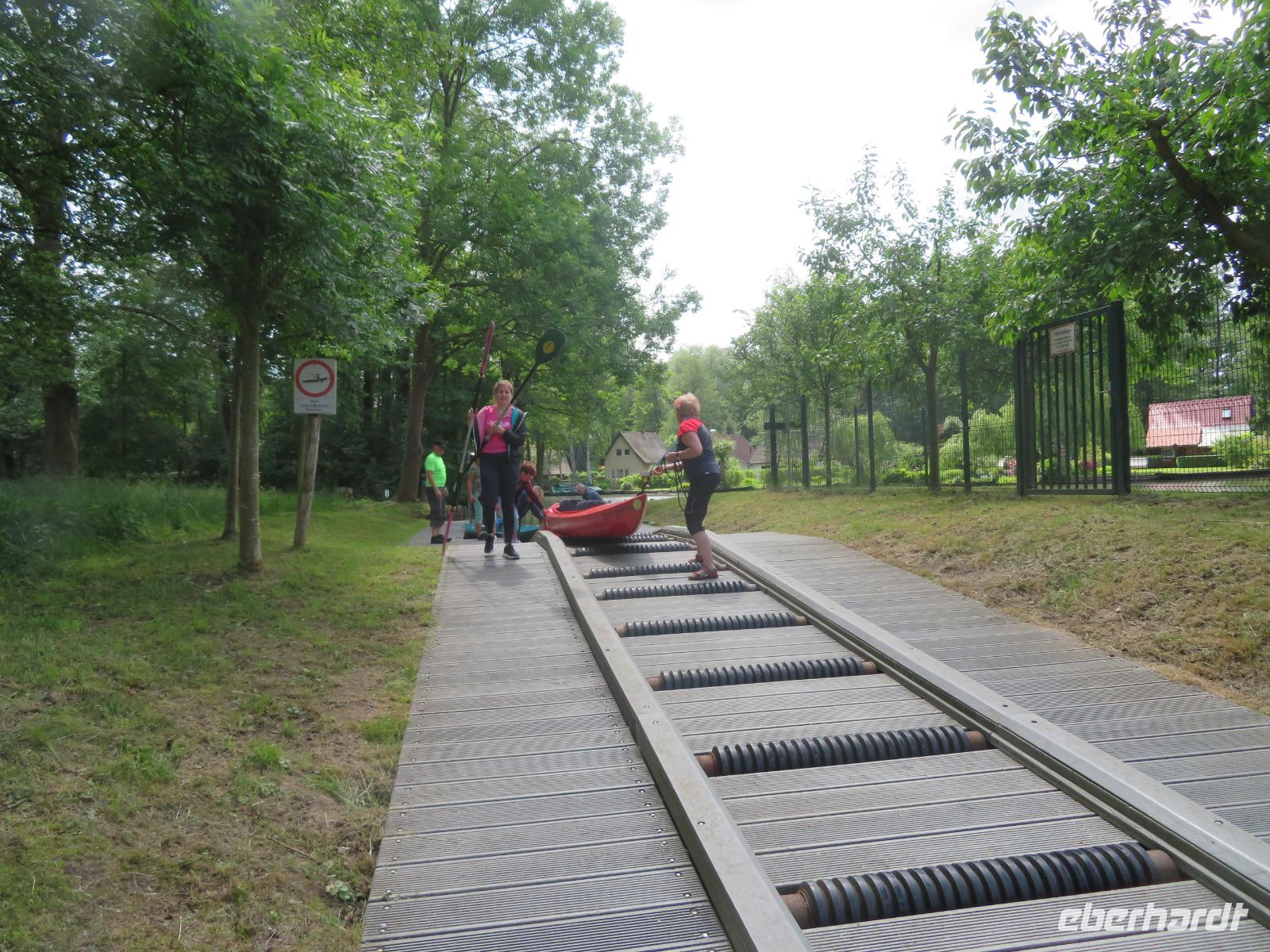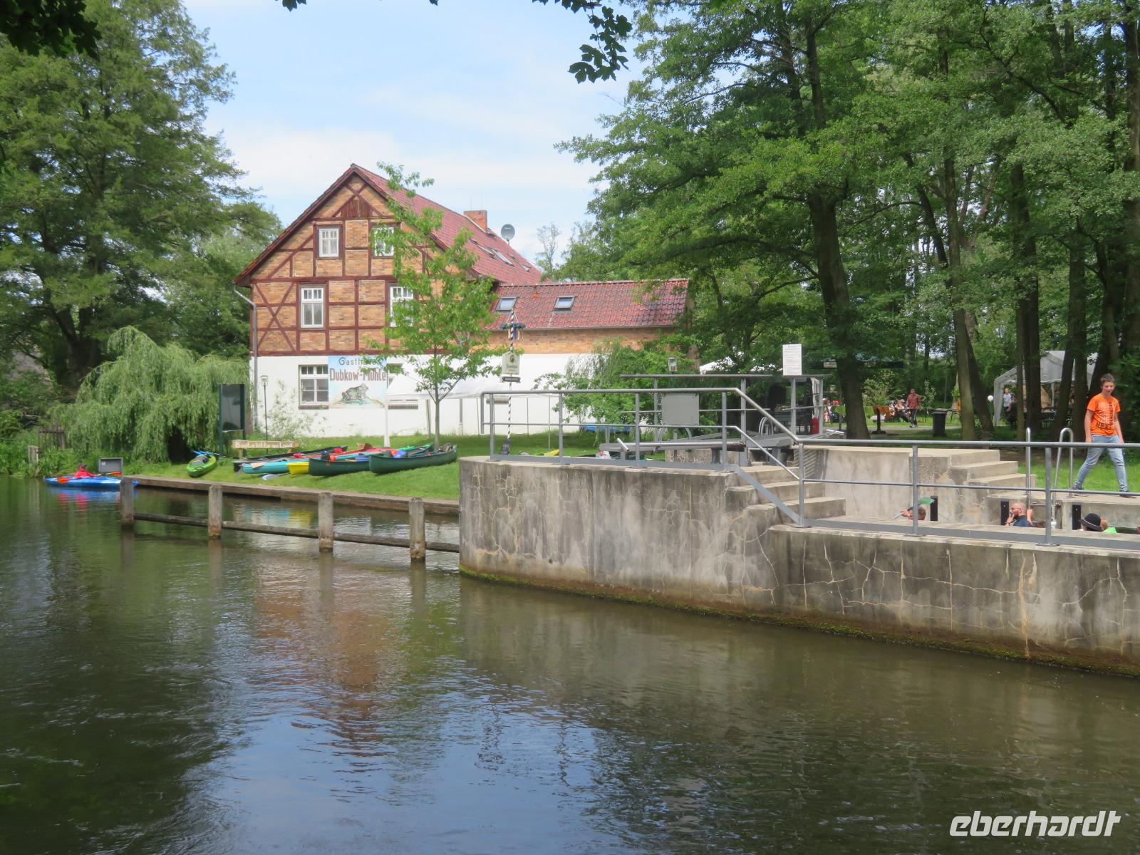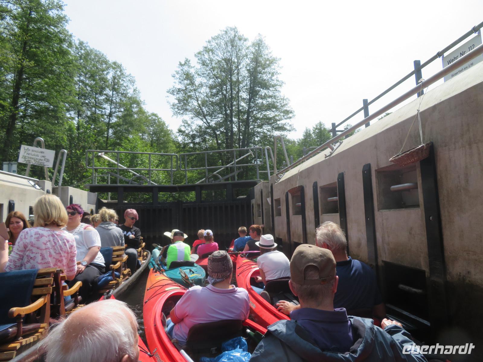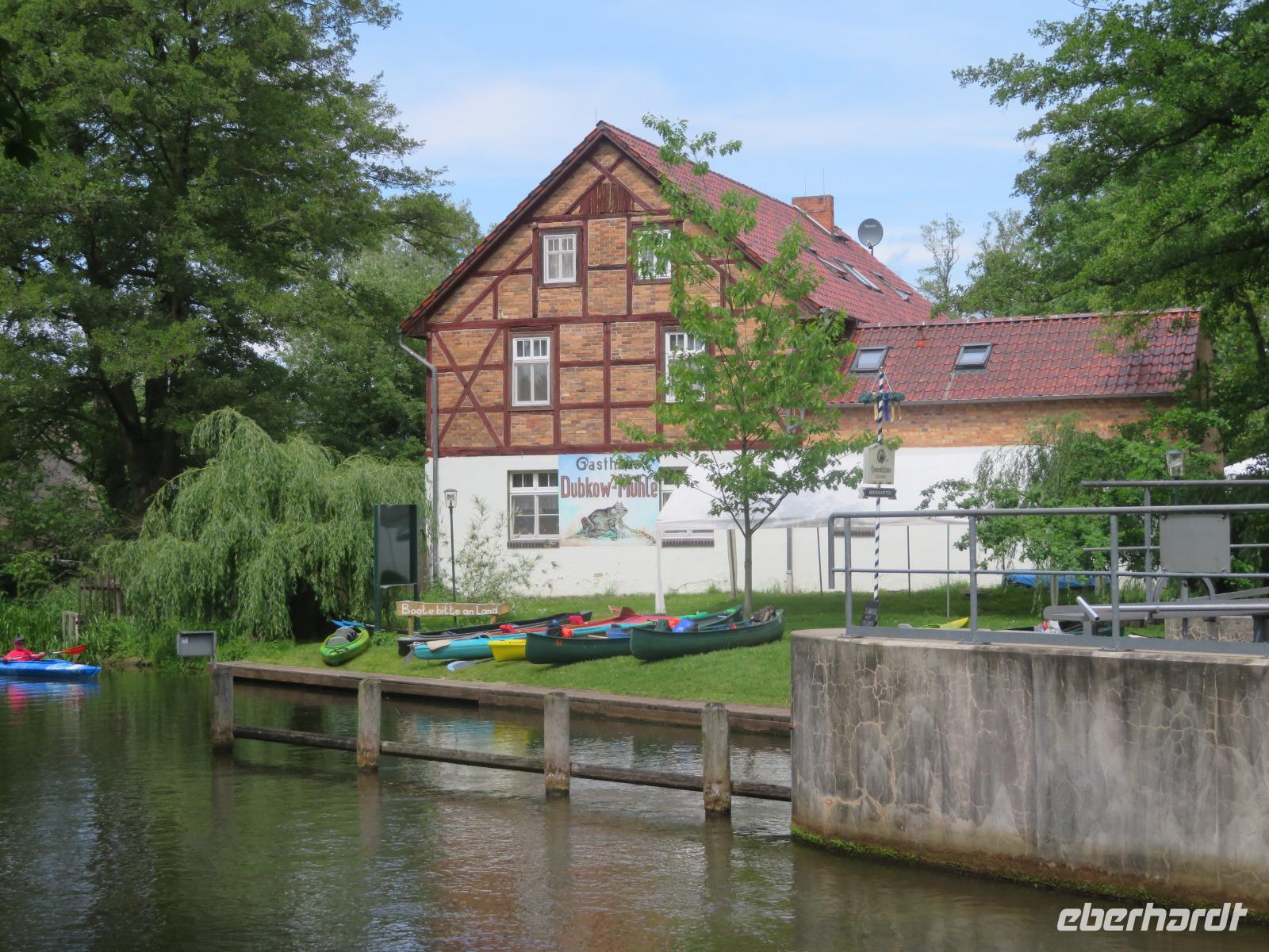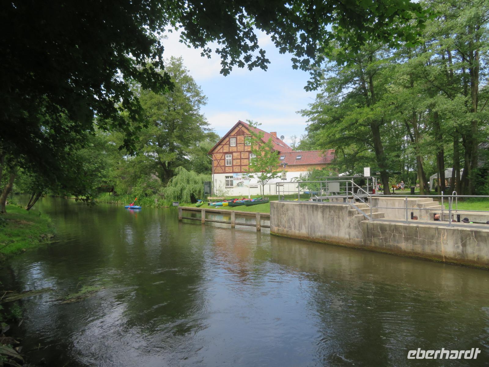 Nachdem unsere Kahnfahrer "eingecheckt" waren und Ihre Bootsfahrt beginnen konnten, spazierten die Paddler mit der Reisebegleiterin vom Großen Hafen durch den Schlosspark bis zum Bootsverleih. Hier wurden wir mit Paddel, Kartenmaterial und 2-Personen-Kajaks ausgestattet. Wer mit wem paddelte, war schnell gefunden und es hatten sich sechs Zweierteams gebildet. Nach einer kleinen Einweisung ins Paddel halten und Steuern ging es los. Eine etwa 12 Kilometer lange Paddeltour lag vor uns, für die wir uns ebenfalls 4,5 Stunden Zeit lassen konnten. Auch die Paddelgruppe machte Mittagsrast in der Ausflugsgaststätte Wotschofska, wo wir unsere Kahnfahrer trafen. Bei typisch Spreewälder Gerichten und Kaffee, Eis oder kühlen Getränken ruhten wir uns ein wenig aus, bevor uns die Bootstouren weiter durch die romantischen Kanäle und schattigen Alleen des Spreewaldes führten. Dabei konnten wir die Ruhe und die sattgrüne Natur so richtig genießen und noch einmal aktiv entspannen.
