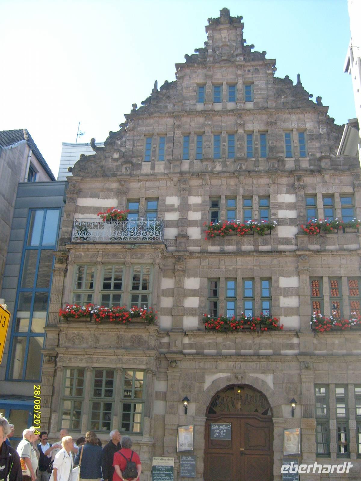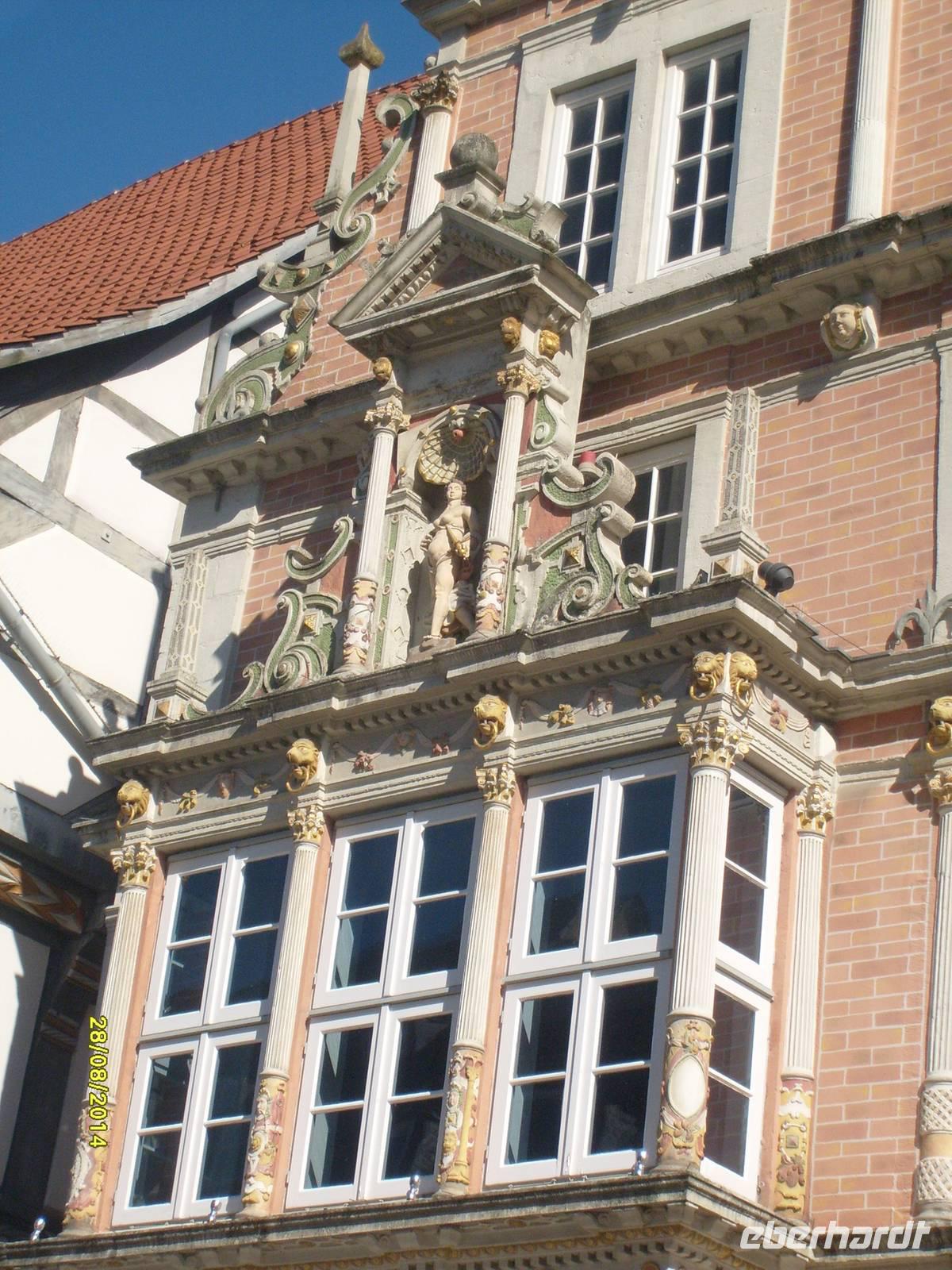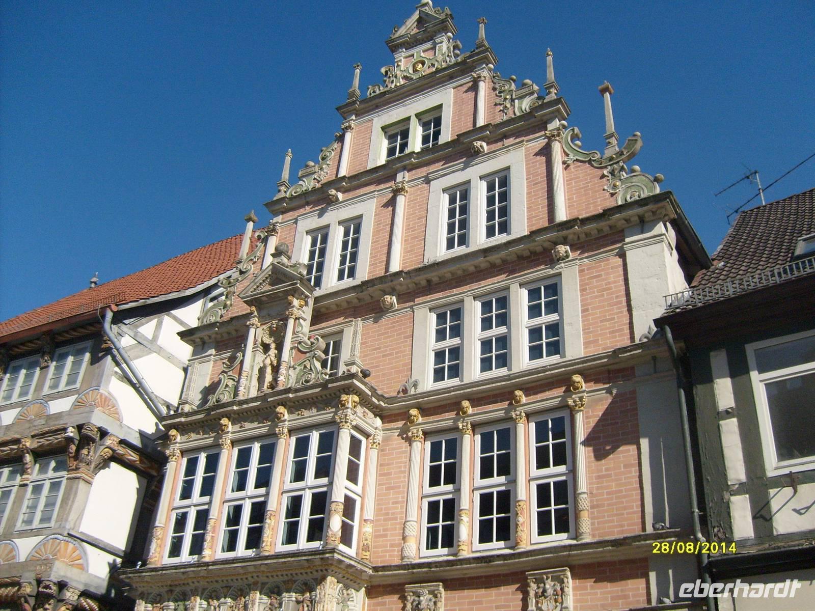Wir haben zwei Stadtführer, die uns durch die Stadt führen. Eine der Attraktionen ist das Rattenfängerhaus. Wir gehen entlang der Osterstraße über den Pferdemarkt zum Markt mit der Marktkirche St. Nicolai oder auch dem Hochzeitshaus. Es ist Hamelns schönstes und größtes Bauwerk im Stil der Weserrenaissance. 3 mal täglich öffnet sich die Bronzetür und das