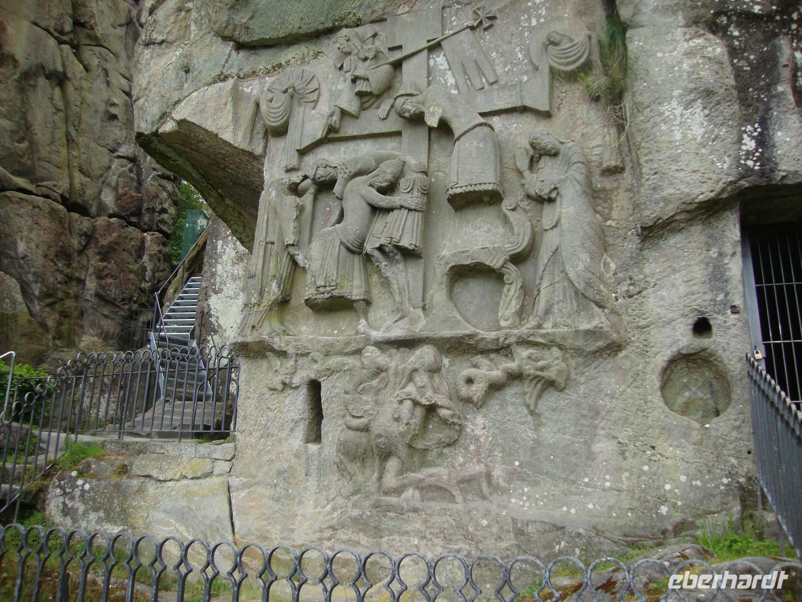 Auch das Frühstück im Hotel "Zur Burg Sternberg" war ausgezeichnet, alle Gäste fanden sehr lobende Worte. Bei leichtem Nieselregen waren das erste Ziel heute, die Externsteine. wir besuchten zuerst das Informationszentrum um anschaulich die Entstehung der Sandsteinformation zu erleben. Die 13 relativ frei stehenden Felsen stehen im Ruf geheimnisvoller Kräfte, das sie den Germanen als Kultstätte dienten ist allerdings nicht belegt. Menschenhand schuf am Fuß des äußeren Felsen links in den Stein gehauen, die Abnahme Jesu Christi vom Kreuz. Nach dem obligatorischen Gruppenfoto hatte, wer das wollte, die Möglichkeit die Felsen zu besteigen und die Aussicht über den Teutoburger Wald zu erleben. Am Busparkplatz hatte unser Chauffeur Jörg, einen vorzüglichen Extern - Imbiss mit Extern - Trunk zubereitet, den sich alle wohl schmecken liesen.