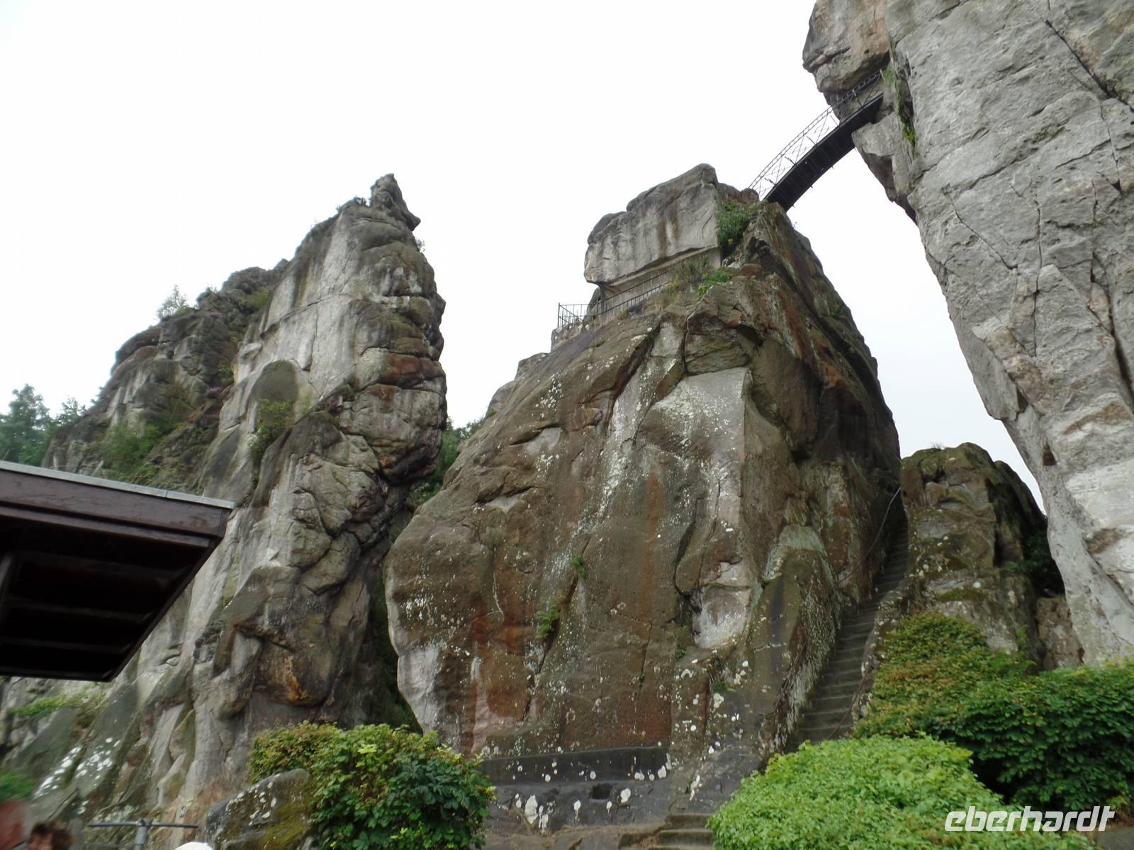 Die Felsen können über zwei in den Stein gearbeitete Treppenaufgänge erklommen werden. Ein Aufstieg, der sich lohnt! Denn aus ca. 40 m Höhe bietet sich, bei schönem Wetter, ein beeindruckender Ausblick in die abwechslungsreiche Landschaft des Teutoburger Waldes.