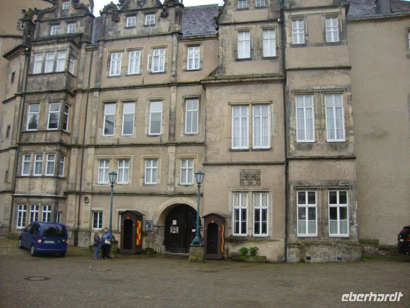 "Lippe - Detmold, eine wunderschöne Stadt..." besingt der Volksmund die ehemalige Residenz von Grafschaft (1528-1789) und Fürstentum Lippe (1789-1918), deren Wappen das Zeichen der Rose ist. Nach einem kleinen Stadtbummel über den Markt, auf dem der allwöchentliche Markttag stattfand, trafen wir uns um 14.00 Uhr am Residenzschloß, um an einer Führung teilzunehmen. Der Weserrenaissancebau aus dem 16.Jh. präsentiert neben Jagdwaffen und Porzellansammlungen barocke Gobelins, die um 1670 in Brüssel gewebt wurden und Szenen aus dem Leben Alexander des Großen (365-323 v.Chr.) zeigen.
